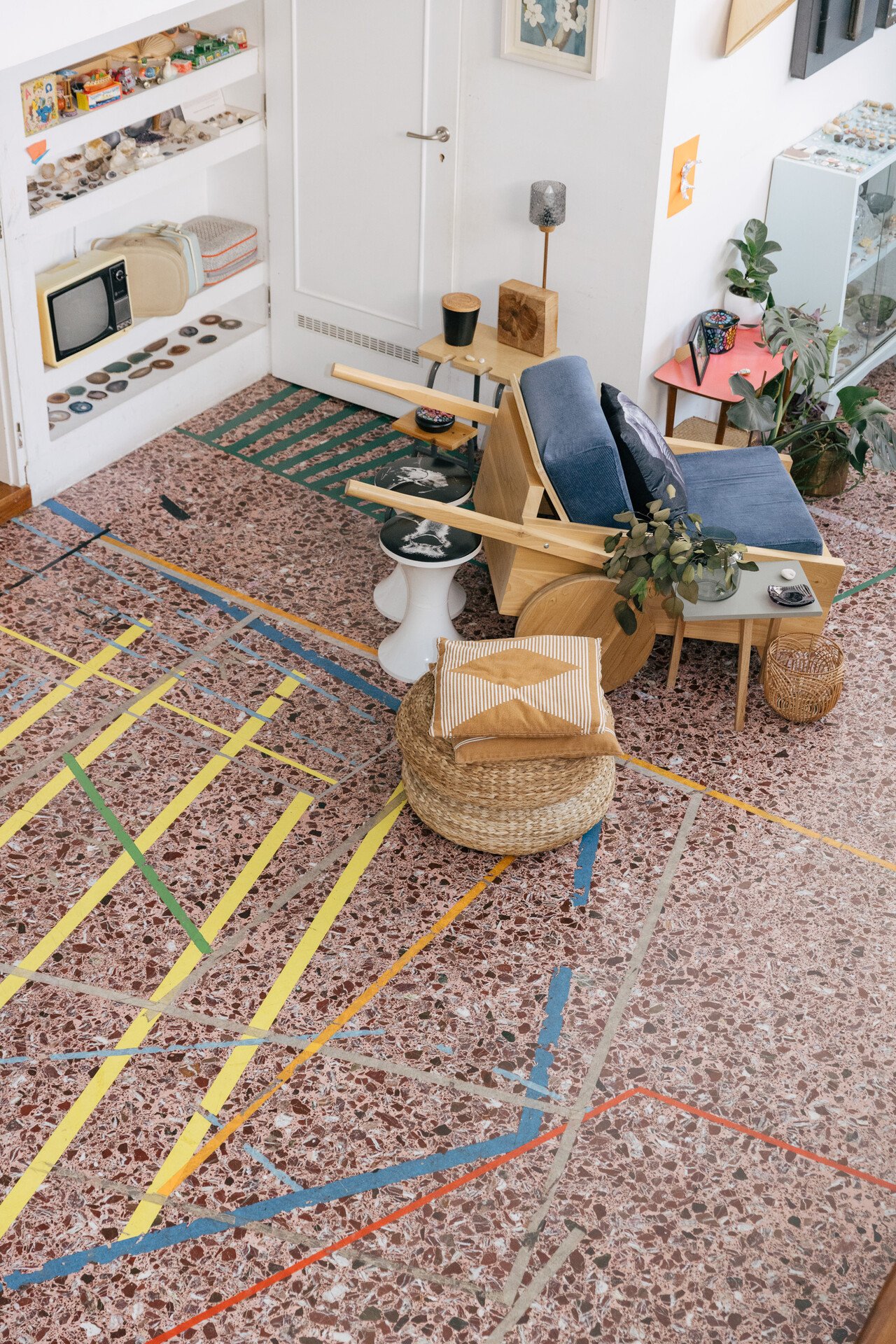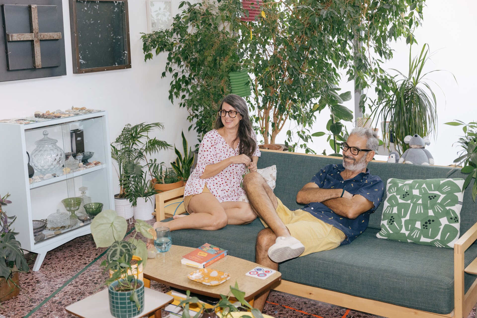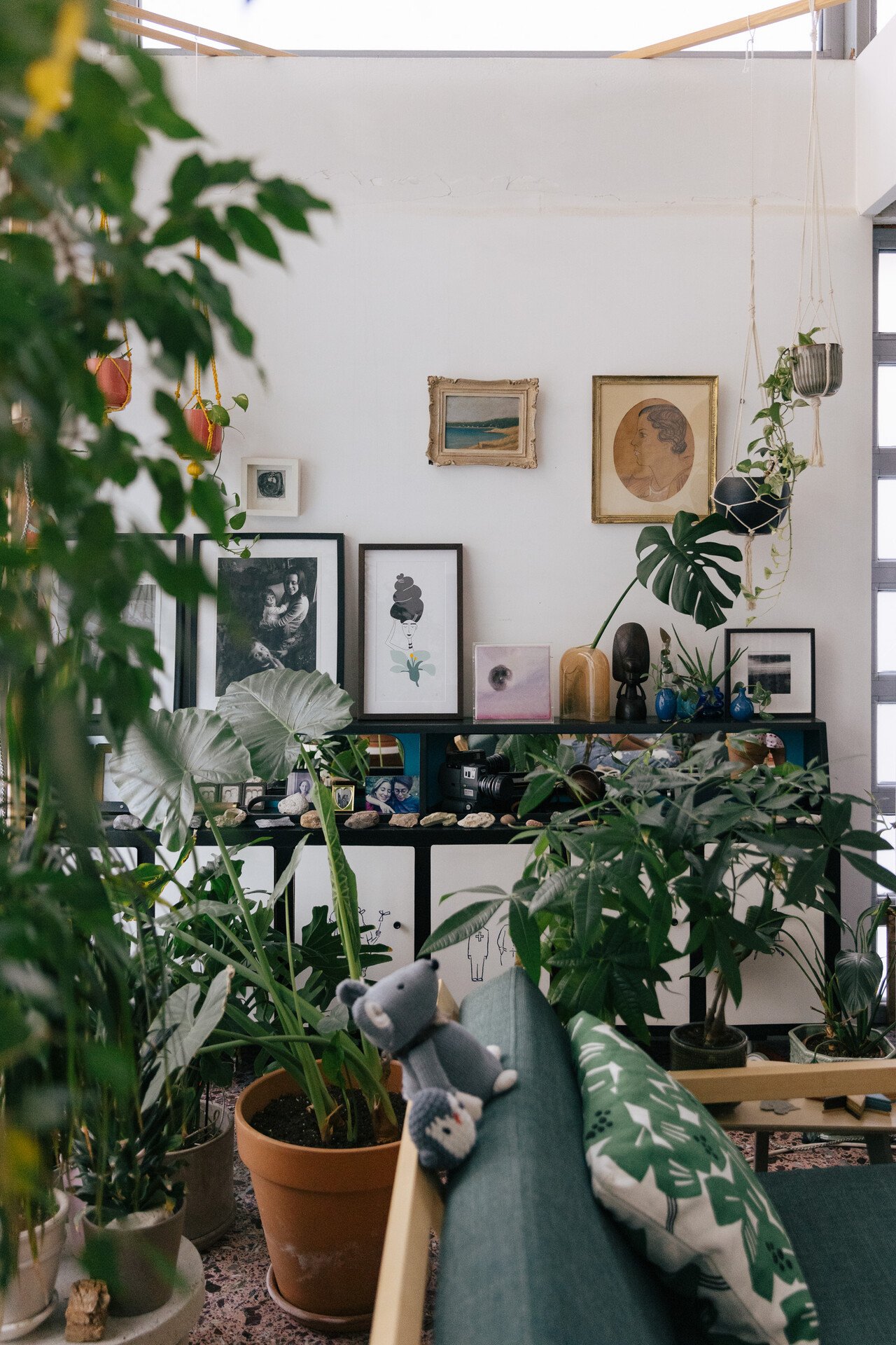 Το σπίτι διαθέτει πολλά και εντυπωσιακά φυτά εσωτερικού χώρου που έχουν θεριέψει μέσα στα χρόνια. «Πώς δημιουργήθηκε αυτή η ζούγκλα εσωτερικού χώρου;» «Τα φυτά τα φροντίζει ο Γιώργος, έχει μεράκι. Είναι σαν κήπος εντός. Το σπίτι, άλλωστε, μπορεί να το δεις και σαν μια πλατεία» λέει και μου δείχνει το σχέδιο που έχει φτιάξει με αυτοκόλλητες πολύχρωμες ταινίες ο εικαστικός Βασίλης Μπαλατσός. «Είδε το σπίτι σαν μια πλατεία σε μια χώρα δικής μας προέλευσης».