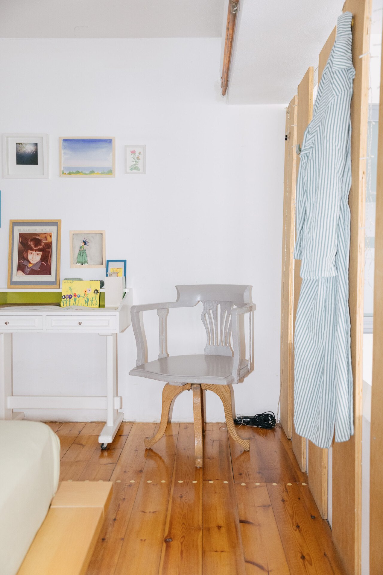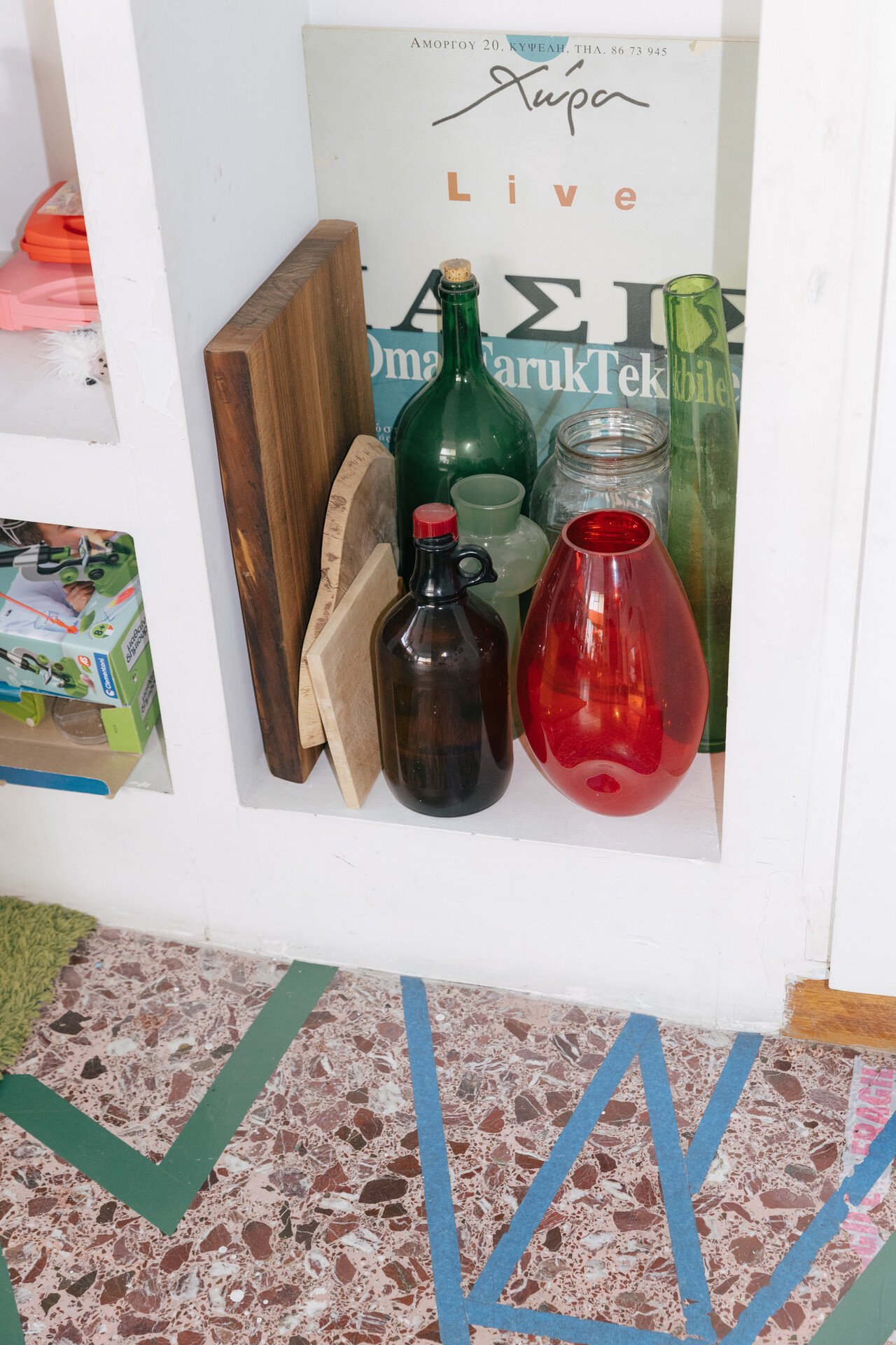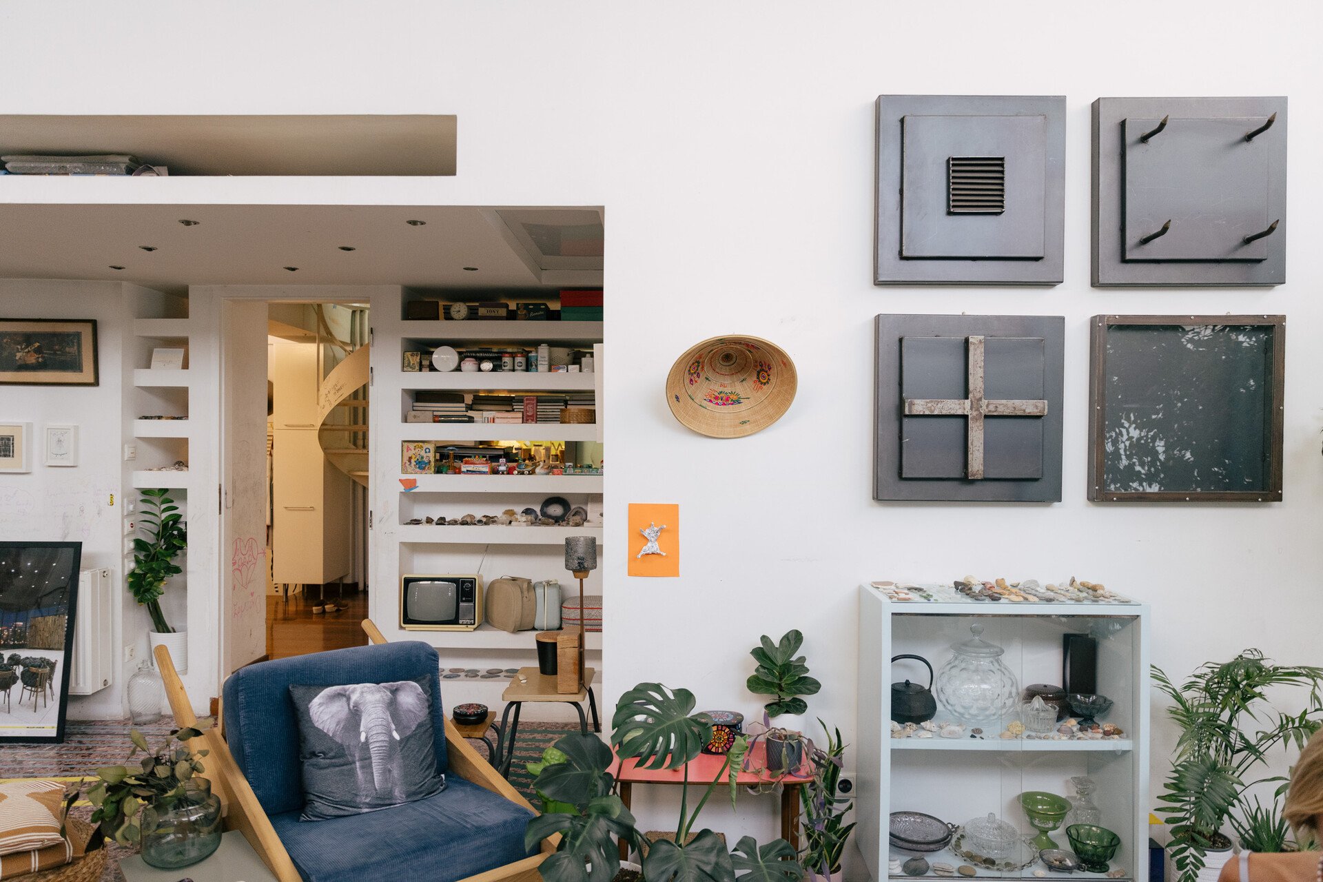 Αναρωτιέμαι αν το σπίτι έχει αλλάξει πολλές φορές μορφή. Μου απαντάει ότι αλλάζει συνεχώς. Έχει κάνει εκθέσεις φίλων, γυρίσματα, μπαζάρ με vintage ρούχα. Και τώρα, λέει, είναι πάλι το σπίτι σε μετάβαση. «Δίνω κάποια έπιπλα σε φίλους» εξηγεί και μου δείχνει ένα γαλάζιο επιπλάκι χάρμα οφθαλμών. Θα φέρει κάποια άλλα, καινούργια. «Όλο αυτό γίνεται», παρατηρεί.