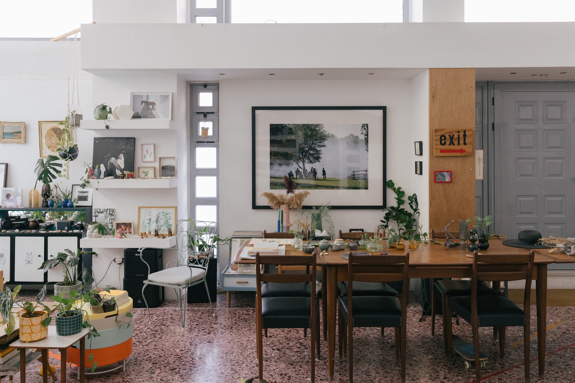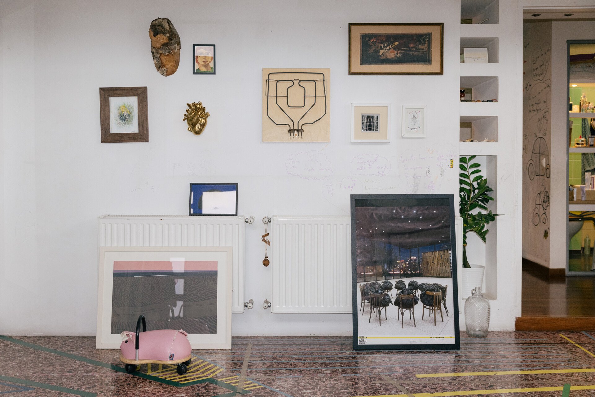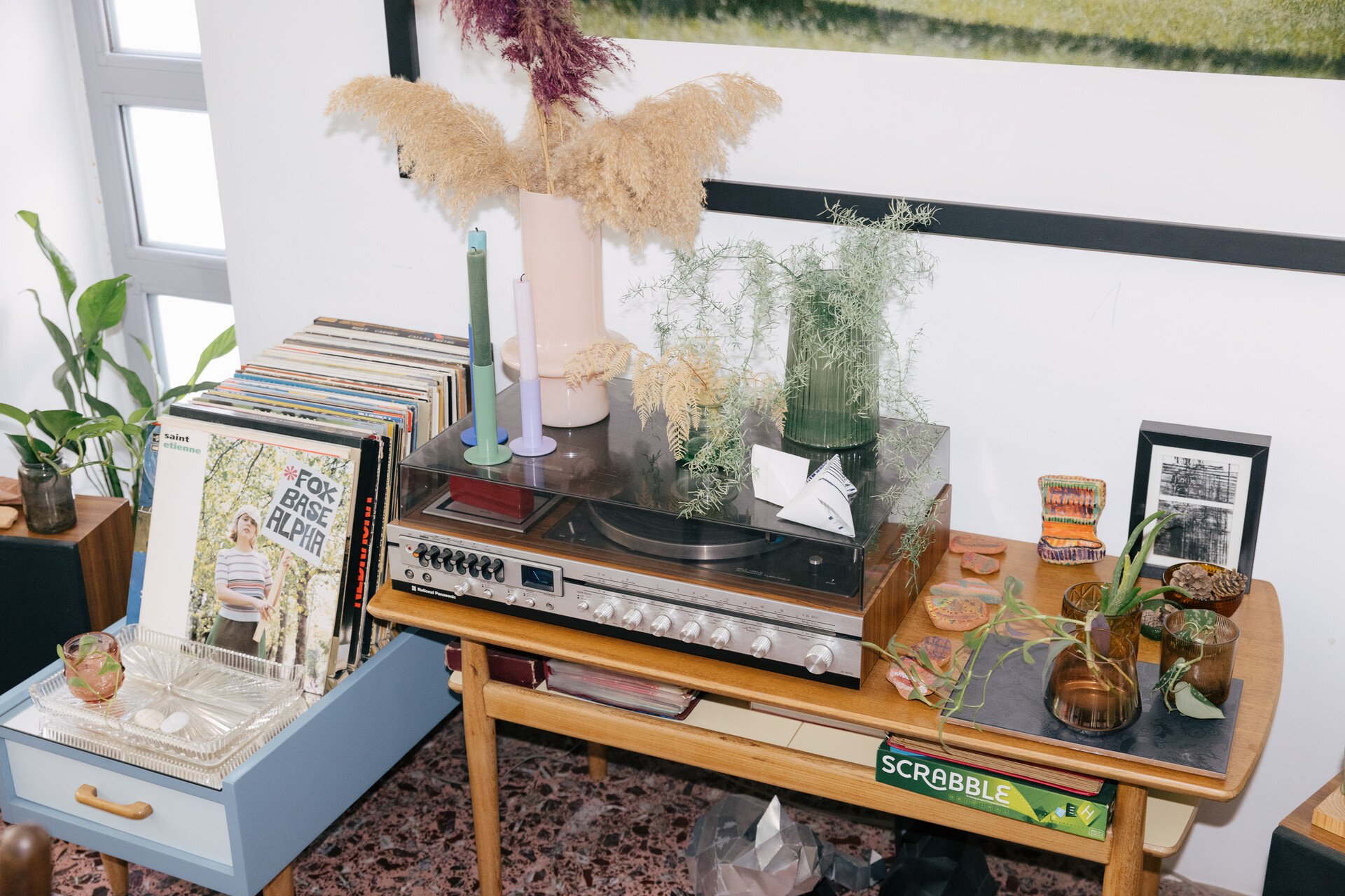 Αναρωτιέμαι αν το σπίτι έχει αλλάξει πολλές φορές μορφή. Μου απαντάει ότι αλλάζει συνεχώς. Έχει κάνει εκθέσεις φίλων, γυρίσματα, μπαζάρ με vintage ρούχα. Και τώρα, λέει, είναι πάλι το σπίτι σε μετάβαση. «Δίνω κάποια έπιπλα σε φίλους» εξηγεί και μου δείχνει ένα γαλάζιο επιπλάκι χάρμα οφθαλμών. Θα φέρει κάποια άλλα, καινούργια. «Όλο αυτό γίνεται», παρατηρεί.