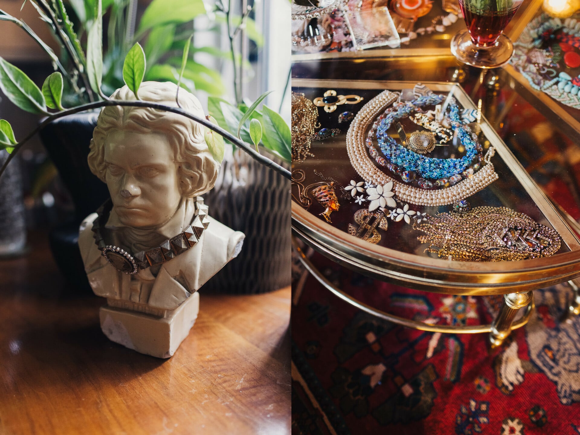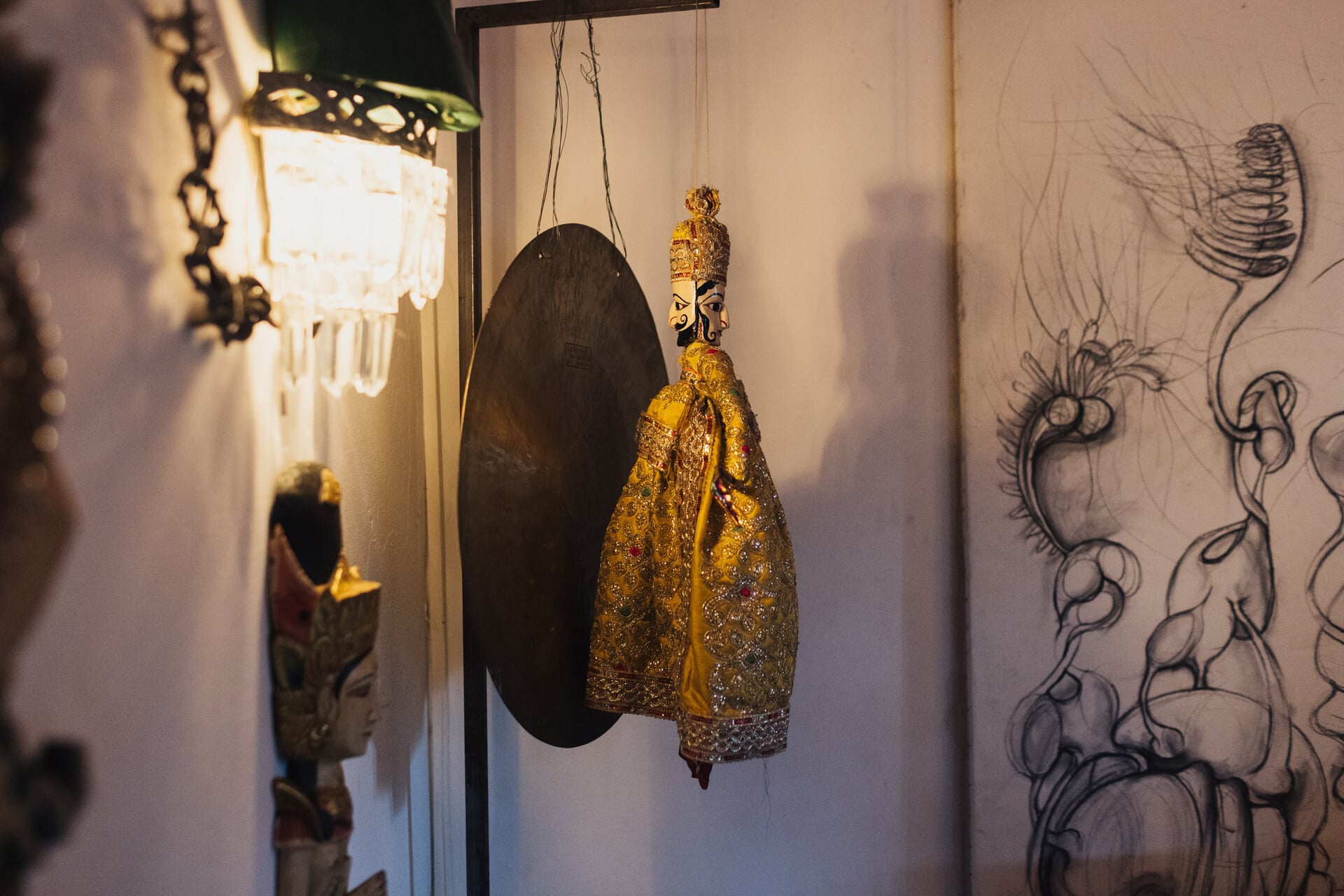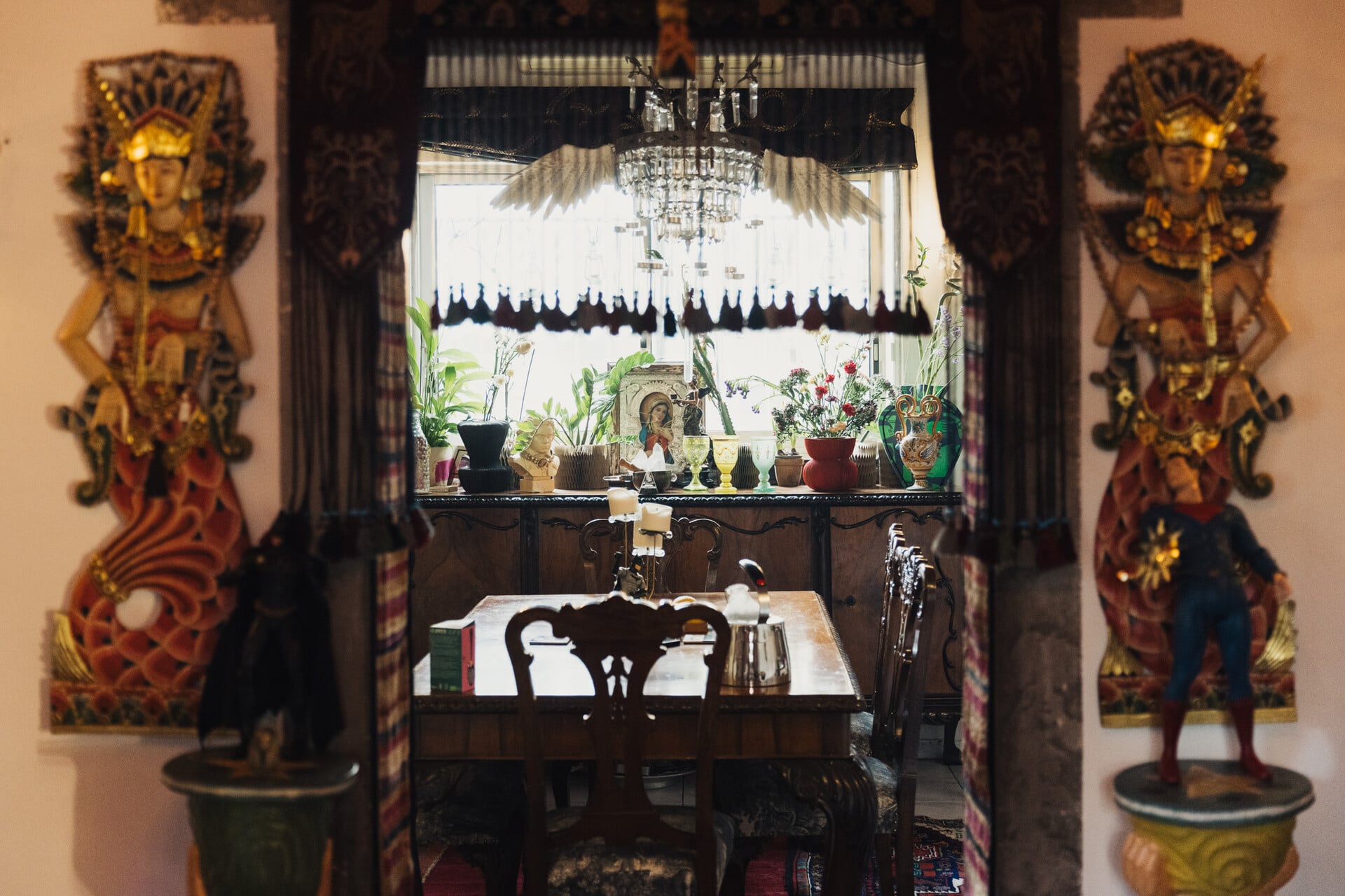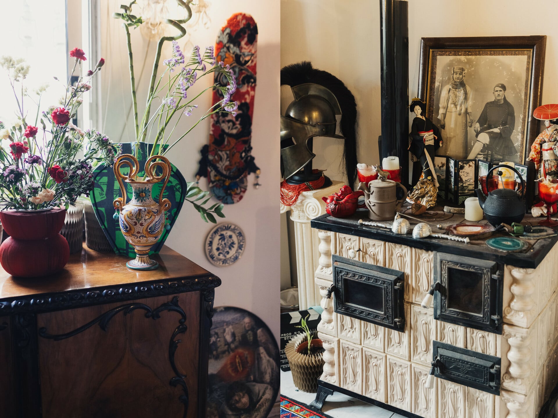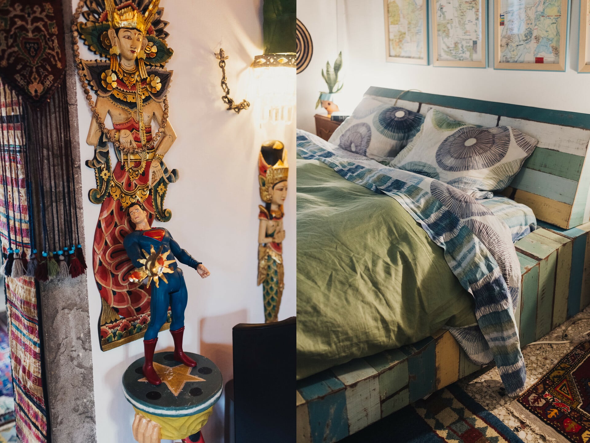 Διακρίνω αντικείμενα από τα ταξίδια του στην Ταϊλάνδη, το Μεξικό, το Μαρόκο – συνυπάρχουν και αυτά σε έναν ανεπιτήδευτο μαξιμαλισμό. «Η ζωή δεν είναι προκαθορισμένη. Είναι γεμάτη αντιφάσεις. Το σπίτι μου είναι όπως η ίδια η ζωή», λέει. Τίποτα εδώ δεν είναι απλώς διακοσμητικό. Ακόμα και το κιτς βρίσκει θέση, όταν αποκτά νόημα.
