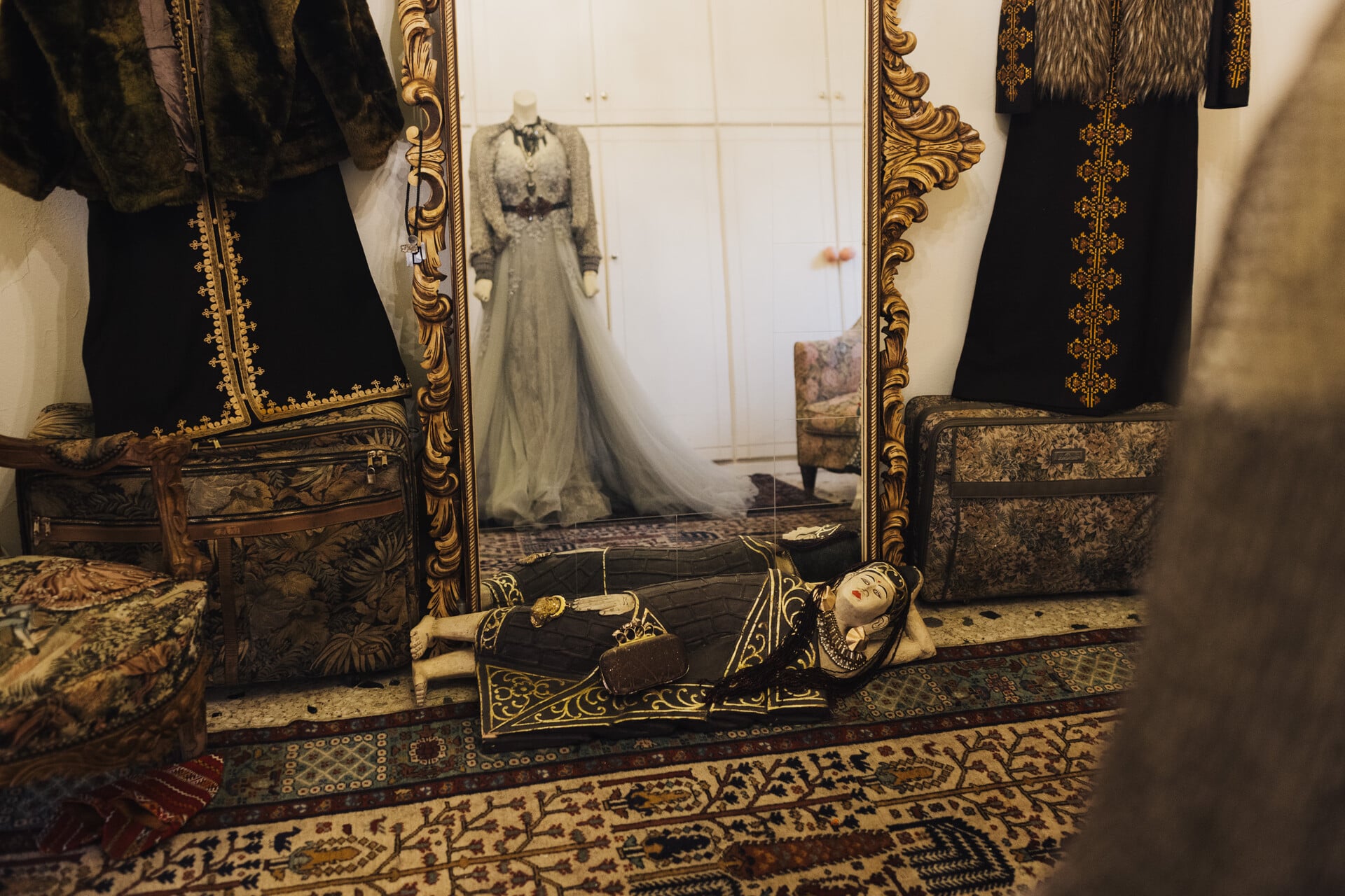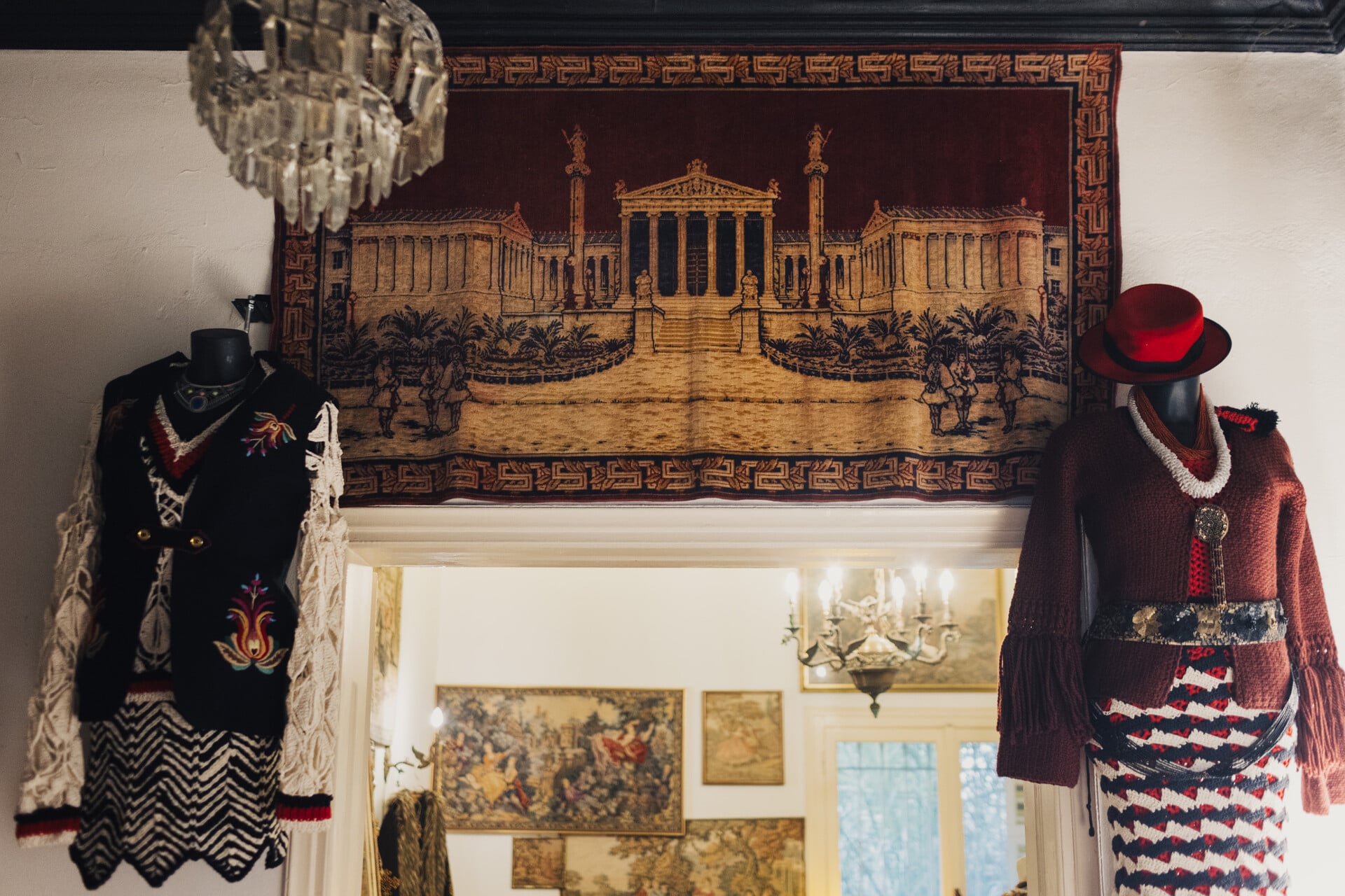Στο σπίτι υπάρχουν κούκλες με ρούχα και στολές. Πώς προκύπτουν όλα αυτά τα «συνολάκια» τον ρωτάω, εμφανώς ενθουσιασμένη, γιατί όλα είναι του γούστου μου και θέλω να τα δοκιμάσω. Είναι ρούχα που αν μιλούσαν θα είχαν να σου διηγηθούν δεκάδες ιστορίες. «Το ρούχο είναι η πιο άμεση μορφή επικοινωνίας. Ένα όμορφο, εκκεντρικό ρούχο δίνει χαρά στα μάτια των άλλων. Είναι μια πράξη γενναιοδωρίας από αυτόν που το φοράει, γιατί δημιουργεί θέμα – ακόμα και αφορμή για κουβέντα ή για κουτσομπολιό. Δεν είναι κακό να δίνεις τροφή για κουτσομπολιό, σκέψου πόσο ενδιαφέρουσα κάνεις τη βαρετή μέρα μερικών ανθρώπων», λέει με χιούμορ. «Μέσα στον χώρο τα ρούχα λειτουργούν επίσης με γενναιοδωρία. Είναι κομμάτια της αφήγησης», συμπληρώνει.
