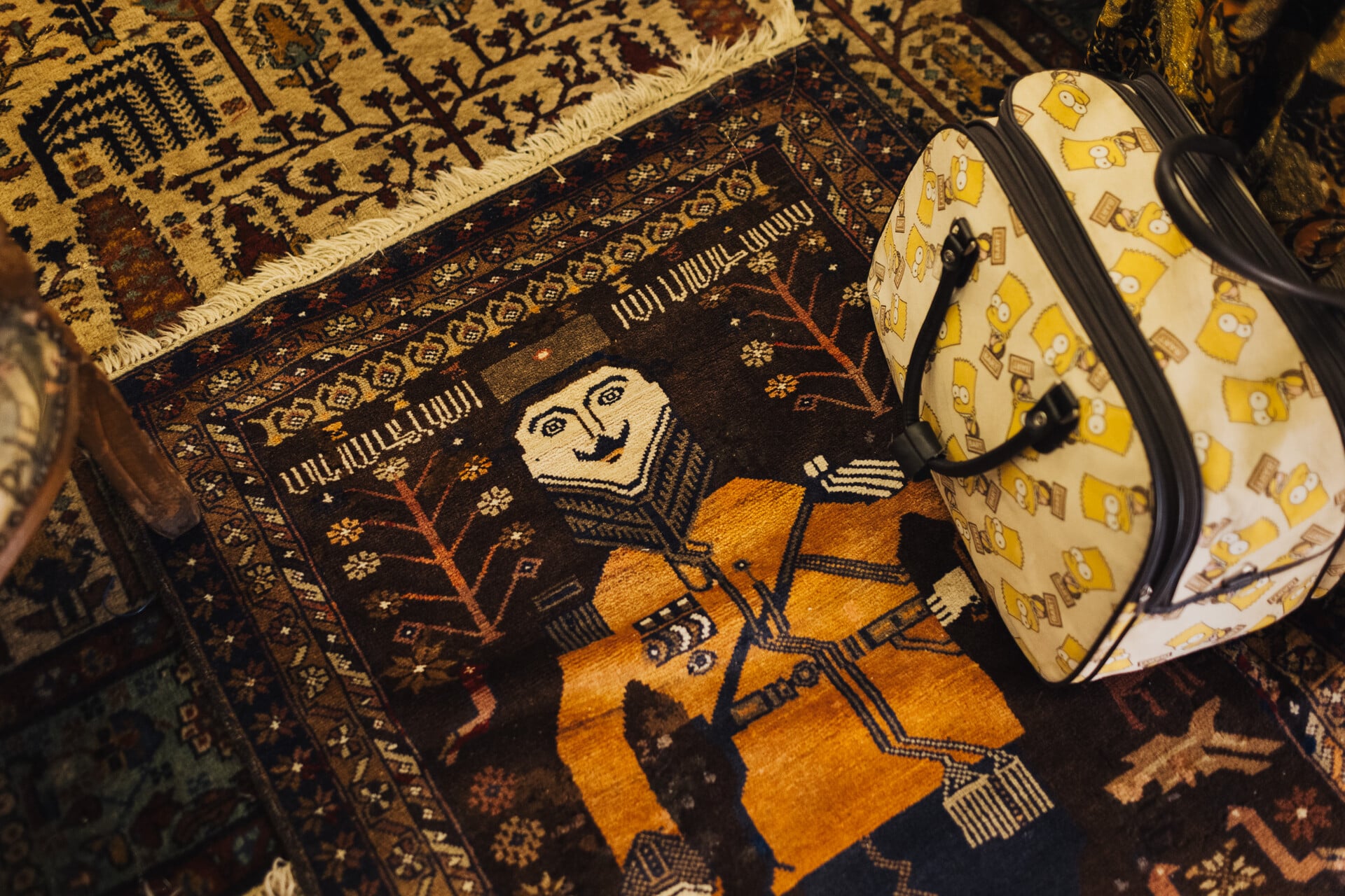 Η αγάπη του γι’ αυτά γεννήθηκε στην Κωνσταντινούπολη, εκεί όπου Ανατολή και Δύση συνδιαλέγονται αβίαστα. Κυρίως έχει περσικά χαλιά με παραστάσεις και ανθρώπινες μορφές – σπάνιες, αφηγηματικές. «Μου προσφέρουν τέχνη και ταπεινότητα μαζί», λέει. «Η ταπεινότητα πώς προκύπτει;», ρωτάω. «Μα τα πατάμε τα χαλιά», απαντάει και γελάμε.