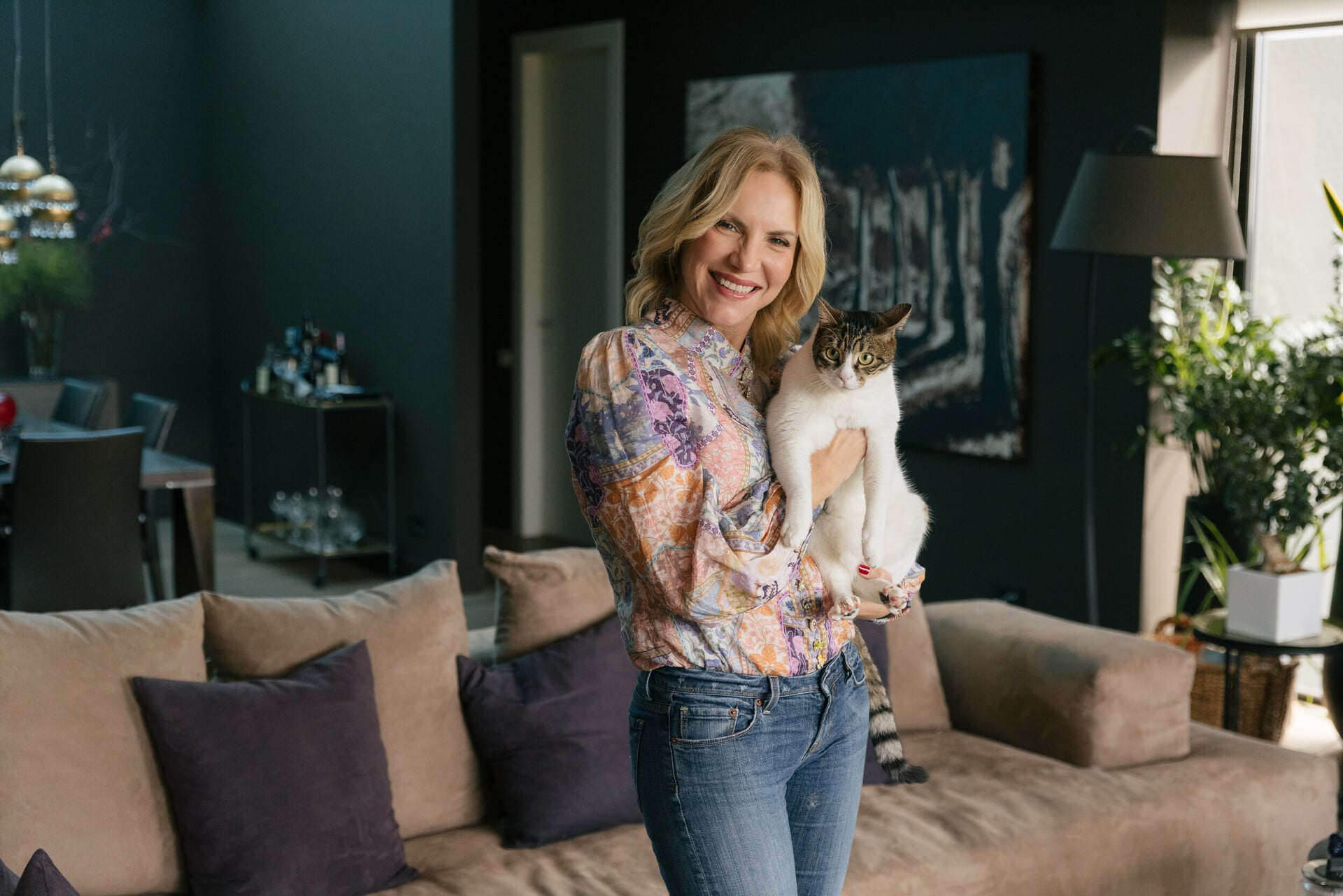 Χτίστηκε σχετικά γρήγορα και μέσα σε έναν χρόνο μπήκαν. Θυμάται πως μόλις είχε αποκτήσει το δεύτερο παιδί της και μαζί με το ολοκαίνουργιο σπίτι ήρθε και μια καινούργια ζωή. Κάπως έτσι, αυτό το σπίτι θεμελίωσε και την έννοια της οικογένειας. Μου δίνει ωραία πάσα για να τη ρωτήσω τι είναι για εκείνη το σπίτι. «Η ζωή μου όλη. Σπίτι είναι εκεί όπου μαζεύεται η οικογένεια. Είναι η ηρεμία μου. Μπαίνω εδώ και αλλάζουν οι βιορυθμοί», εξομολογείται.