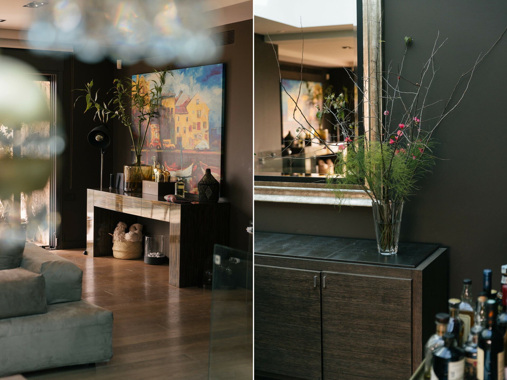 Ο καναπές και τα τραπεζάκια του σαλονιού είναι Desiree από το Casa di Patsi, ενώ η κονσόλα είναι σε σχέδιο του αρχιτέκτονα από ξύλο ζεμπράνο. Παρατηρώ ότι δεν έχει πολλή τέχνη στους τοίχους. Της αρέσουν τα λίγα και καλά έργα, όχι οι χώροι που θυμίζουν γκαλερί. Αγαπάει ιδιαίτερα ένα γλυπτό της Κάλλιας Πανοπούλου και δύο μεγάλα έργα ζωγραφικής: τo έργο του Miguel Zargan πάνω απ’ τον μπουφέ και το έργο του Laurin Rinder δίπλα στο τζάκι.