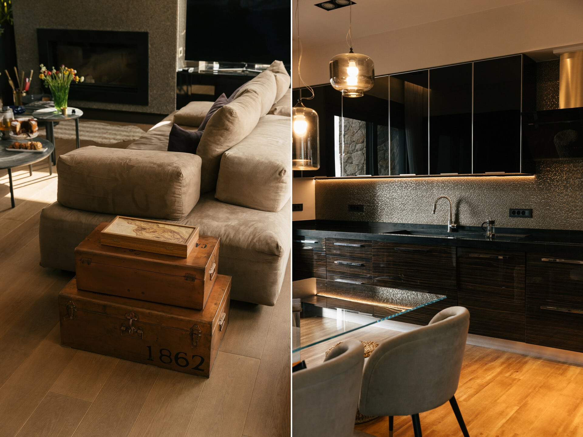Η μαύρη, εντυπωσιακή κουζίνα είναι της Gruppo. Το τζάκι είναι ενεργειακό και εξαιρετικά ζεστό. «Έξω μπορεί να χιονίζει κι εμείς να κυκλοφορούμε με t-shirt», μου λέει.