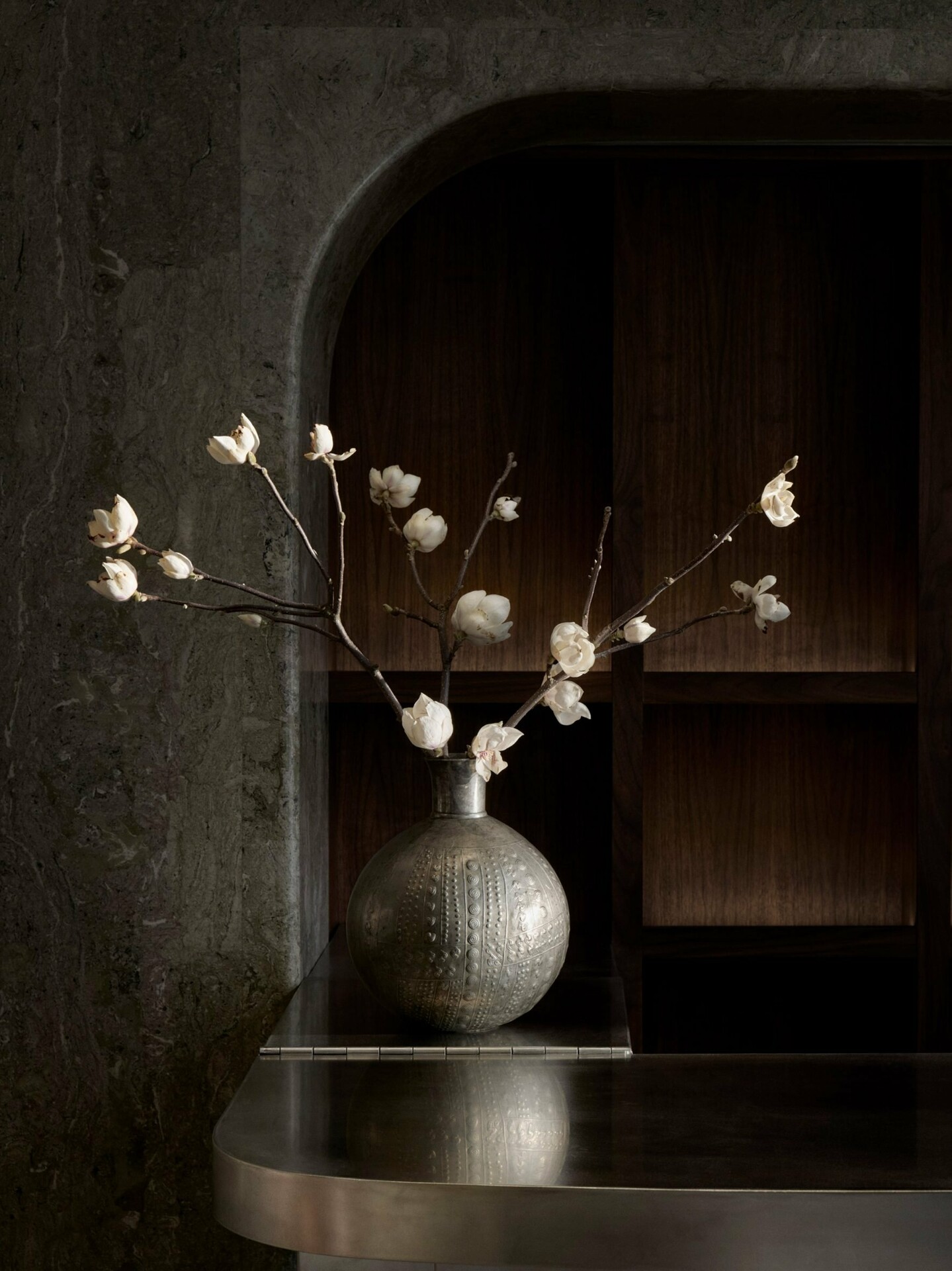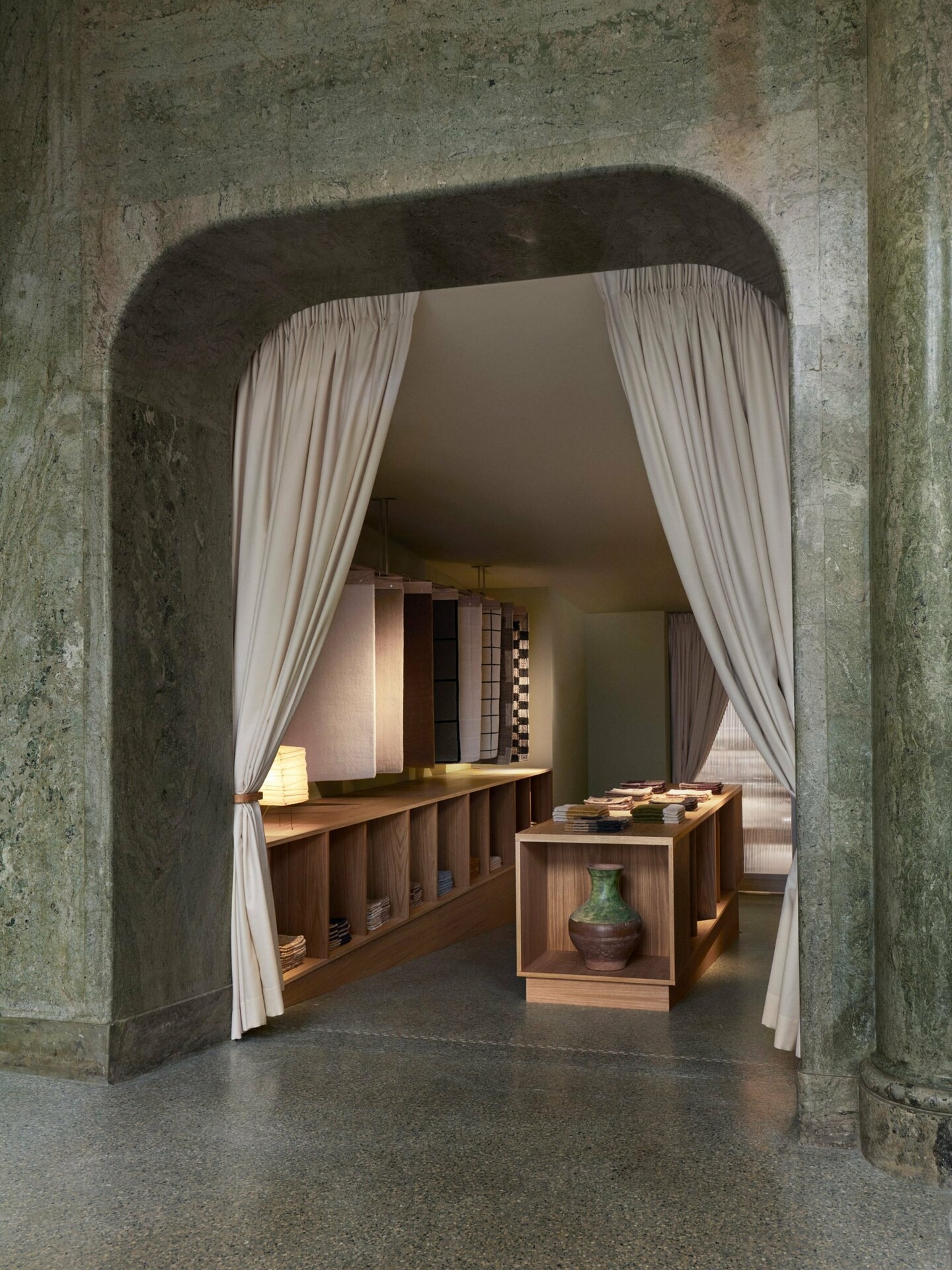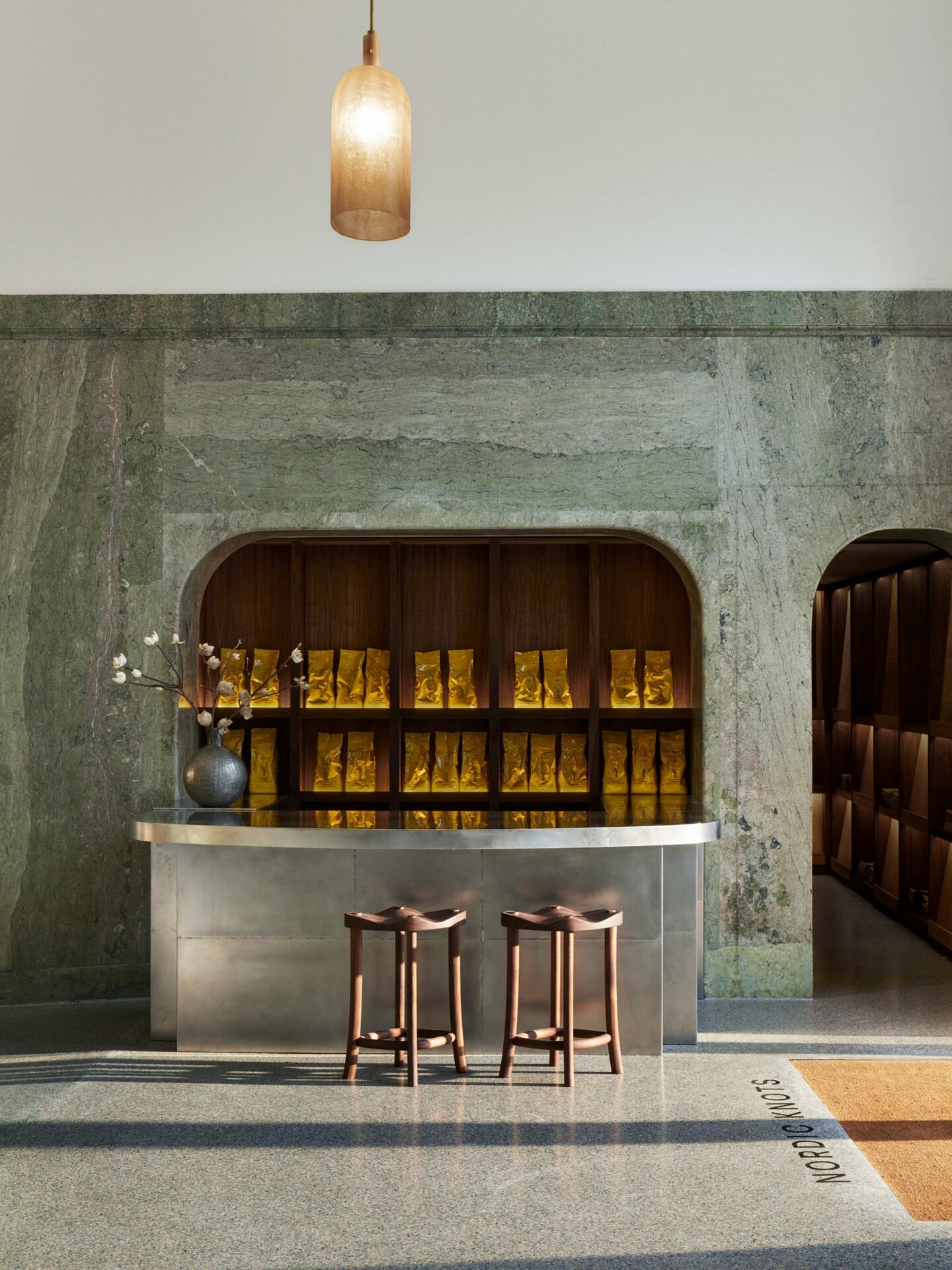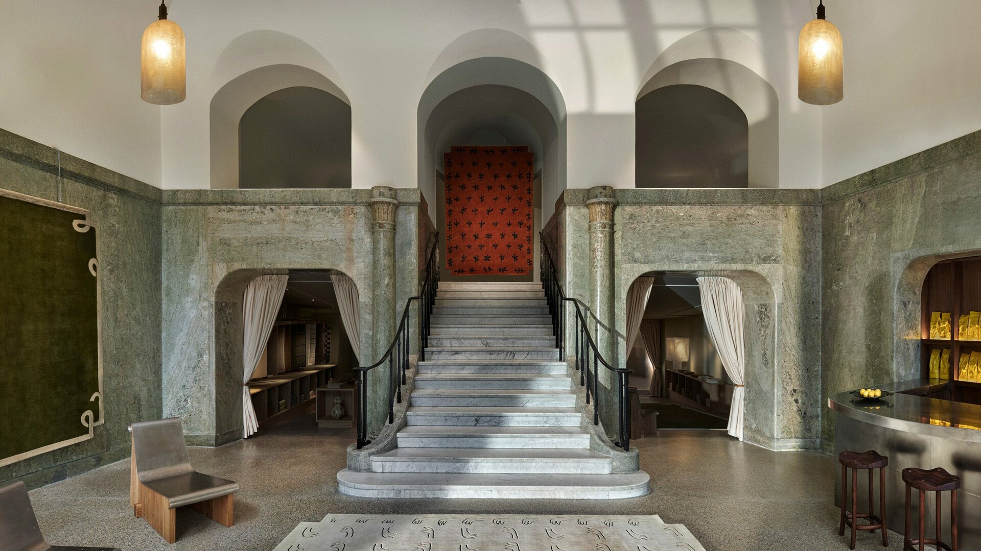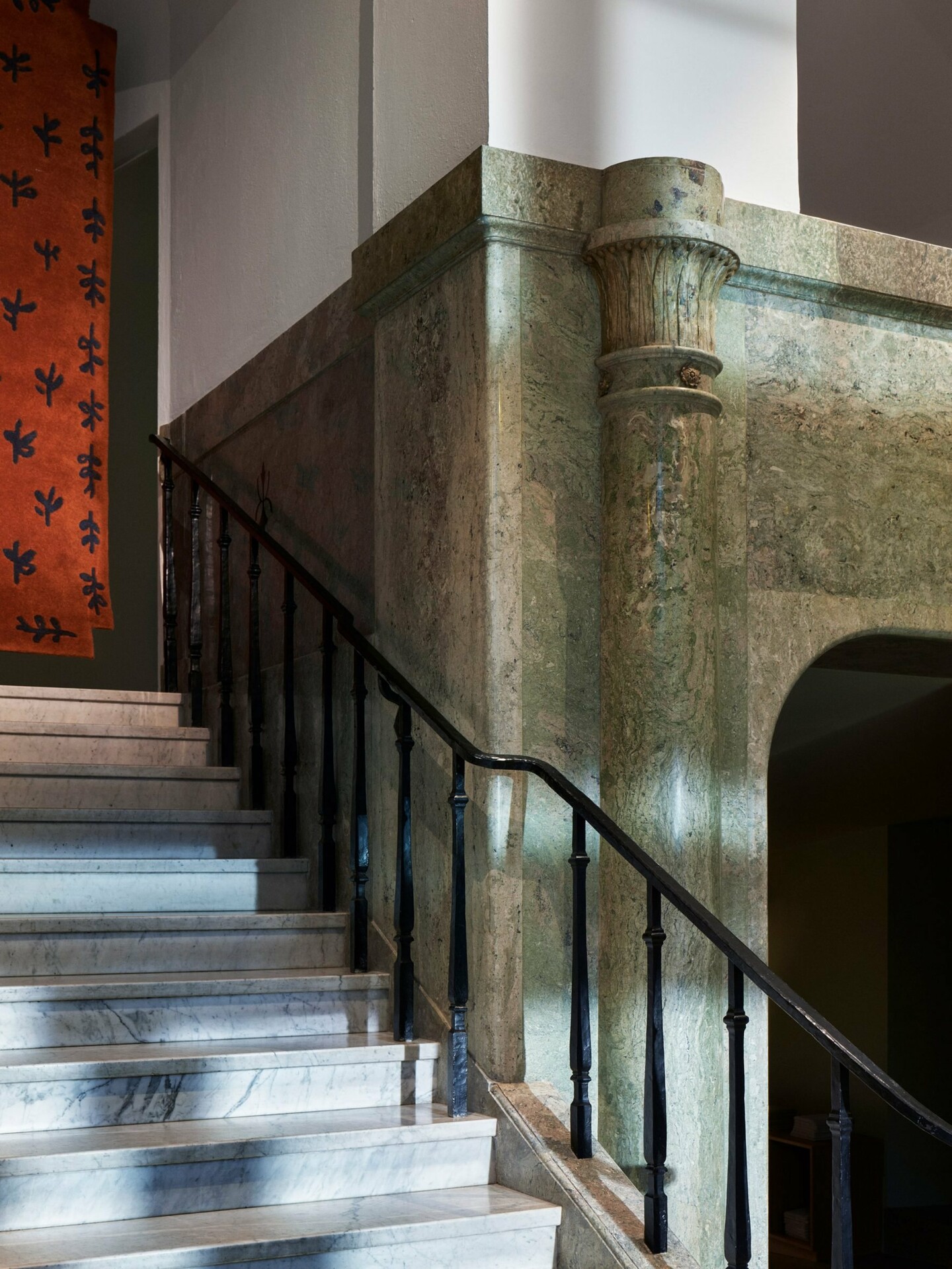 Κατά τη διάρκεια της κατεδάφισης ορισμένων παλαιών ντουλαπιών, ανακαλύφθηκε το αρχικό δάπεδο του κτιρίου από τις αρχές του 1900, ένα απαλό πράσινο terrazzo με κόκκινη και λευκή σκακιέρα, το οποίο διατηρήθηκε και ενέπνευσε τις σχεδιαστικές επεμβάσεις. Τα πέτρινα δάπεδα και οι τοίχοι συμπληρώνονται από μια ποικιλία φυσικών υλικών.