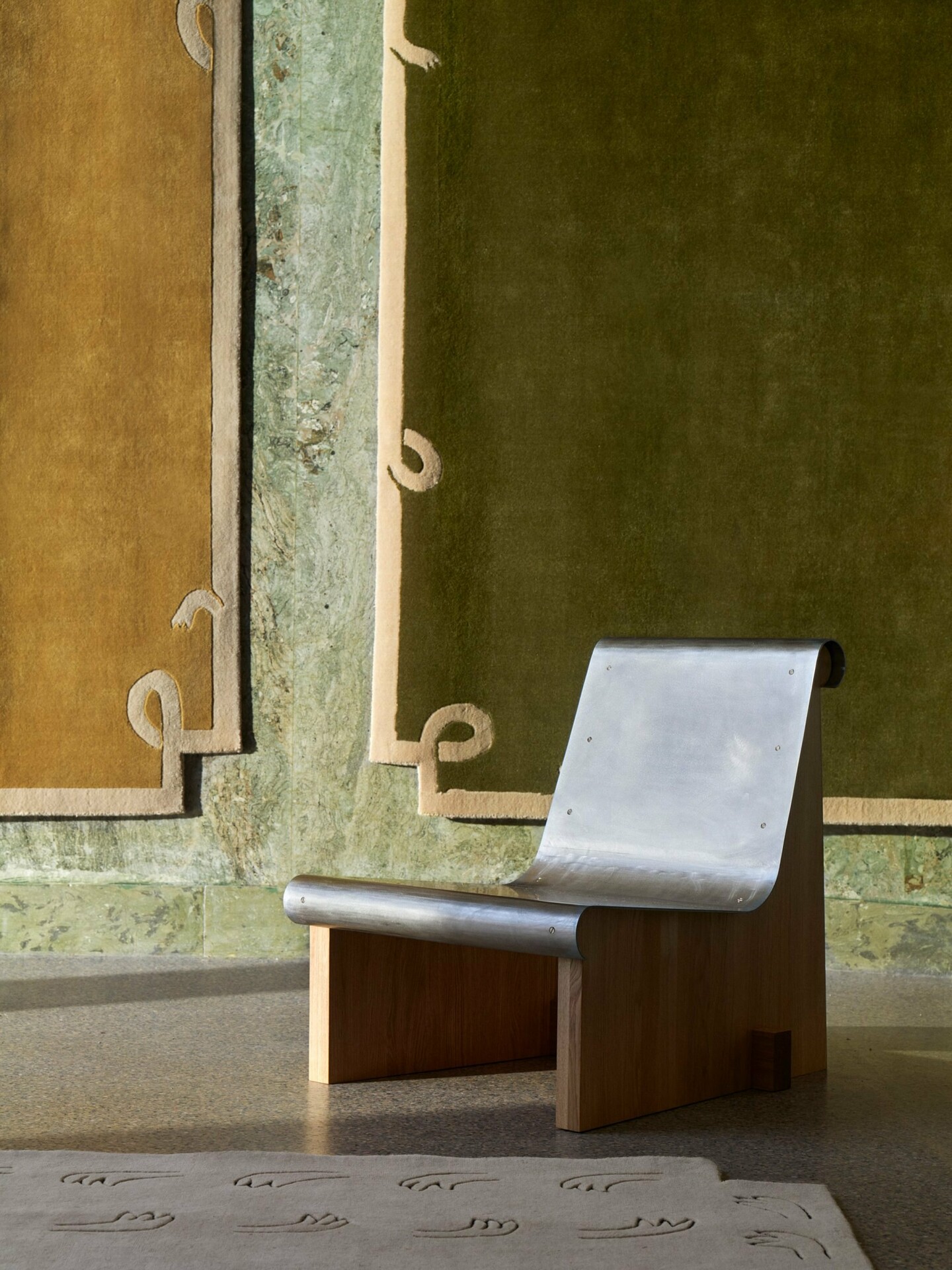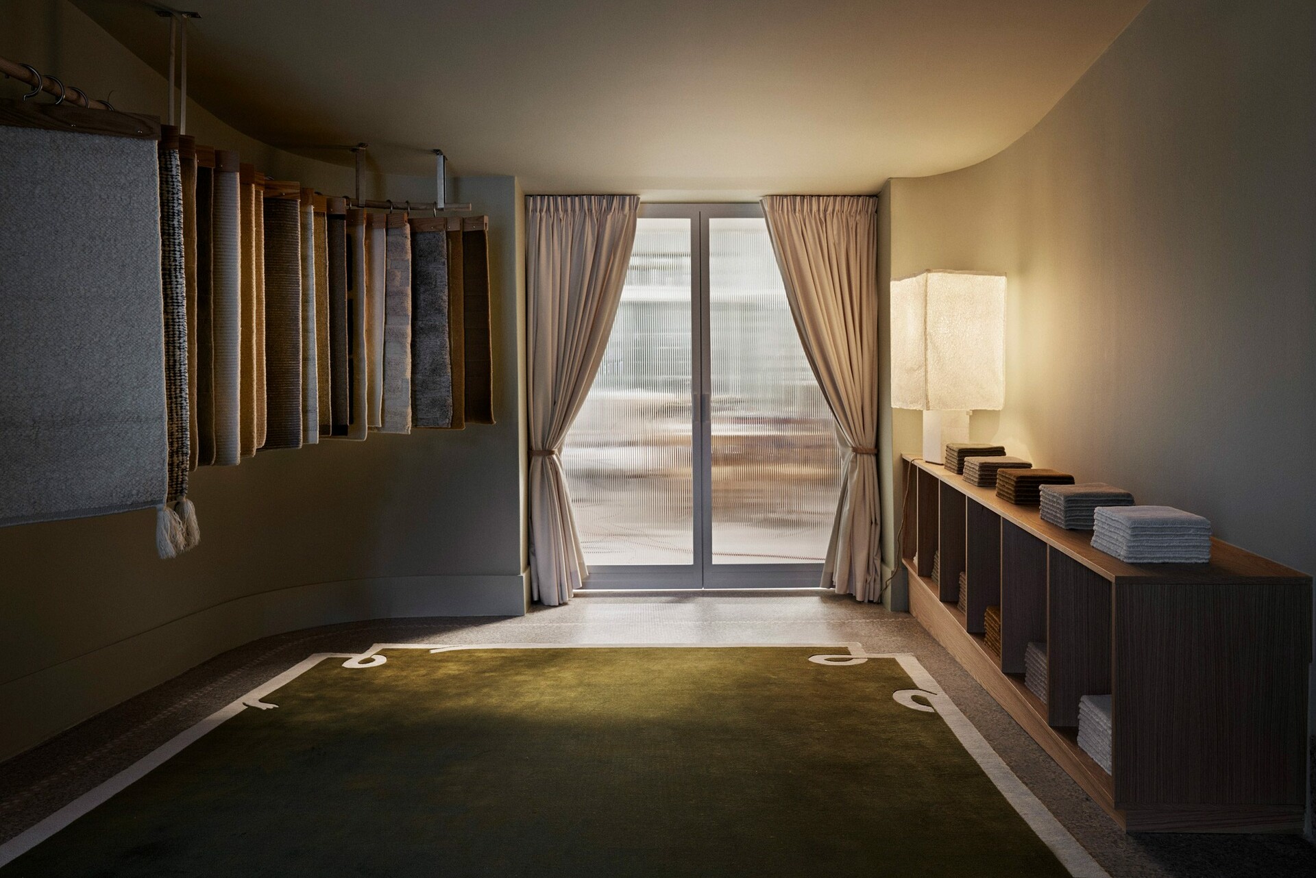 Ράφια από βελανιδιά και καρυδιά κοσμούν τους τοίχους του Sample Bar, ενός δωματίου όπου οι πελάτες μπορούν να δουν δείγματα από διάφορα χαλιά Nordic Knots και όπου το Studio Giancarlo Valle εισήγαγε ειδικά κατασκευασμένες δρύινες πολυθρόνες.
