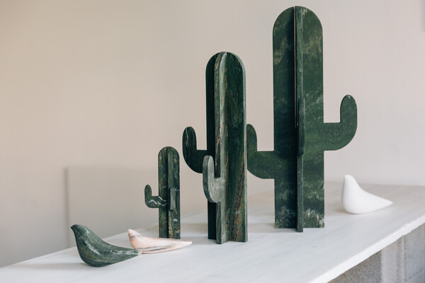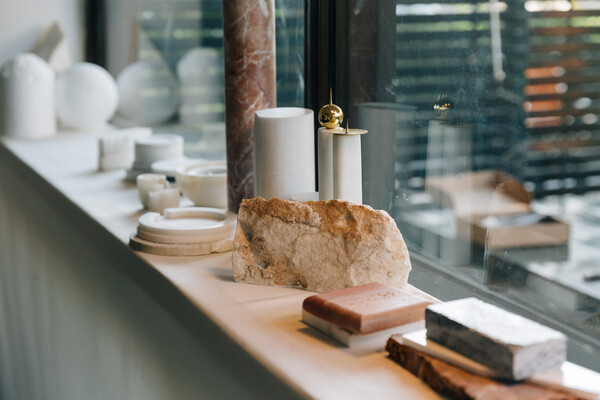 Λίγο αργότερα μου εξηγούν σχετικά με τον τρόπο επεξεργασίας του μαρμάρου, ότι δουλεύουν τόσο με μηχανήματα σε βιομηχανικό επίπεδο όσο και με μαρμαροτεχνίτες και μαρμαρογλύπτες που δουλεύουν το υλικό στο χέρι, όπως παλιά. «Οι τελευταίοι είναι που κάνουν τη διαφορά στην αισθαντική υφή των αντικειμένων μας και με τους οποίους συνεργαζόμαστε πολύ στενά από τα αρχικά στάδια κάθε design.