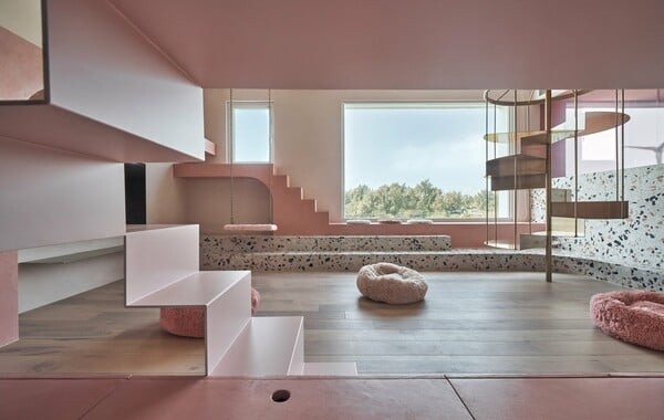 Αυτό το σπίτι διακοπών στην Ταϊβάν πήρε το όνομά του καθώς περιλαμβάνει σκάλες γάτας, ένα περιστρεφόμενο πλαίσιο αναρρίχησης σε σχήμα καρουζέλ και μια χνουδωτή ροζ κούνια γάτας.