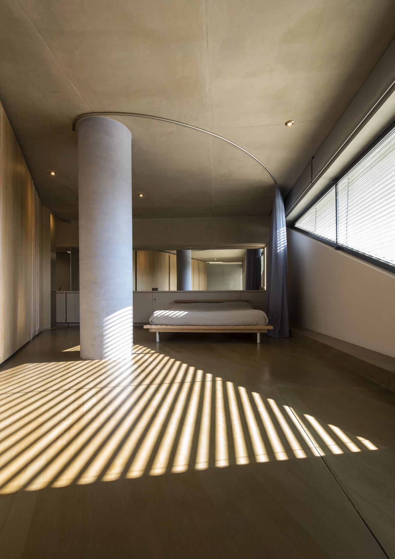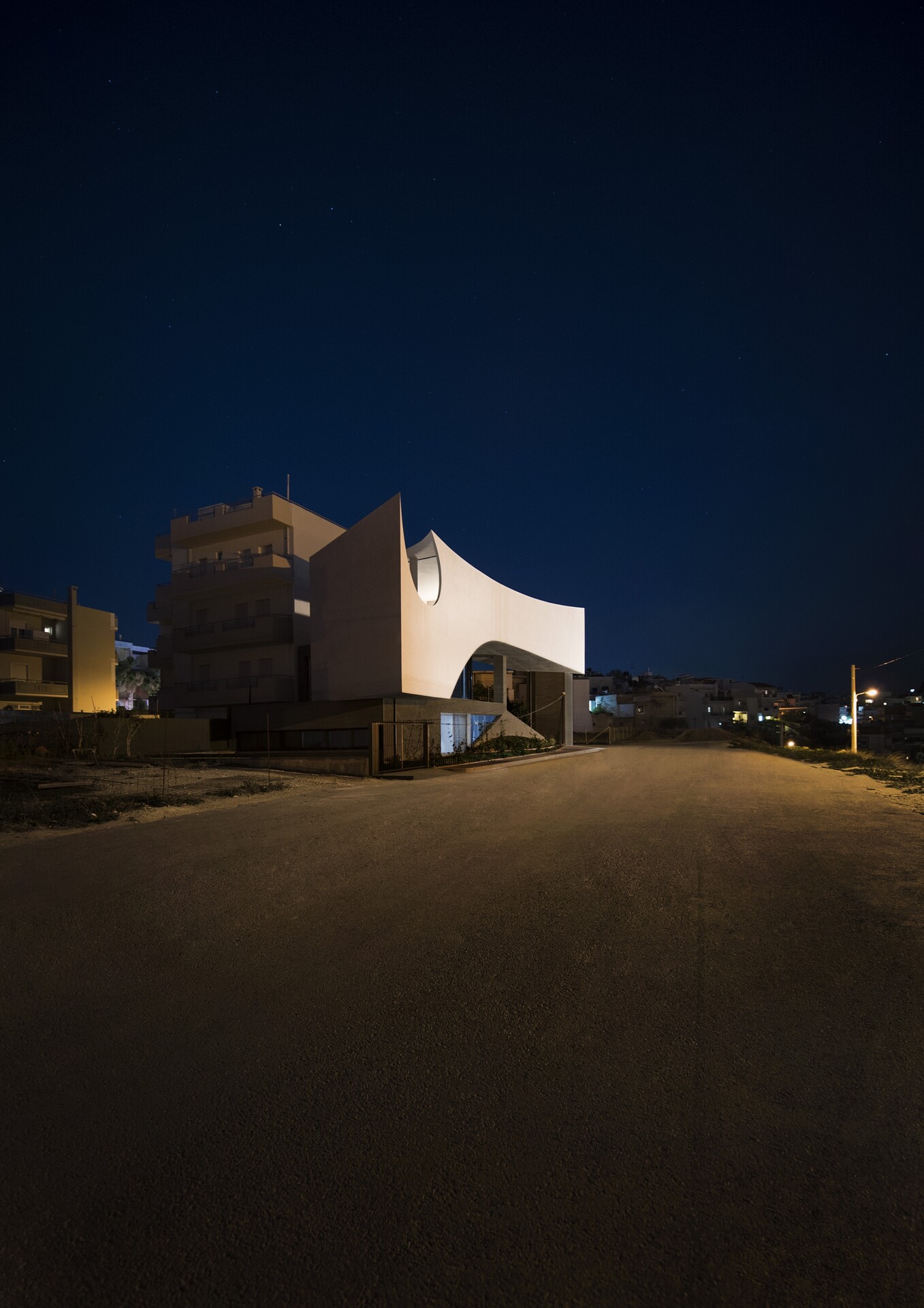Η εξαρχής-γλυπτική χειρονομία προκύπτει από αυτήν την ηλιόλουστη συνθήκη: επιδιώκεται μέσω μίας διπλής καμπυλότητας το κτίριο να καμπυλωθεί, να λυγίσει από τη δύναμη της πορείας του ήλιου από την ανατολή στη δύση. Η όψη είναι τυφλή, με εξαίρεση μία εκ-τομή στην άνω γωνία, η οποία αποκαλύπτει έναν υπαίθριο χώρο. Η κάτω καμπύλη υποδέχεται το φως στο ενδιάμεσο και κυρίως επίπεδο, παραλαμβάνοντας την κλίμακα του ορόφου. Ο όγκος λειτουργεί ως στέγαστρο, για την ημιυπαίθρια εκτόνωση της κατοικίας και τον κήπο. Το εσωτερικό του παραλαμβάνει τον κυρίως χώρο ύπνου και καταλήγει σε μια κρυφή εκ-τομή της οροφής του, στην ανατολική της γωνία. Μία μικρή δεξαμενή λειτουργεί εκεί ως υπαίθριο λουτρό. Το χαμηλότερο επίπεδο, το οποίο αναπτύσσεται ως ισχυρή σκουρόχρωμη βάση, είναι επίσης εσωστρεφές. Ο χειρισμός των καμπυλών σε αυτό το έργο, επιδιώκει ταύτιση με τον τεταμένο χειρισμό κενού και φωτός. Παρ' όλες τις σοβαρές προθέσεις, πρόκειται για ένα μάλλον ευφρόσυνο κτίριο -το οποίο υπακούει κυρίως σε κανόνες που γεννά το ίδιο. Η στατική επίλυση είναι αδιάλυτη από την ίδια τη μορφή: η υποστύλωση στο επίπεδο του κήπου υλοποιείται προοδευτικά από ένα κυκλικό σύμμικτο μεταλλικό, σε ένα τετράγωνο σκυροδετημένο, για να καταλήξει στο γωνιακό μονολιθικό τοιχίο στο οποίο το façade εδράζεται ελεύθερα. Το ευφρόσυνο façade δείχνει να απολαμβάνει την αντιστικτική συνενοχή των γειτονικών, μαζικά παραγόμενων πολυκατοικιών.