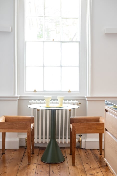 Η απροσδόκητη κίτρινη πόρτα υπαινίσσεται το ασυνήθιστο για τη μουντή αγγλική εξοχή φως και τη λάμψη του χρώματος που ακολουθεί και διατρέχει το σπίτι. Ένα δάπεδο ψαροκόκαλο από γυαλιστερή, κίτρινη πέτρα λάβας της Made a Mano στην είσοδο, ενώ μια υπέροχη σκάλα με ζωγραφισμένο δρομέα οδηγεί στον πρώτο όροφο. Η κουζίνα, που ήταν κρυμμένη στο πίσω μέρος του κτιρίου, μεταφέρθηκε στην καρδιά του σπιτιού, κοντά στο βουητό του δρόμου. Οι πράσινοι μαρμάρινοι πάγκοι προέρχονται από την Τήνο. Βαμμένες οροφές, γεωμετρικά πλακάκια μπάνιου, κεραμικά της Ελένης Βερναδάκη, ρυθμιζόμενα φωτιστικά τοίχου από τη Charlotte Perriand.