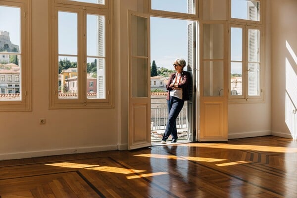 Μένουμε για λίγο να χαζεύουμε την Ακρόπολη και τις κεραμιδένιες σκεπές των καταστημάτων του δρόμου. «Έλα, θα δεις πώς αλλάζει εντελώς το τοπίο όταν βλέπεις τα πράγματα από το ψηλότερο επίπεδο» λέει όταν έχουμε ανέβει πια στον τρίτο όροφο του κτιρίου.