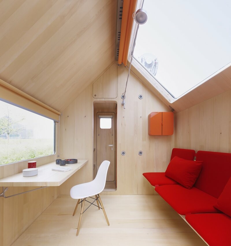Το σπίτι ξεκινά με καθιστικό, με καναπέ και πτυσσόμενο τραπέζι. Το μπάνιο και η κουζίνα βρίσκονται πίσω από ένα διαχωριστικό.