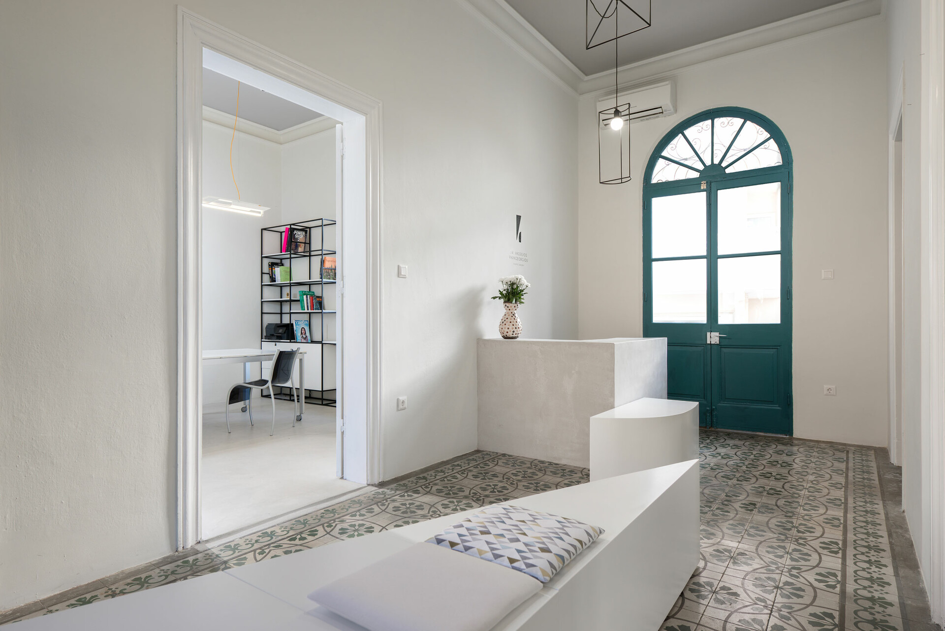 Μέσα από τα παλιά ψηλά παράθυρα, τo φως του ηλίου διαχέεται άπλετα στο εσωτερικό. Το λευκό χρώμα των τοίχων αποπνέει την αίσθηση του καθαρού, ενώ ταυτόχρονα αντιπαραβάλλεται στην ποικιλία των χρωμάτων και των γεωμετρικών μοτίβων των παλιών πλακιδίων του δαπέδου, και αναδεικνύει έτσι το αποτύπωμα του χρόνου, την μοναδικότητα και την ζεστασιά τους. Μια λεία και ενιαία στρώση τσιμεντοκονίας έρχεται να γεμίσει τα κενά του δαπέδου, εκεί που τα πλακάκια λείπουν.