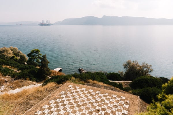 Όσο σημαντική είναι η φροντίδα του τρόπου με τον οποίο διαχειρίζονται ο ιδιοκτήτης και ο αρχιτέκτονας το χτίσιμο πάνω σε ένα τέτοιο σημαντικό τοπίο, άλλο τόσο, ίσως και περισσότερο σημαντική φαίνεται να είναι εδώ η διαμόρφωση του περιβάλλοντος χώρου. Μάλλον δεν υπάρχει πιο τρανή απόδειξη γι' αυτό από την υπαίθρια διαμόρφωση του εδάφους σε μια ανθρώπινης κλίμακας σκακιέρα για τον ιδιοκτήτη και τους οικείους του. Ακόμα και το πλέξιμο των λευκών μαρμάρων, των πακτωμένων μες στο χώμα, θυμίζει ξανά και ξανά πως ο «βίος εν Ελλάδι είναι υπαίθριος».
