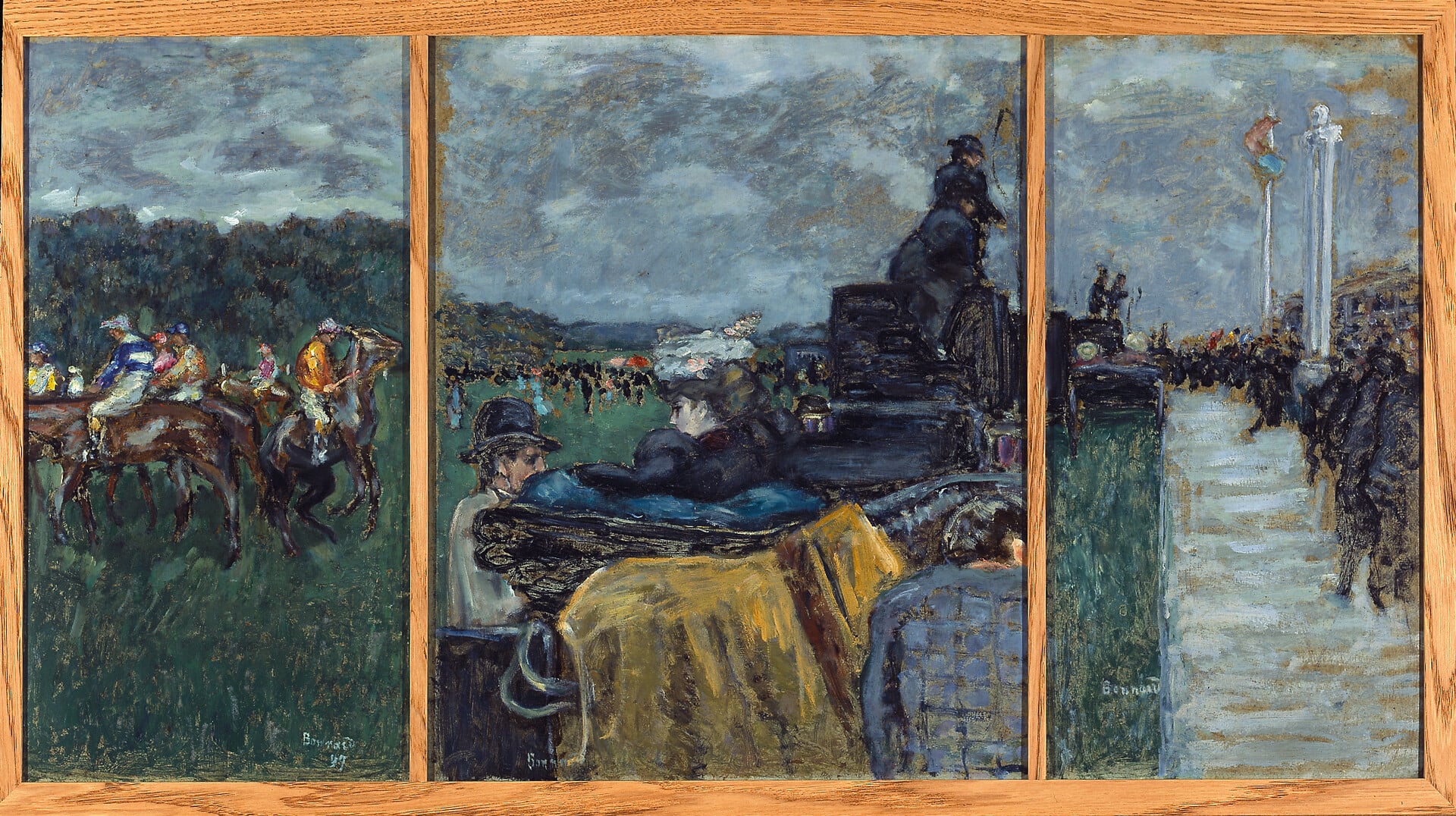 Σε αυτό το έργο βρίσκουμε πολλά σημαντικά στοιχεία. Πρώτα απ’ όλα αποτυπώνει, όπως έχουν κάνει και νωρίτερα από εκείνον ο Μανέ, ο Λοτρέκ, ο Ντεγκά, τον ιππόδρομο, που είναι για τους καλλιτέχνες εκείνη την εποχή κάτι το ασύλληπτο, γιατί τους αρέσει να δείχνουν την κίνηση των αλόγων και την κίνηση των ανθρώπων που παρακολουθούν τους αγώνες. Καταρχάς, αυτό το έργο είναι πολύ ενδιαφέρον γιατί είναι επηρεασμένο από την τέχνη της γιαπωνέζικης λιθογραφίας, με την έννοια ότι είναι μεν τρίπτυχο, αλλά και δεν είναι. Οι διαστάσεις όλων των πανό διαφέρουν και επίσης ο Μπονάρ έχει φροντίσει και έχει υπογράψει ξεχωριστά το καθένα και έτσι οι συνθέσεις μπορούν να παρουσιαστούν και ξεχωριστά και ως σύνολο. Κι αυτό είναι καθαρά η φιλοσοφία του ουκίγιο-ε. Ο πρώτος του ιδιοκτήτης ήταν ο πολύ γνωστός συλλέκτης Χάρι Κέσλερ, αυτός που έφερε τη μοντέρνα τέχνη στη Γερμανία, ένας πρωτοπόρος. Όταν πουλήθηκε η συλλογή του, αυτά τα έργα πουλήθηκαν μεμονωμένα κι ήταν ο συλλέκτης που μας τα δάνεισε τώρα αυτός που έκανε την έρευνα, τα βρήκε, τα αγόρασε όλα και τα επανασυνέδεσε.