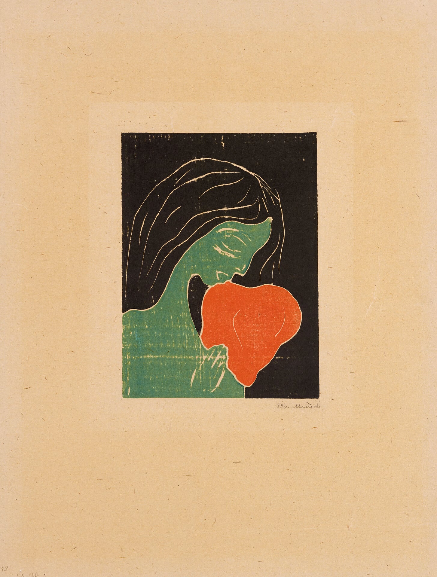 Το ότι φέρνουμε Μουνκ στην Αθήνα είναι ένα γεγονός που μας δίνει μεγάλη χαρά. Αυτό το έργο είναι πολύ σημαντικό, ο Μουνκ έφερε επανάσταση στην ξυλογραφία γιατί δεν ακολούθησε καθόλου την κλασική τεχνική. Έκανε τις δικές του μήτρες, μόνος του και εφηύρε και νέα τεχνική. Έκανε κάτι σαν παζλ, εδώ, σε αυτό το έργο κάθε χρώμα είναι ένα κομμάτι από την ίδια μήτρα για να μπορέσει να περάσει το χρώμα συγχρόνως σε όλα τα μέρη. Η καρδιά για τον Μουνκ είναι ένα σύμβολο που διατρέχει όλο του το έργο. Εδώ υπάρχει μια τρυφερότητα σε αυτή τη φιγούρα, με τα μαλλιά της να αγκαλιάζουν αυτήν την καρδιά και καταλαβαίνει κάποιος ότι πρόκειται για την πρώτη φάση της αγάπης, την αρχή της. Πολύ γρήγορα στο έργο του Μουνκ η καρδιά θα φανεί με πολύ σκοτεινό τρόπο, δυο χρόνια μετά έχουμε μια άλλη ξυλογραφία με μια γυναίκα που κρατάει μια καρδιά που ματώνει, ενώ στο έργο του «Χωρισμός», ο άντρας κρατά την καρδιά έξω από το σώμα του.