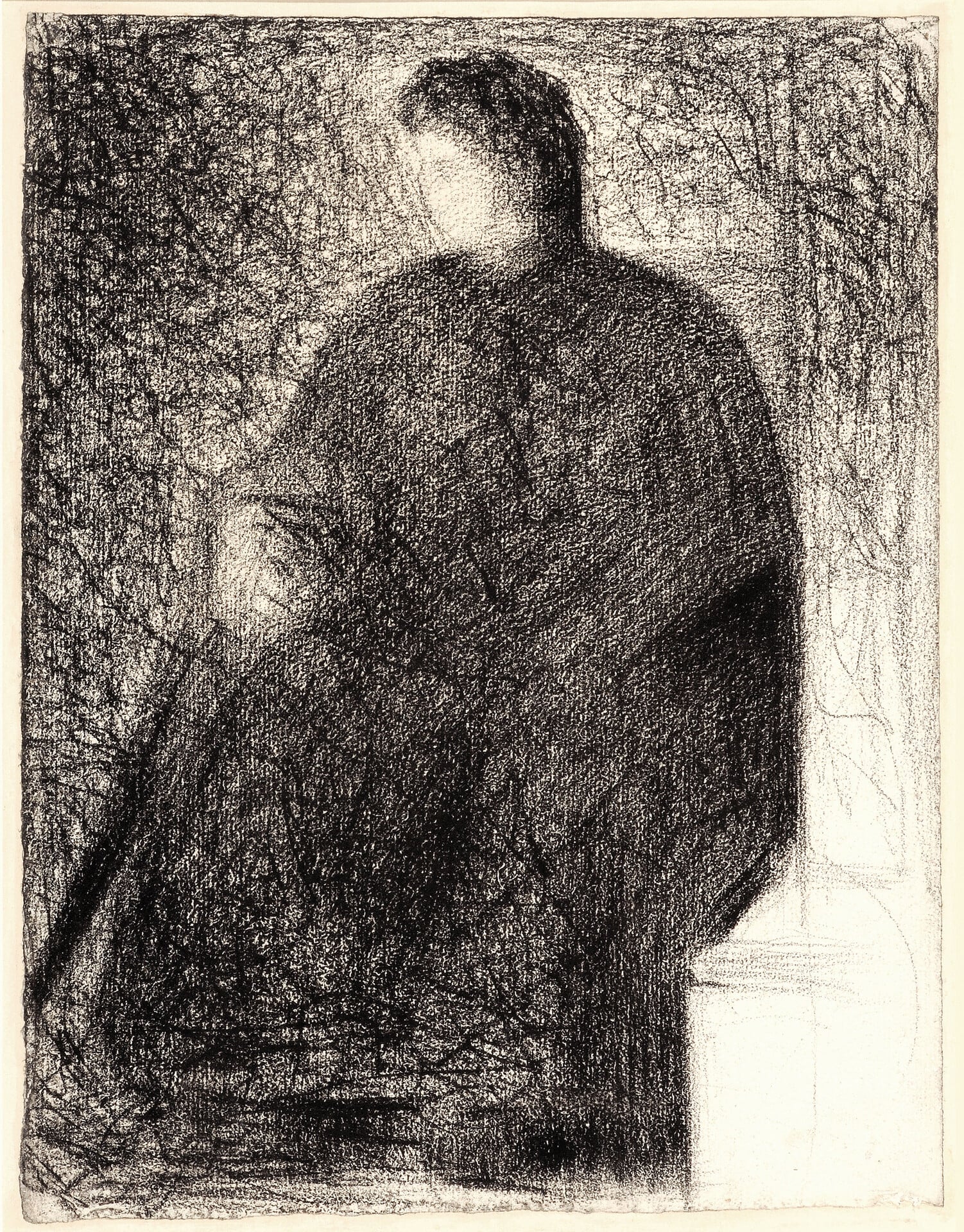 Η συλλογή της οποίας έργα φιλοξενούμε σε αυτή την έκθεση είναι η μεγαλύτερη συλλογή νεοϊμπρεσιονισμού που υπάρχει. Αυτό το έργο του Ζορζ Σερά είναι η αρχή του νεοϊμπρεσιονισμού ή πουαντιγισμού, όπως τον αποκαλούμε. Καταλαβαίνεις την αφετηρία αυτής της περιπέτειας, που παραδόξως ξεκινά από το ασπρόμαυρο, ξεκινά από το μολύβι. Ο Σερά από πολύ νέος καταλαβαίνει ότι θέλει να φέρει μια επανάσταση στην τέχνη κάνοντας το χρώμα να φανεί ακόμα πιο εντυπωσιακό· καταλαβαίνει ταυτόχρονα ότι για να το πετύχει αυτό, πρέπει πρώτα να δαμάσει το φως. Και γι’ αυτό, εντελώς συνειδητά, για τρία χρόνια διακόπτει κάθε επαφή με τη ζωγραφική και πιάνει το μολύβι, αφοσιώνεται στην τεχνική του κιαροσκούρο και κάνει αυτά τα απίθανα σχέδια, που αν τα κοιτάξει κάποιος προσεκτικά, αναρωτιέται πώς αναδύεται αυτή η μορφή από το πουθενά. Ο Σερά πέθανε στα 31 του χρόνια και δεν έχει αφήσει πολλά έργα. Τα περισσότερα βρίσκονται σε μουσεία, αυτά που υπάρχουν σε ιδιωτικές συλλογές είναι ελάχιστα και είναι συναρπαστικό το ότι μπορούμε να φέρουμε έναν Σερά στην Ελλάδα.
