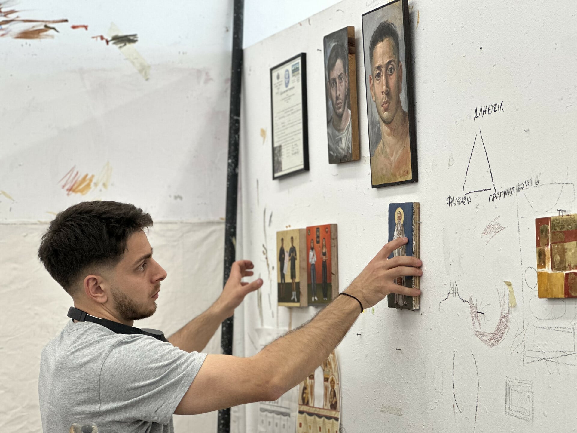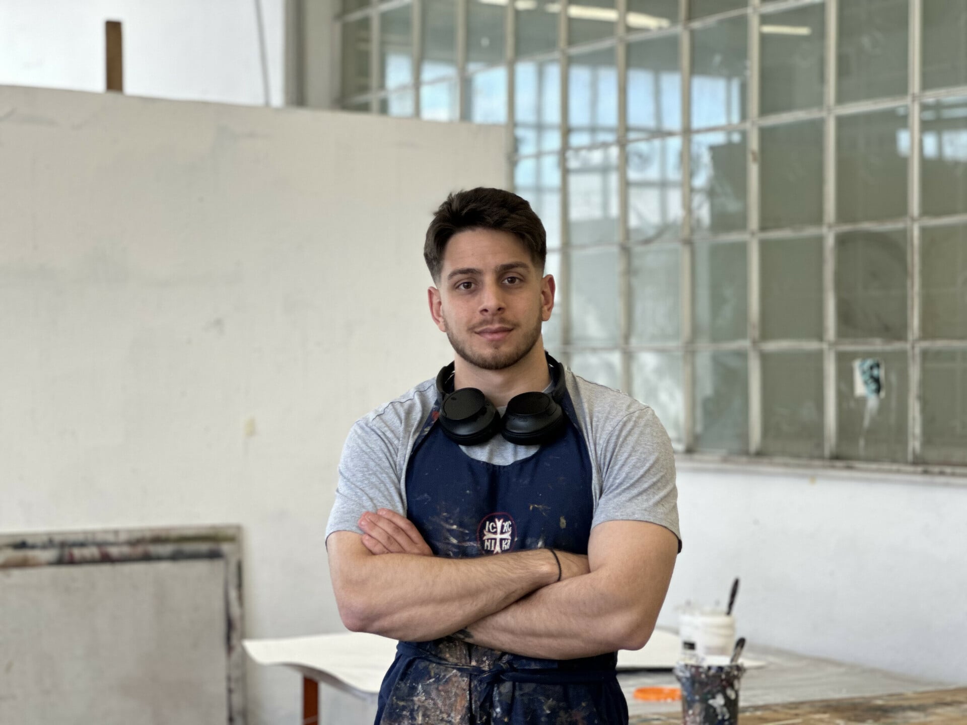 Σήμερα είναι φοιτητής στην Ανωτάτη Σχολή Καλών Τεχνών στην Αθήνα, όπου σπουδάζει ζωγραφική με ειδίκευση στη βυζαντινή ζωγραφική και την αγιογραφία. Ωστόσο, ο ίδιος αποφεύγει να περιορίσει τον εαυτό του σε έναν τίτλο. «Πρωτίστως προσπαθώ να είμαι ζωγράφος», τονίζει. «Δεν ξεχωρίζω τη ζωγραφική από την αγιογραφία. Για μένα είναι δύο πράγματα που πάνε μαζί». Αυτή η άρνηση να διαχωρίσει τις δύο μορφές έκφρασης δεν είναι απλώς μια αισθητική επιλογή. Είναι μια βαθύτερη στάση απέναντι στην τέχνη, που βλέπει την ενότητα εκεί όπου άλλοι βλέπουν κατηγορίες.
