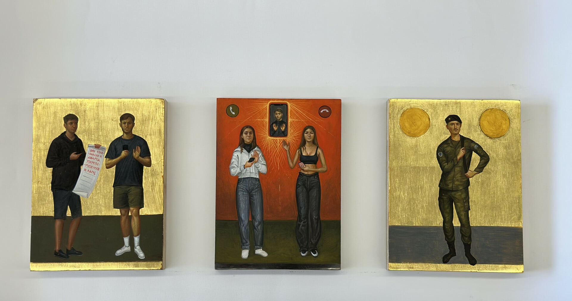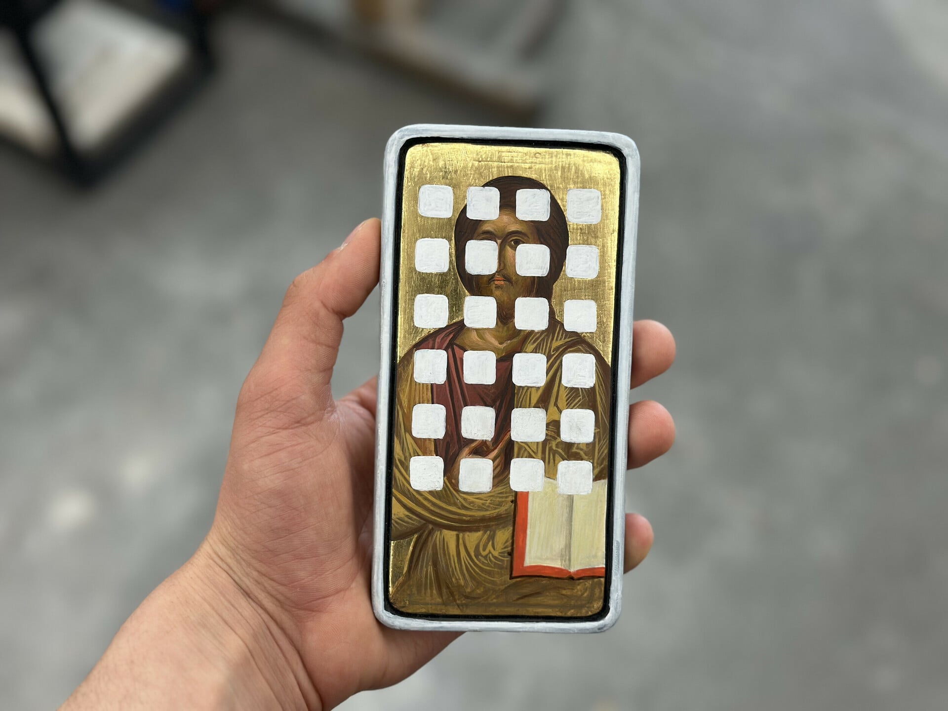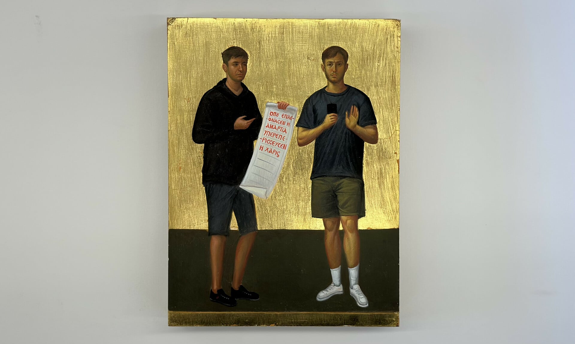 Ωστόσο, η σχέση του με την παράδοση δεν είναι στατική. Αντιθέτως, βρίσκεται σε διαρκή διάλογο με τη σύγχρονη πραγματικότητα. «Είμαι προϊόν της σύγχρονης κουλτούρας», παραδέχεται. Και αυτή η επίγνωση τον οδηγεί στο να ενσωματώνει στοιχεία τού σήμερα στη δουλειά του. Ένα χαρακτηριστικό παράδειγμα είναι ένα έργο που ετοιμάζει, όπου απεικονίζεται ο Χριστός «ως το φόντο στην οθόνη ενός κινητού και πίσω από τις εφαρμογές». Πρόκειται για μια εικόνα που φέρνει σε σύγκρουση –ή ίσως σε συνομιλία– το ιερό με το καθημερινό, το διαχρονικό με το ψηφιακό.