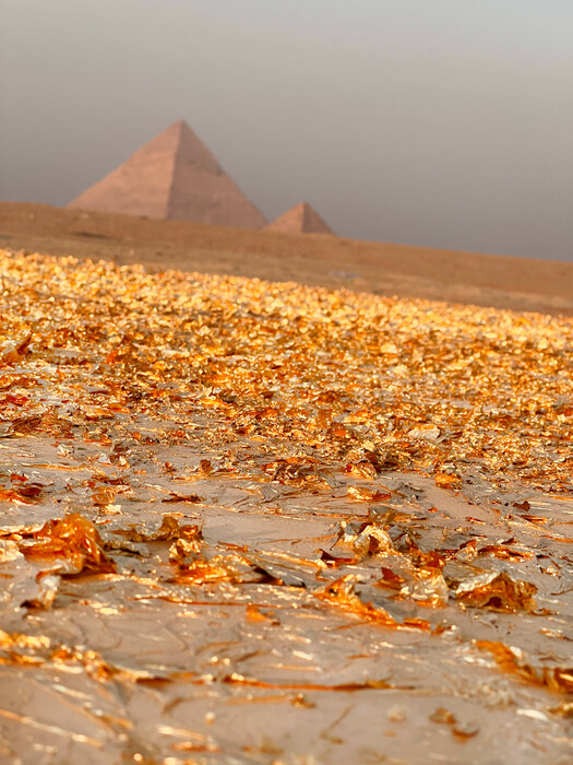 «Πηγαίνω καθημερινά στην έρημο και εφαρμόζω φύλλα χρυσού πάνω σε ένα χαλί τοποθετημένο στο έδαφος. Αυτό που είχα ετοιμάσει έμοιαζε με βωμό καλυμμένο με ένα λινό ύφασμα με φύλλα χρυσού». Όταν όμως το τοποθέτησε του φάνηκε φλατ και το χρυσό, έτσι όπως το είχε διπλώσει για τη μεταφορά, έμοιαζε πατικωμένο. Έτσι αποφάσισε να το χρυσώσει εκ νέου. Το χρύσωνε μία ολόκληρη μέρα, πήγε να κοιμηθεί και την επομένη, ό,τι είχε χρυσωθεί, είχε εξαφανιστεί, σαν να το είχε καταπιεί η έρημος. «Και τι έκανες;» ρωτάω με περιέργεια, σαν να βλέπω σαπουνόπερα.