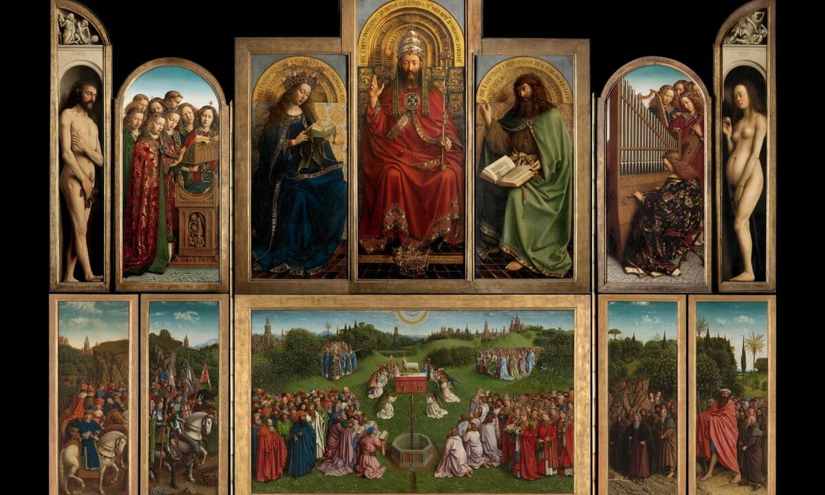 Οι λεπτομέρειες των συνθέσεων είναι συναρπαστικές. Η Εύα κρατά ένα μικρό κίτρο και στέκεται στα δεξιά του πολύπτυχου, ενώ ο Αδάμ στην αριστερή. Στην επάνω σειρά κυριαρχεί η Δέηση προς τον Θεό Πατέρα, που πλαισιώνεται από την Παναγία και τον Ιωάννη τον Βαπτιστή. Άγγελοι παίζουν μουσική, άγιοι, αμαρτωλοί, κληρικοί και στρατιώτες παρακολουθούν τη λατρεία του Αμνού του Θεού.