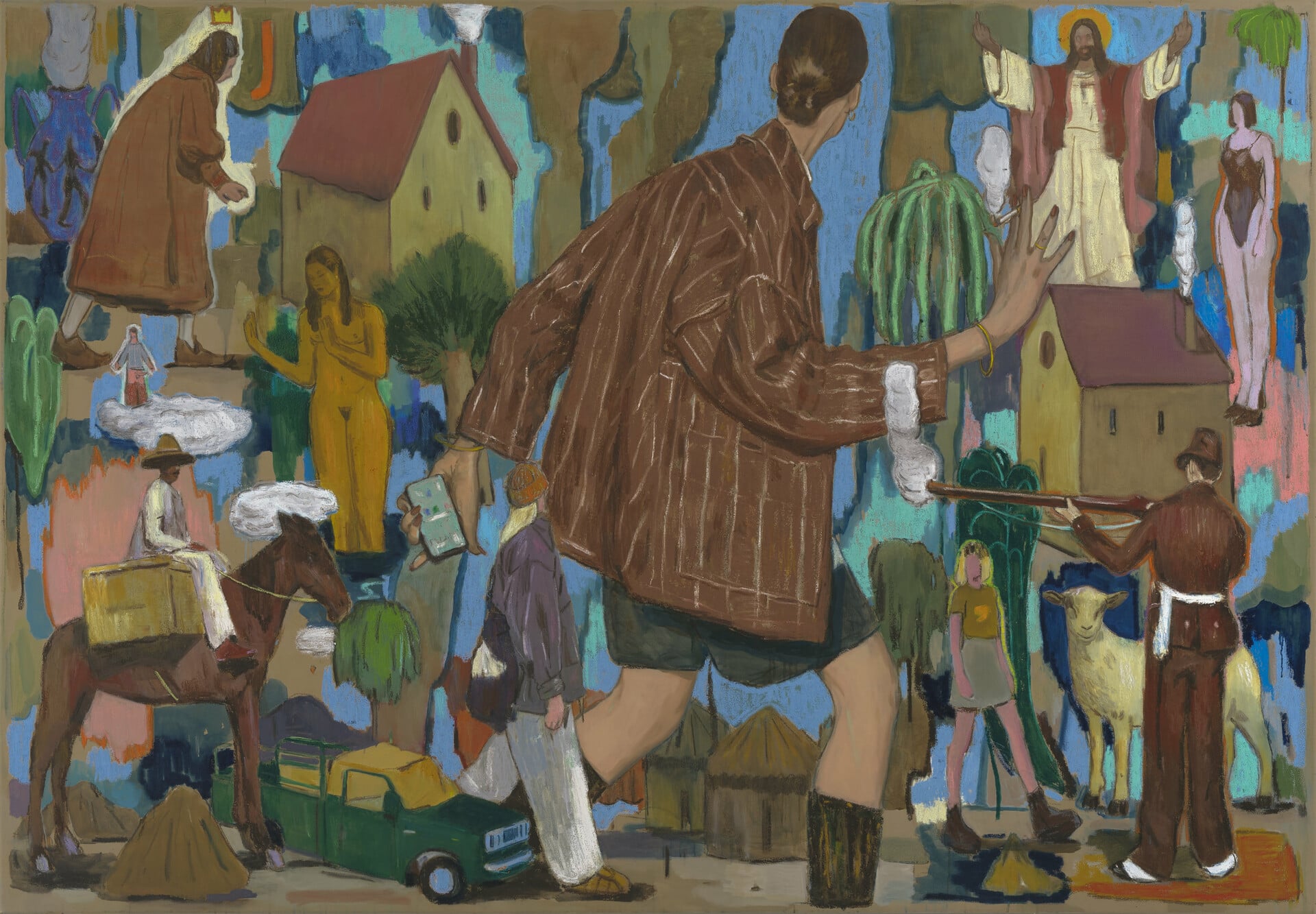 Είναι έντεκα μεγάλα τελάρα και περίπου είκοσι σχέδια Α3, όλα με λαδοπαστέλ. Η θεματική μου περιστρέφεται γύρω από την ανθρώπινη παρουσία μέσα σε μεταβατικά τοπία. Απεικονίζω φιγούρες με φυσικά και αστικά στοιχεία, αρχιτεκτονικά θραύσματα, σύμβολα και αντικείμενα που μοιάζουν να έρχονται από διαφορετικούς τόπους και χρόνους και συνυπάρχουν στην ίδια εικόνα. Τα θέματα γεννιούνται απ’ την περιπλάνηση, τη μνήμη και την ιστορία. Οι εικόνες κινούνται ανάμεσα στο αναγνωρίσιμο και το ονειρικό – φιγούρες, χειρονομίες, λαϊκές τελετουργικές αναφορές, στοιχεία της φύσης και της αστικής εμπειρίας μπλέκονται σε πολυεπίπεδες επιφάνειες. Κάθε έργο λειτουργεί ως ενδιάμεσος χώρος, όπου διαφορετικοί ρευστοί κόσμοι συναντιούνται.