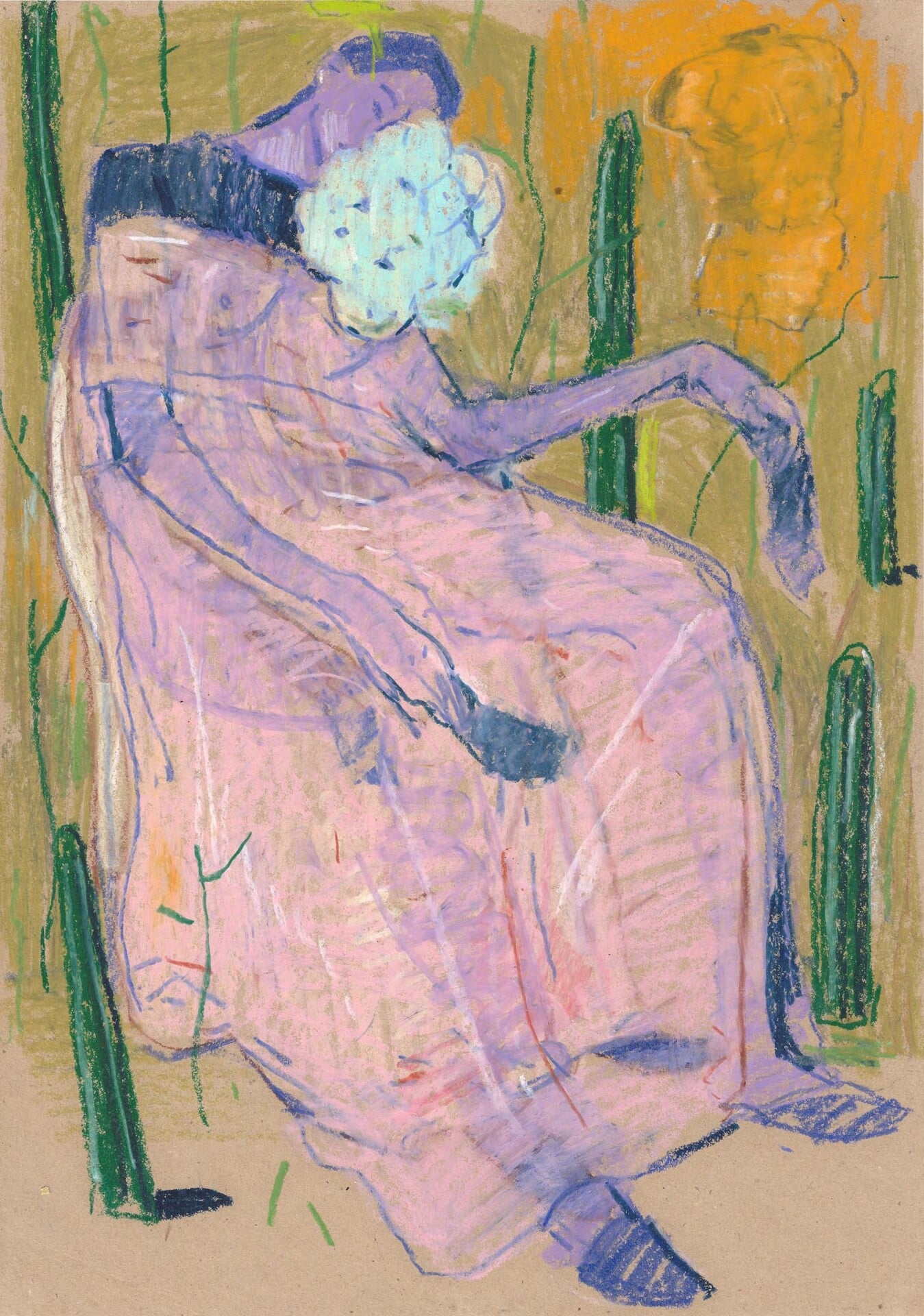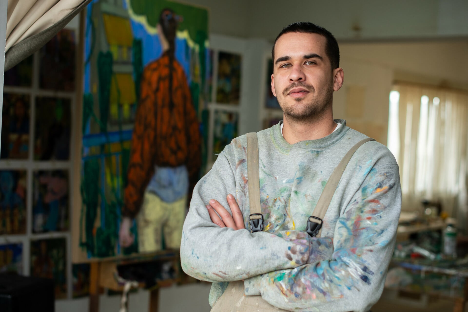 «Ζωγραφίζω από τότε που με θυμάμαι», λέει, δείχνοντάς μου τα σχέδια που γεμίζουν τον τοίχο του εργαστηρίου του. Είναι έργα μικρών διαστάσεων με λαδοπαστέλ, φτιαγμένα κατά τη διάρκεια των ταξιδιών του, τα οποία λειτουργούν ως βάση για τα μεγάλων διαστάσεων έργα που έχει φτιάξει για την έκθεση. «Στη Σχολή Καλών Τεχνών πήγα το 2009 και έκανα ζωγραφική και λίγο γλυπτική. Έκανα και γκράφιτι όταν πήγα στη σχολή. Τελείωσα το 2016 και επέλεξα να κάνω το Erasmus Placement, την πρακτική μου, στη Ρεϊνιόν. Αρχικά ήθελα να πάω στη Μαρτινίκα, αλλά δεν είχε Καλών Τεχνών, οπότε πήγα στη Ρεϊνιόν που είχα δει ότι είχε. Έκανα αίτηση, με δέχτηκαν και δούλεψα εκεί ως βοηθός καθηγητή για τέσσερις μήνες, γιατί για τόσο ήταν η πρακτική. Έμεινα όμως παραπάνω. Τους τέσσερις μήνες ζούσα με την υποτροφία του ΙΚΥ, αλλά μετά, που αποφάσισα να μείνω, έκανα πάρα πολλές δουλειές. Δούλεψα λίγο στη σχολή, πόζαρα, έκανα σκηνογραφία σε ένα θέατρο εκεί που με απασχόλησε αρκετό καιρό, δούλεψα σε ένα κέντρο με παιδιά με αυτισμό –τους έκανα μαθήματα καλλιτεχνικών–, έκοψα μπαμπού, μάζεψα φρούτα, και είχα μεροκάματο και απ’ τα κρουστά σε μια σχολή χορού· έκανα ό,τι μπορούσα. Ο λόγος που ήθελα να πάω στην Αφρική ήταν επειδή ήδη είχα αναπτύξει μια έρευνα για την αποικιοκρατία και τη μετα-αποικιοκρατία, και θεώρησα πως το καλύτερο μέρος για να το κάνω αυτό ήταν η Ρεϊνιόν. Έχω κάνει αρκετά ταξίδια στην Αφρική, έχω πάει δύο φορές στη Σενεγάλη, στη Μοζαμβίκη, στη Νότια Αφρική, στον Μαυρίκιο, στις Κομόρες, έχω γυρίσει αρκετά εκεί.