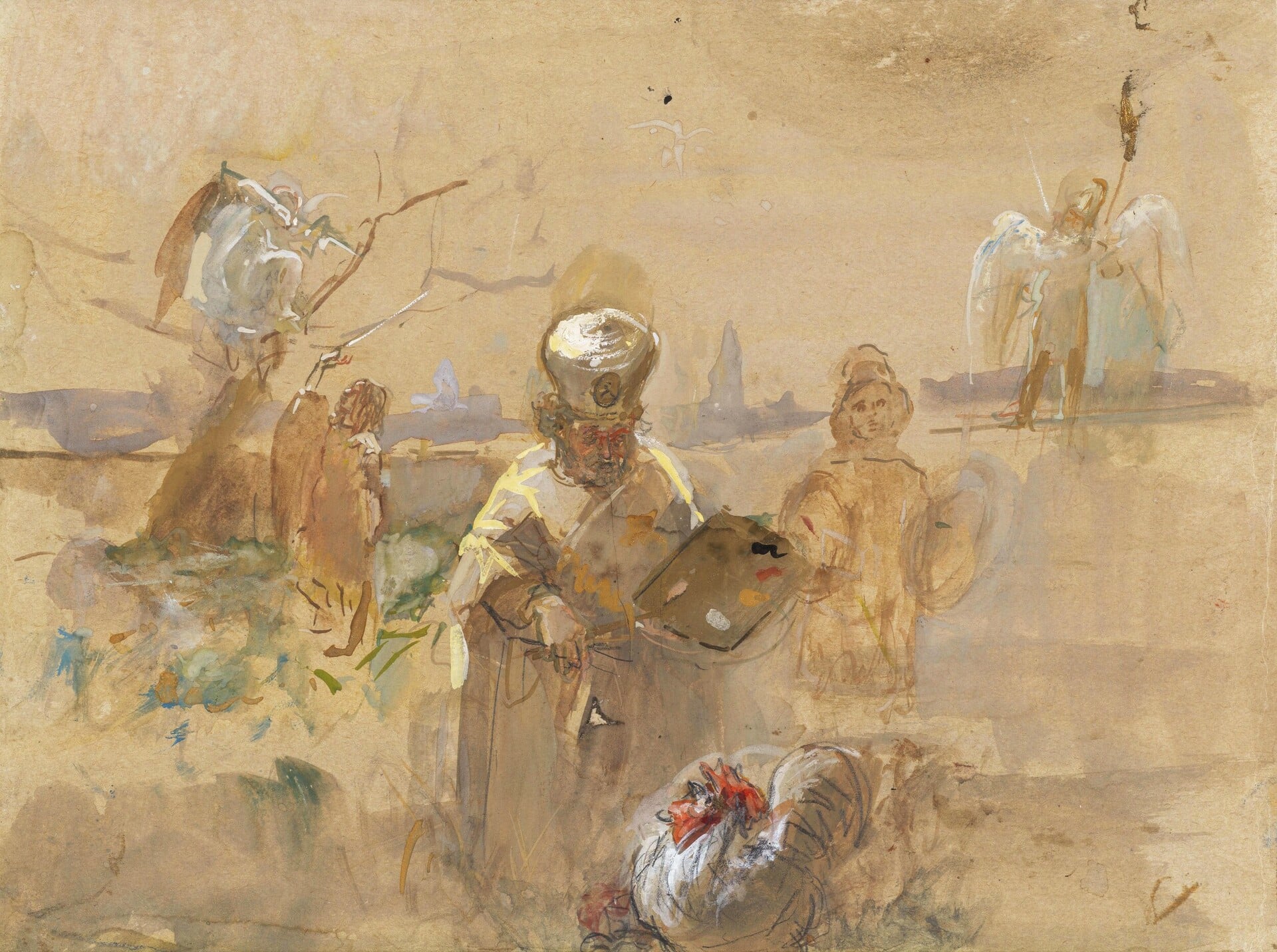 Ο Γιάννης Τσαρούχης στον κήπο του σπιτιού του στο Méru με άμφια επισκόπου και μίτρα, 1971. Γκουάς σε χαρτί, 23 x 31,2 εκ.. Προέλευση: Συλλογή Γιώργου Τουρκοβασίλη