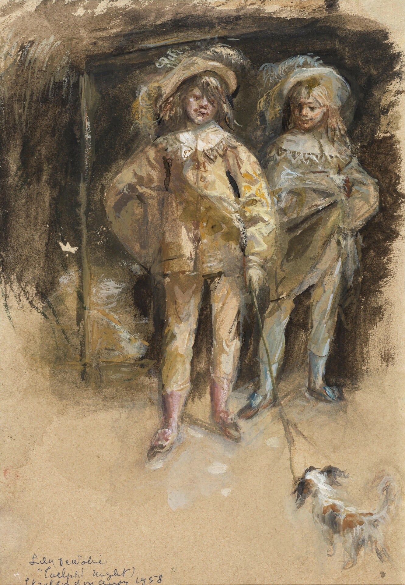 «Δωδέκατη νύχτα», 1958. Κωμωδία σε πέντε πράξεις του Ουίλλιαμ Σαίξπηρ. Σκηνοθεσία: Πίτερ Χολ, Στράτφορντ, Shakespeare Memorial Company. Ο Σεμπάστιαν και η δίδυμη αδερφή του, Βιόλα, μεταμφιεσμένη σε άνδρα. Γκουάς σε χαρτί, 26,6x18,7 εκ. Προέλευση: Συλλογή Ζαν-Κλοντ Μπριάλ