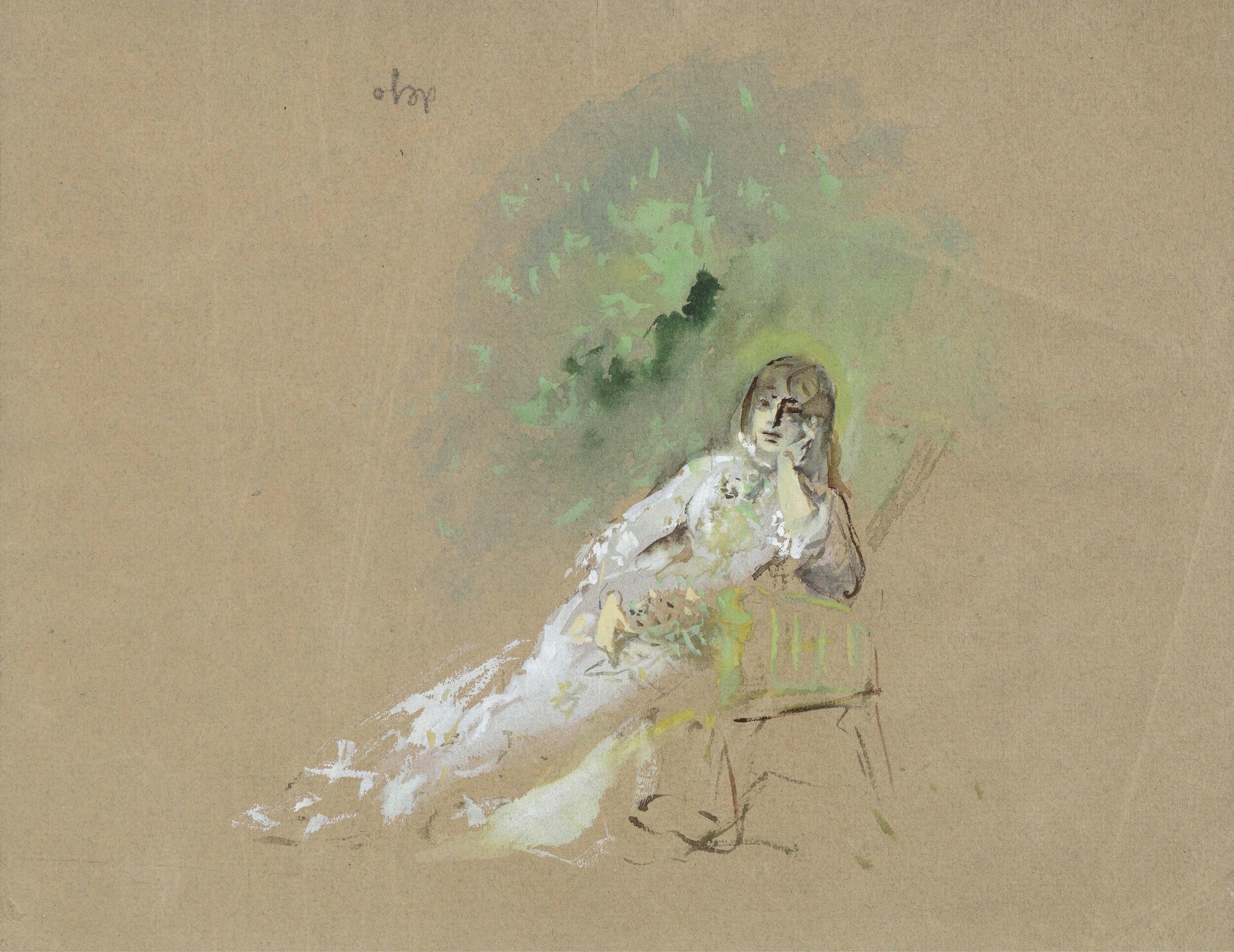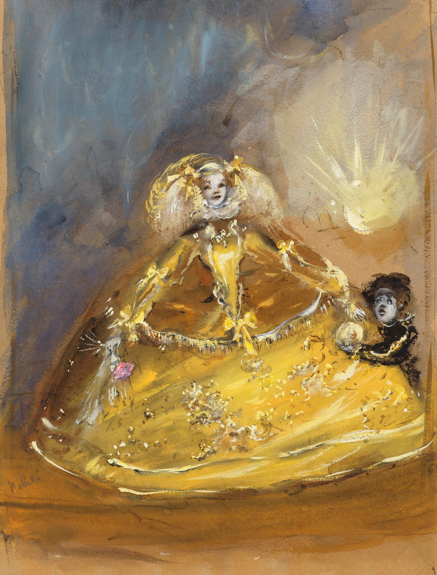 Η Μαρία Κάλλας με το κοστούμι της Β' Πράξης (Σκηνή Ι), εμπνευσμένο από τον πίνακα του Ρενουάρ, «Η Κούνια» («La Balançoire»). Γκουάς σε χαρτί, 23,5 x 30 εκ.. Προέλευση: Συλλογή Ζαν-Κλωντ Μπριαλύ
