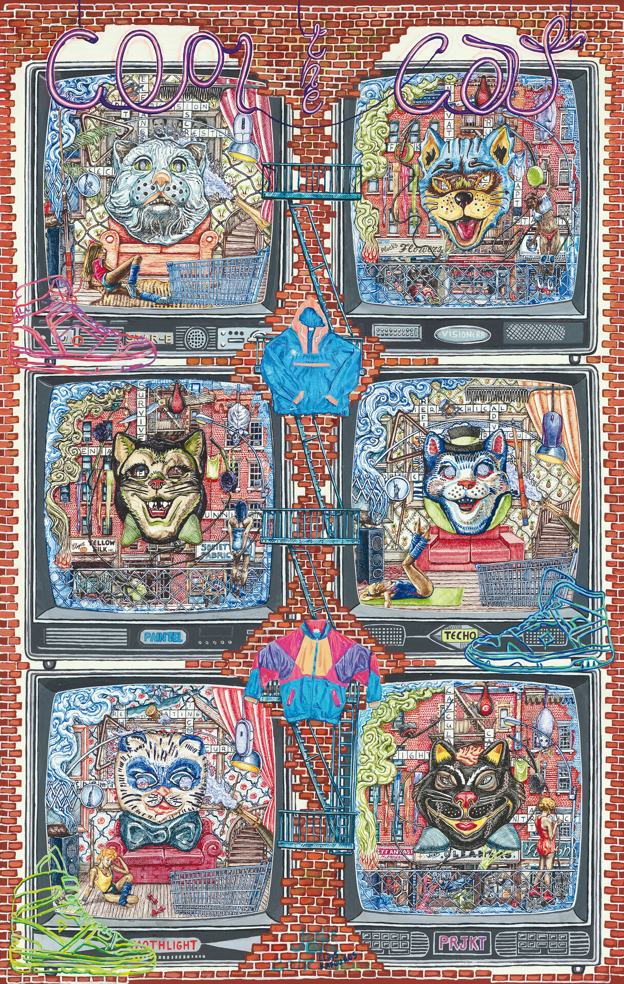Γεμάτος με εργαλεία, μελάνια, μισοτελειωμένα έργα και άλλα έτοιμα, τυλιγμένα με πλαστικά να στέκονται γερμένα στους τοίχους, άπειρες σημειώσεις. Τα παράθυρα και οι μπαλκονόπορτές του κοιτάνε σε ακάλυπτους πολυκατοικιών, στα διαμερίσματα απέναντι.