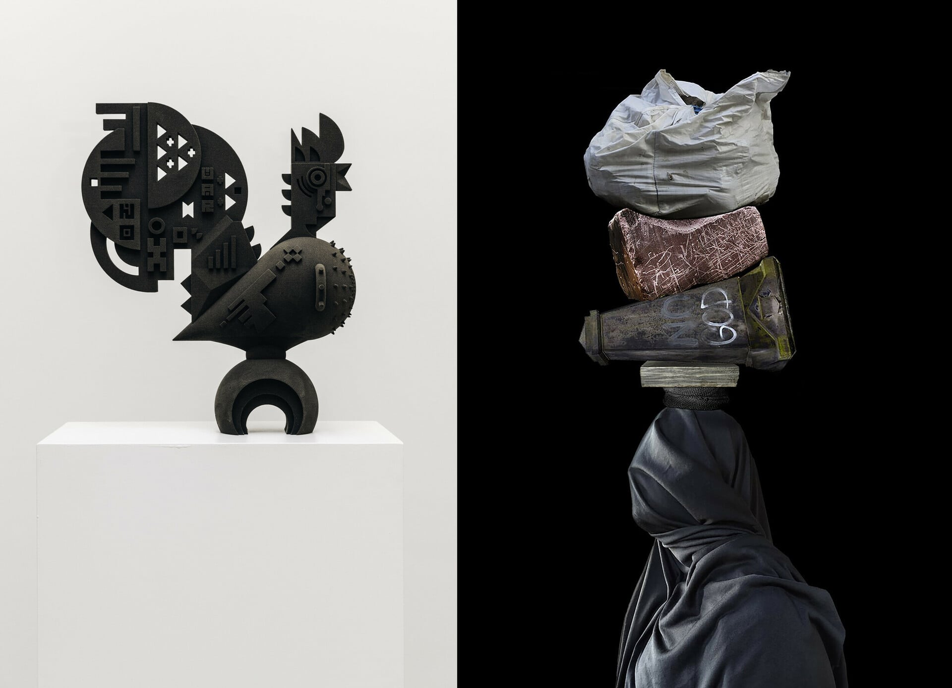Ο κόκορας, που τον ονομάσαμε «Rise Up» –«Αφυπνίσου» ή «Ανασηκώσου» στα ελληνικά–, είναι βγαλμένος στην ουσία μέσα από ένα χαλί που είχαμε φτιάξει στη Ριζάρειο Σχολή, το οποίο λέγεται «Democracy dies in darkness». Πρόκειται για το μότο της εφημερίδας «Washington Post», που είναι πολύ παλιό, πριν και από το αμερικανικό σύνταγμα, και σημαίνει ότι η δημοκρατία πεθαίνει στο σκοτάδι. Δηλαδή θέλουμε φως για να έχουμε δημοκρατία, με τη μεταφορική έννοια. Σε αυτό το χαλί υπάρχουν δύο κοκόρια, τα οποία είναι ένα παραδοσιακό σύμβολο διαφόρων πολιτισμών. Στην Ελλάδα θυσιάζουμε έναν κόκορα στα θεμέλια ενός σπιτιού, γιατί στην ουσία είναι αποτρεπτικό σύμβολο. Είναι το σύμβολο της αναγέννησης, η ζωή κατά του θανάτου. Οι Γάλλοι το έχουν ως σύμβολο δημοκρατίας. Αυτά τα δύο κοκόρια μάς οδήγησαν σε αυτό το γλυπτό. Θελήσαμε να ζωντανέψουν, το σκεφτήκαμε και είπαμε «ας αρχίσουν τα χαλιά να γεννάνε γλυπτά που βγαίνουν στον χώρο». Μας ενδιέφερε και η αντίστιξη, γιατί δεν μπορούμε να αρνηθούμε ότι είμαστε άνθρωποι της εποχής μας και της τεχνολογίας. Θέλαμε να κάνουμε μια αντίστιξη μεταξύ της αργής υφαντικής τέχνης, που είναι ο κορμός του έργου, και της σύγχρονης τεχνικής της ψηφιακής εκτύπωσης. Μάλιστα, έχουμε χρησιμοποιήσει πούδρα χαλαζία. Σχεδιάστηκε σε ένα πολύ σύγχρονο εργαστήριο στη Γερμανία, το δισδιάστατο έγινε τρισδιάστατο, ζυγίστηκε για να είναι η στατική του σωστή και εκτυπώθηκε στο τέλος σε αυτό το υλικό. Έτσι έχεις το νήμα και έχεις και ένα ορυκτό.