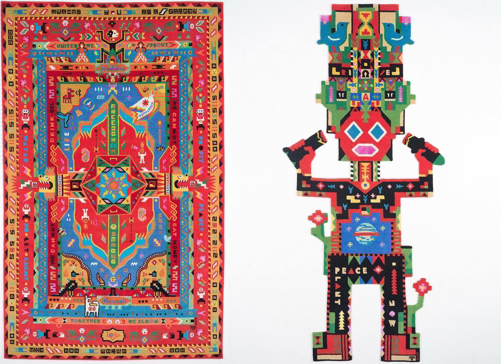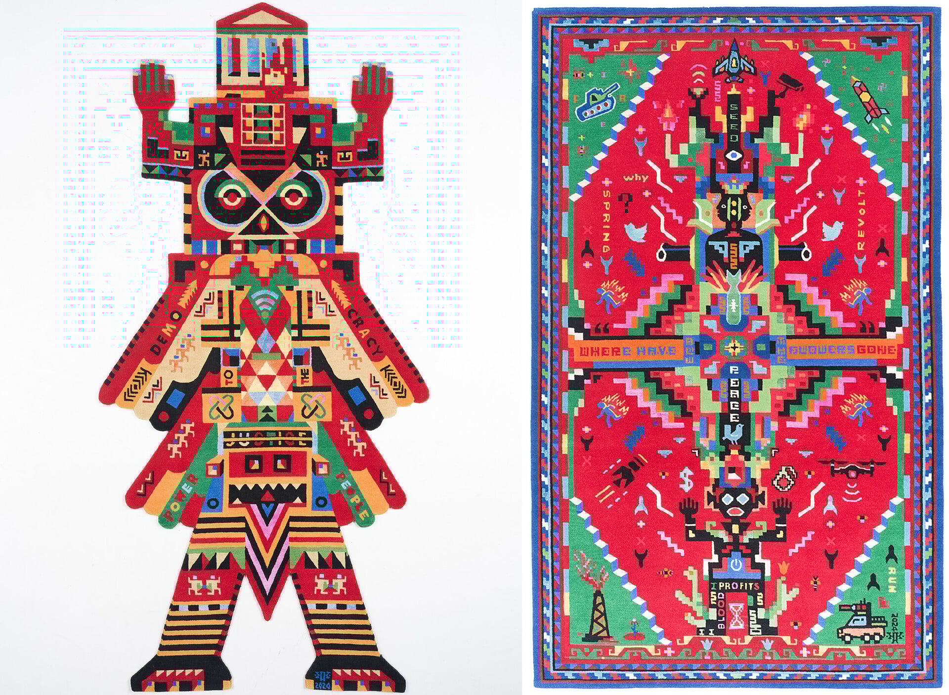 Ακριβώς. Έχεις το νήμα, τον κόμπο και το πίξελ, που χρειάζεται στην υφαντική με αργαλειό, γιατί όλα αυτά τα χαλιά έχουν παραχθεί σε συνεργασία με υφάντρες και υφαντές στα Γιάννενα και στο Νεπάλ. Ξεκινάμε από έναν λευκό καμβά.