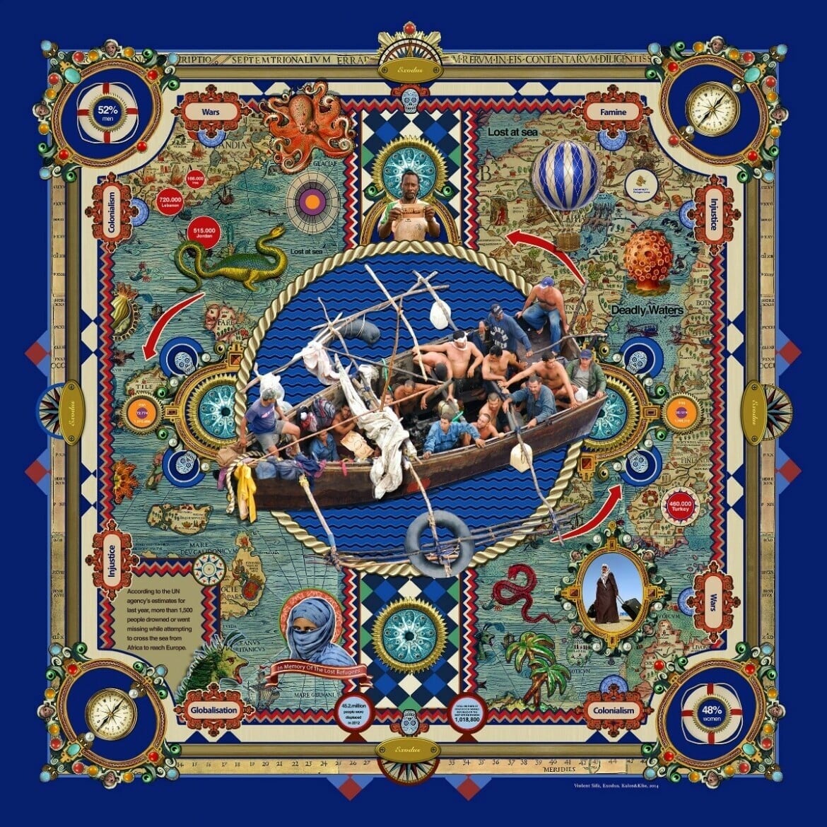 Η πιο σκληρή. Από εδώ γεννήθηκαν όλα αυτά, από εδώ πήγαμε στα χαλιά. Είναι τυπωμένα πάνω σε μετάξι όλα αυτά, σε συνεργασία με το Σουφλί και τη λίμνη Κόμο στην Ιταλία. Είναι ιδιαίτερα πολύχρωμα και όμορφα εικαστικά σε πρώτο επίπεδο, κάτι που χρησιμοποιούμε πολύ στη δουλειά μας. Η πρώτη ανάγνωση και η εμβάθυνση, zoom in και zoom out. Ουσιαστικά τα ονομάζουμε «νοητικές παγίδες». Υπάρχει πάντα το στοιχείο της ομορφιάς, το οποίο ελκύει το βλέμμα και όταν πας κοντά θα πιαστείς σε αυτό τον όμορφο ιστό, στον οποίο αφηγούμαστε πάρα πολύ σκοτεινές ιστορίες. Και πολιτικές.