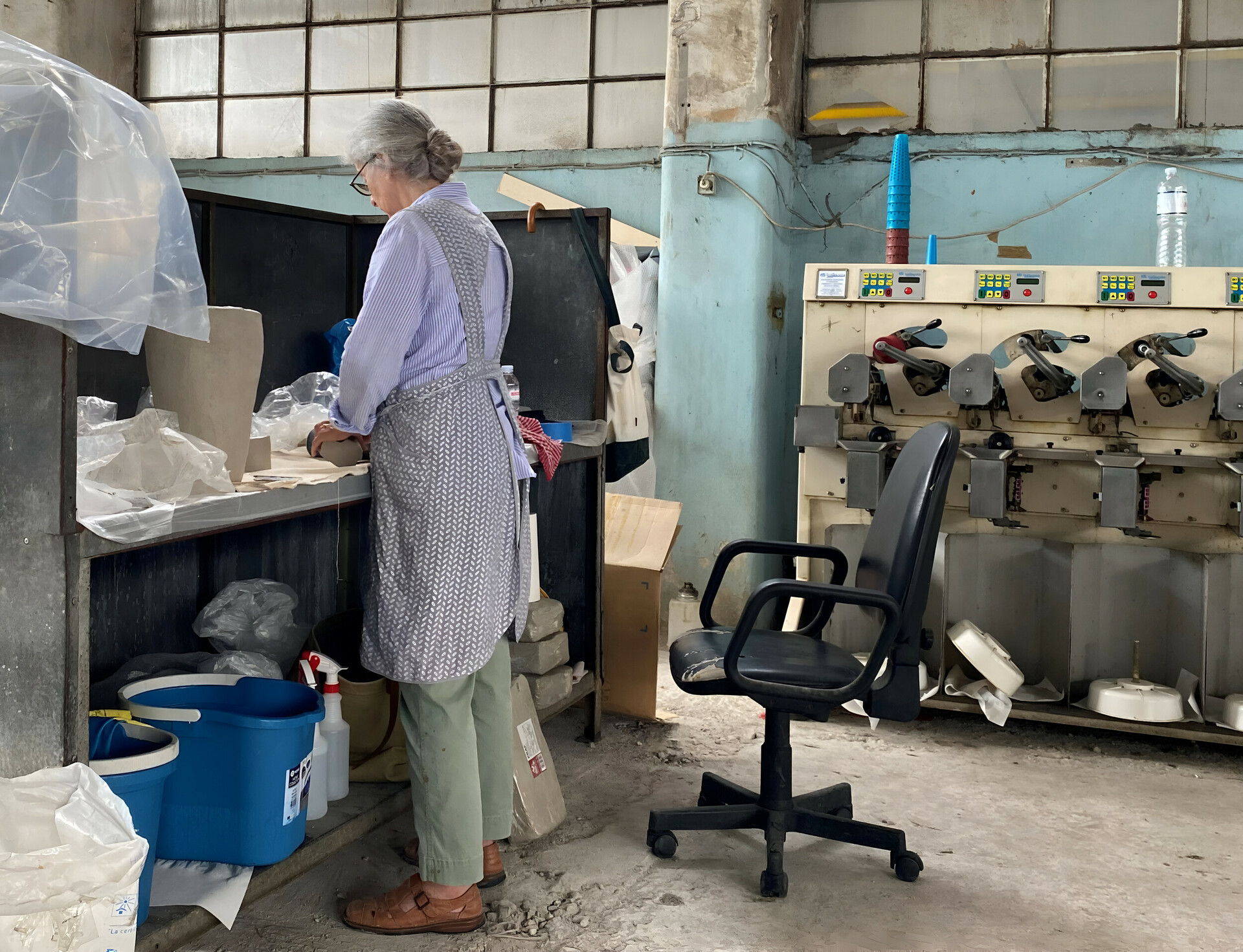 Ενώ ξεναγούμαι στους διάφορους χώρους στους οποίους θα παρουσιαστούν τα έργα των καλλιτεχνών, σταματάω για να δω τη Sandra Osborne μέσα στα βαφεία να επεμβαίνει με εφήμερα γλυπτά από πηλό και να έρχεται σε διάλογο με τη στιβαρότητα ενός μηχανήματος επεξεργασίας νήματος.