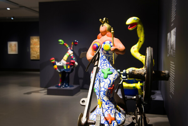 Κυριαρχούν, όπως είναι αναμενόμενο, τα μπλε έργα του Yves Klein, π.χ. ένα relief του φίλου του και γυμνού Arman, η Νίκη της Σαμοθράκης, η Μπλε Αφροδίτη (Αφροδίτη της Αλεξάνδρειας), ένας πύρινος πίνακας που έκανε λίγο πριν πεθάνει (καμένο χαρτόνι με φλόγιστρο σε ξύλο), και μια σειρά από πολύχρωμα εμβληματικά έργα της Niki de Sain Phalle όπως το παγκάκι, μια αντρική φιγούρα που διαβάζει εφημερίδα με ελληνικά γράμματα (χάρη στη συμβολή της φίλης της εικαστικού και σκηνογράφου Μαρίνας Καρέλλα), ένας φωτιστικός ιπποπόταμος, μια πολυθρόνα-φίδι, το βάζο-Άγγελος, η Αθηνά Παλλάδα ή το άρμα που έκανε σε συνεργασία με τον Jean Tinguely. Επίσης, τα φωτογράμματα-αργυροτυπίες του Raymon Hains, όπως και οι σκισμένες αφίσες του πάνω σε λαμαρίνες, αρκετές αφίσες των François Dufrêne, Jacques Villeglé και Mimmo Rotella, αντικείμενα σε πλεξιγκλάς του Arman, το μπρούντζινο Homage à Léon, η «επέκταση» καρέκλας, το στήθος από ρητίνη του César, ένα παντατίφ από «συμπίεση» κοσμημάτων της Ελίζας Γουλανδρή και ο αντίχειρά της σε μπρούντζο από τον ίδιο καλλιτέχνη –το ζεύγος των συλλεκτών διατηρούσε φιλική σχέση με τον César–, καθώς και μια «συμπίεση» τενεκέδων. Άλλα έργα που εκτίθενται είναι ένα από τα πρώτα του Christo, το περιτυλιγμένο καροτσάκι, μια συσκευασία αλλά και σχέδιο περιτυλιγμένης ακτής έξω από το Σίδνεϊ, ο μουσαμάς σήμανσης του αμερικανικού στρατού και ο Ιπτάμενος Barney του Gérard Deschamps, τα κάπως ποπ έργα «Pamela Beach» και «Metro» του Martial Ray, ένα δείγμα της σειράς «Τριπλός Πολλαπλασιαστής Τέχνης» του Daniel Spoerri και ευφάνταστες μεταλλικές κατασκευές του Tinguely, όπως το Φωτιστικό και το Κηροπήγιο από τη σειρά «Συγκολλημένα Γλυπτά».