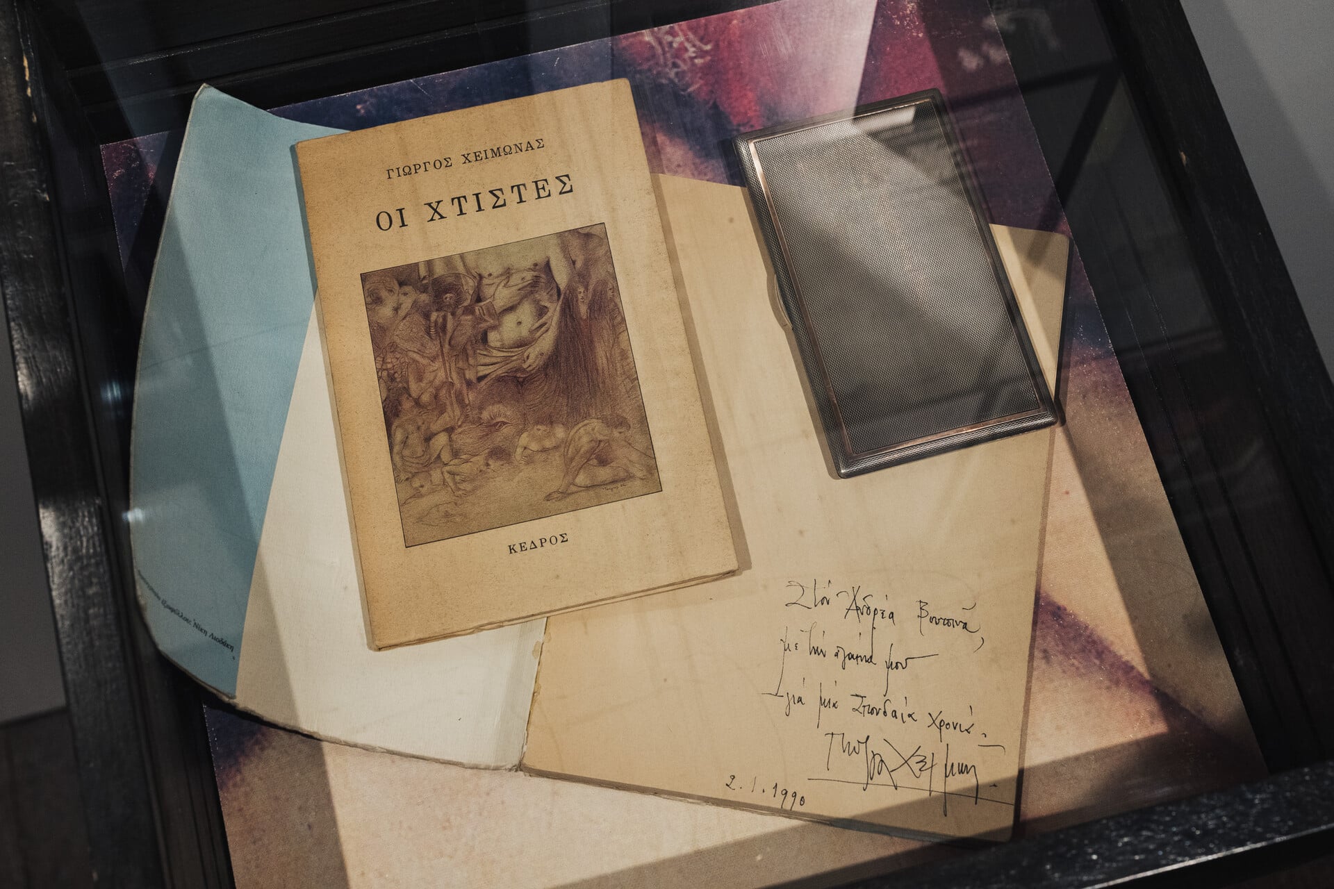 Ασημένια ταμπακέρα του Γιώργου Χειμωνά. Όταν ο Ανδρέας Βουτσινάς σκηνοθέτησε σε μορφή αναλογίου τους «Χτίστες» στην Πάτρα το 2006, στο πλαίσιο του θεσμού της Πολιτιστικής Πρωτεύουσας της Ευρώπης, είχε τοποθετήσει ένα βαρέλι όπου έκαιγε φωτιά, μέσα στο οποίο οι ηθοποιοί Λυδία Φωτοπούλου, Φιλαρέτη Κομνηνού και Κωνσταντίνος Κωνσταντόπουλος πετούσαν κάθε σελίδα αφού τη διάβαζαν. Ο Χειμωνάς πλησίασε εντυπωσιασμένος τον σκηνοθέτη μετά την παράσταση και του είπε: «Να σας ρωτήσω κάτι, κύριε Βουτσινά, πού ξέρετε ότι καίω ό,τι δεν δημοσιεύω;». Κι έβγαλε την ασημένια του ταμπακέρα και του τη χάρισε. Φωτ.: Πάρις Ταβιτιάν/LIFO