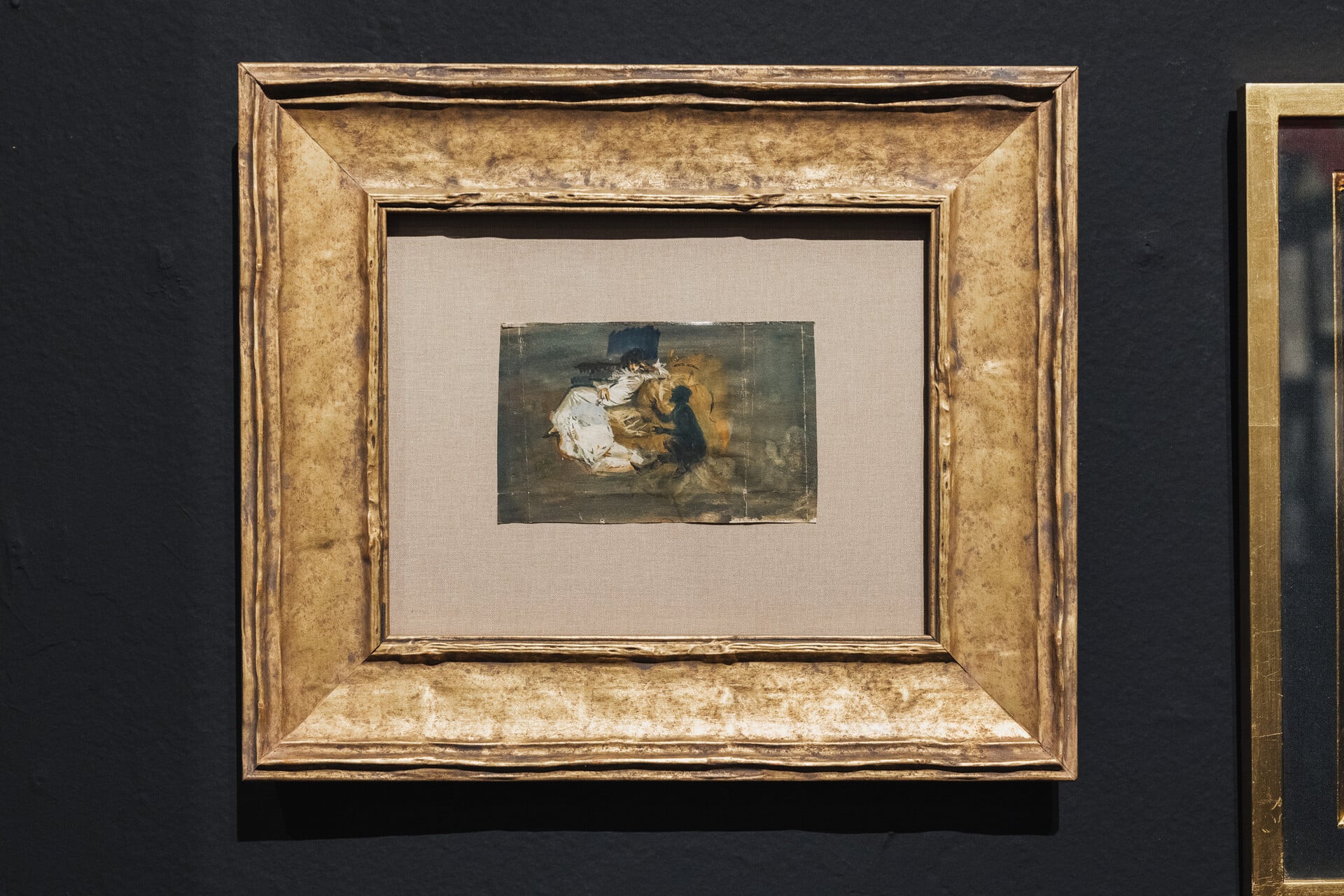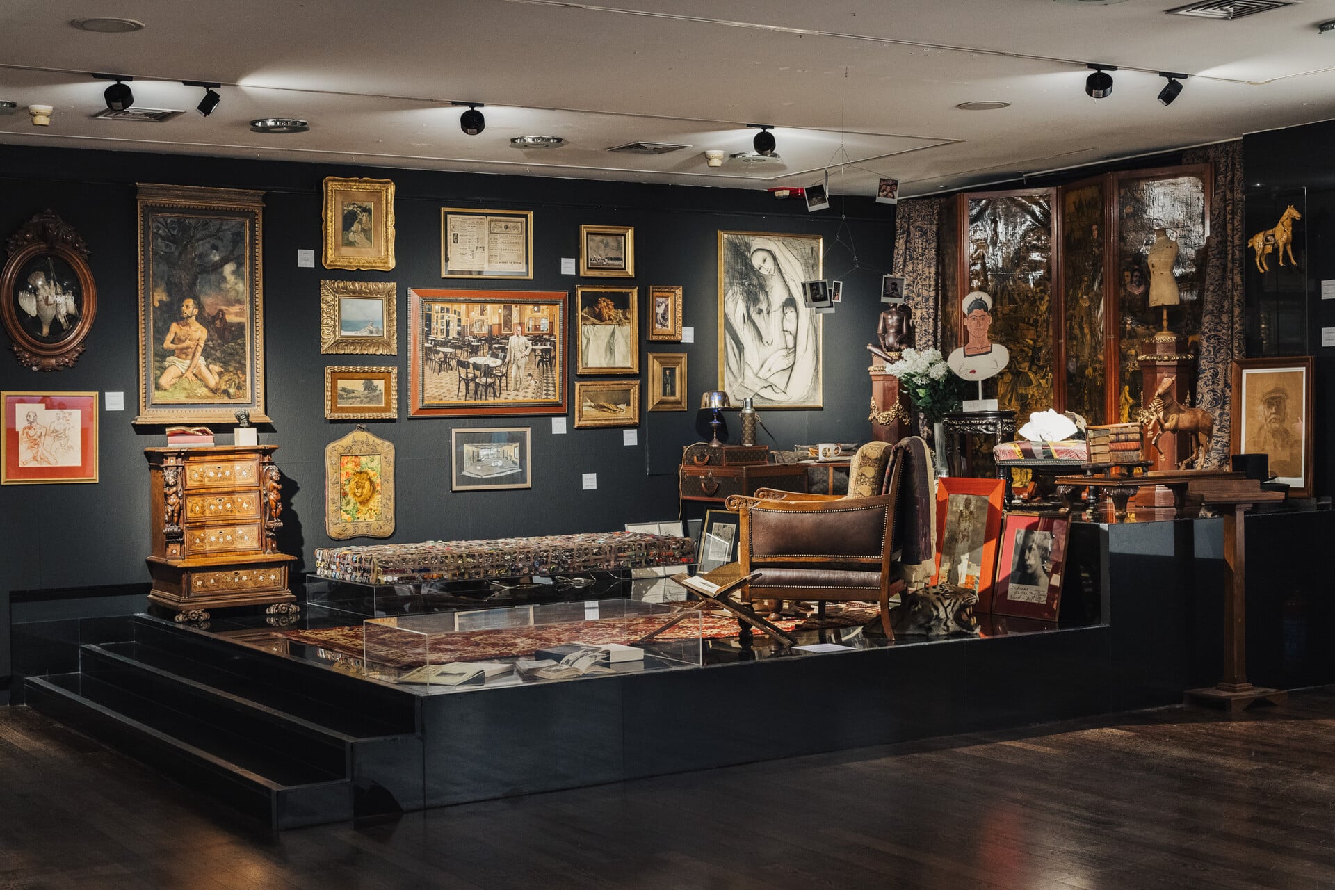 Ανάμεσα στα δέκα αριστουργήματα της θρυλικής σκηνογράφου Λίλα Ντε Νόμπιλι ξεχωρίζει ένα μικρό έργο το οποίο μιμείται τον διάσημο πίνακα του Ζορζ Κλερέν, όπου η Σάρα Μπερνάρ είναι ξαπλωμένη σε ένα ανάκλιντρο με έναν σκύλο. Μπροστά της η μαύρη φιγούρα του Βουτσινά τής διδάσκει τον ρόλο. Φωτ.: Πάρις Ταβιτιάν/LIFO