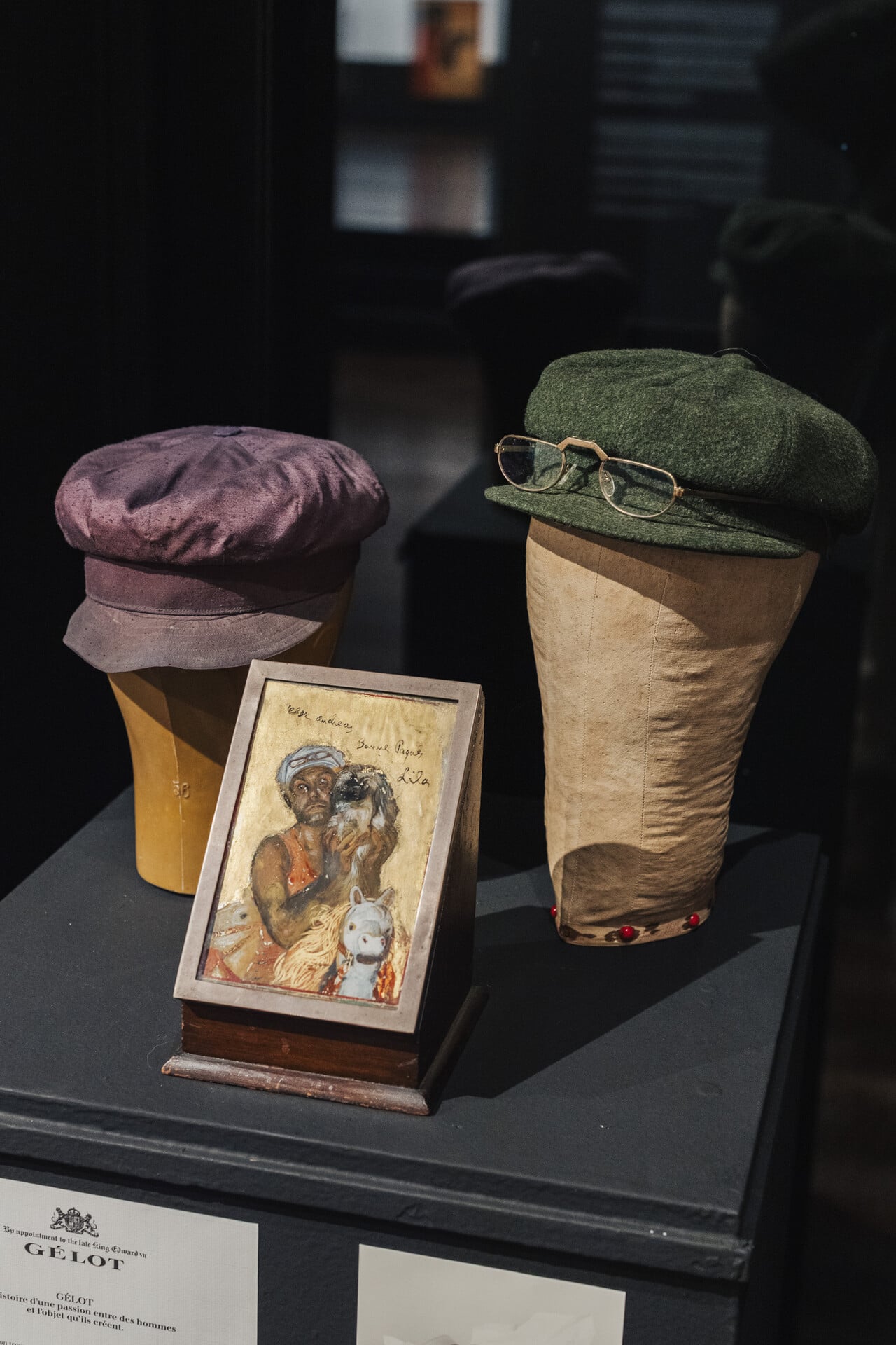 Τα περίφημα κασκέτα του Βουτσινά που παράγγελνε από την ιστορική πιλοποιία Gélot χρησιμοποιώντας το ύφασμα του κοστουμιού που έραβε κάθε φορά. Στο τέλος, η ιστορική επιχείρηση ονόμασε τον συγκεκριμένο τύπο κασκέτου «AVS» από τα αρχικά του ονόματός του. Συμπληρώνεται από μια ζωγραφιά της Λίλα Ντε Νόμπιλι όπου εικονίζεται ο ίδιος να φορά κασκέτο και η αγαπημένη του σκυλίτσα Μίκα. Φωτ.: Πάρις Ταβιτιάν/LIFO