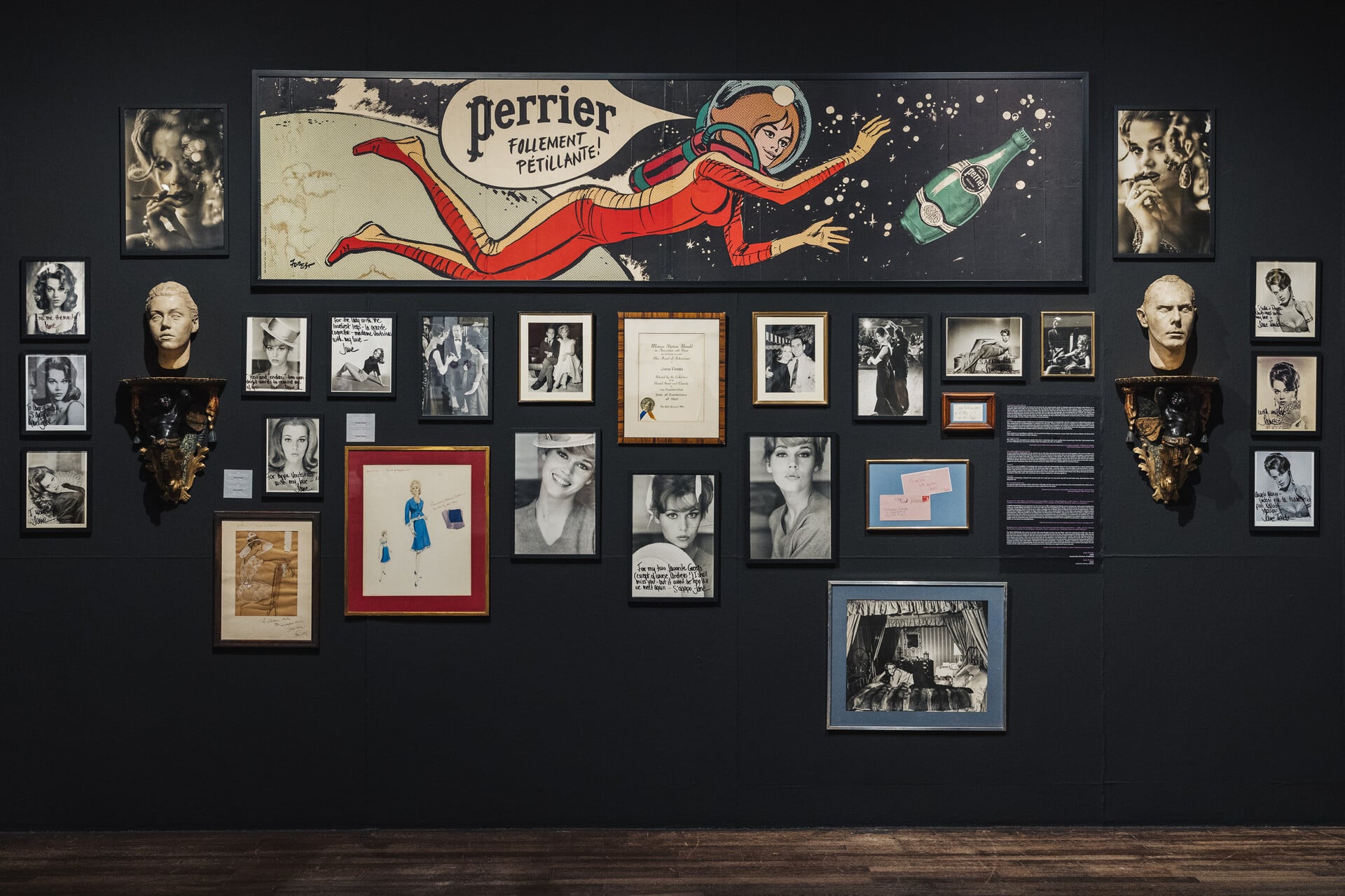 Διαφήμιση των ιαματικών νερών Perrier με την Τζέιν Φόντα ως αστροναύτισσα Μπαρμπαρέλα από την ομώνυμη ταινία του Ροζέ Βαντίμ του 1968, στην οποία πρωταγωνιστούσε. Κάτω: Φωτογραφίες της Φόντα, ανάμεσά τους κάποιες αφιερωμένες «στους δύο πιο αγαπημένους της Έλληνες», όπως λέει, εκτός του Ανδρέα, τον Μάριο και τη γιαγιά του, η οποία τη φιλοξένησε στο σπίτι της στην Κυψέλη όταν γύριζε εδώ το «Διακοπές στην Αθήνα». Μάλιστα η αφιέρωση γράφει: «To the lady with the loveliest legs», ενώ μια άλλη: «Na me thymaste, Jane». Ο αφιερωμένος στην Αμερικανίδα ηθοποιό τοίχος συμπληρώνεται από δύο εκμαγεία της ίδιας και του Ανδρέα Βουτσινά από το 1962, φτιαγμένα με αφορμή την πρώτη τους συνεργασία στο Μπρόντγουεϊ, στο «Fun Couple» των Neil Jansen και John Haase στο Lyceum Theatre. Φωτ.: Πάρις Ταβιτιάν/LIFO