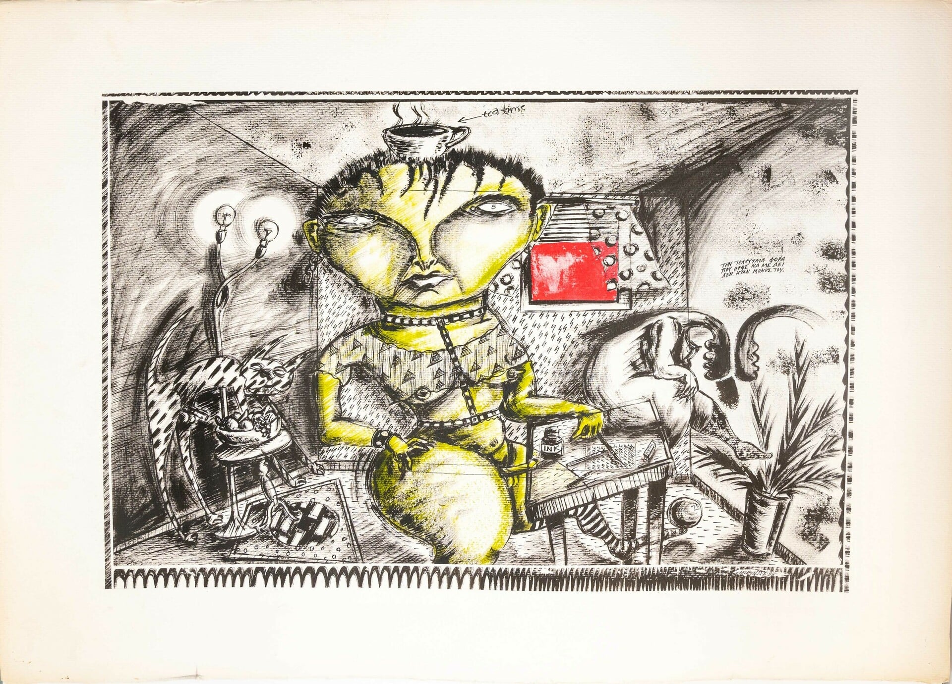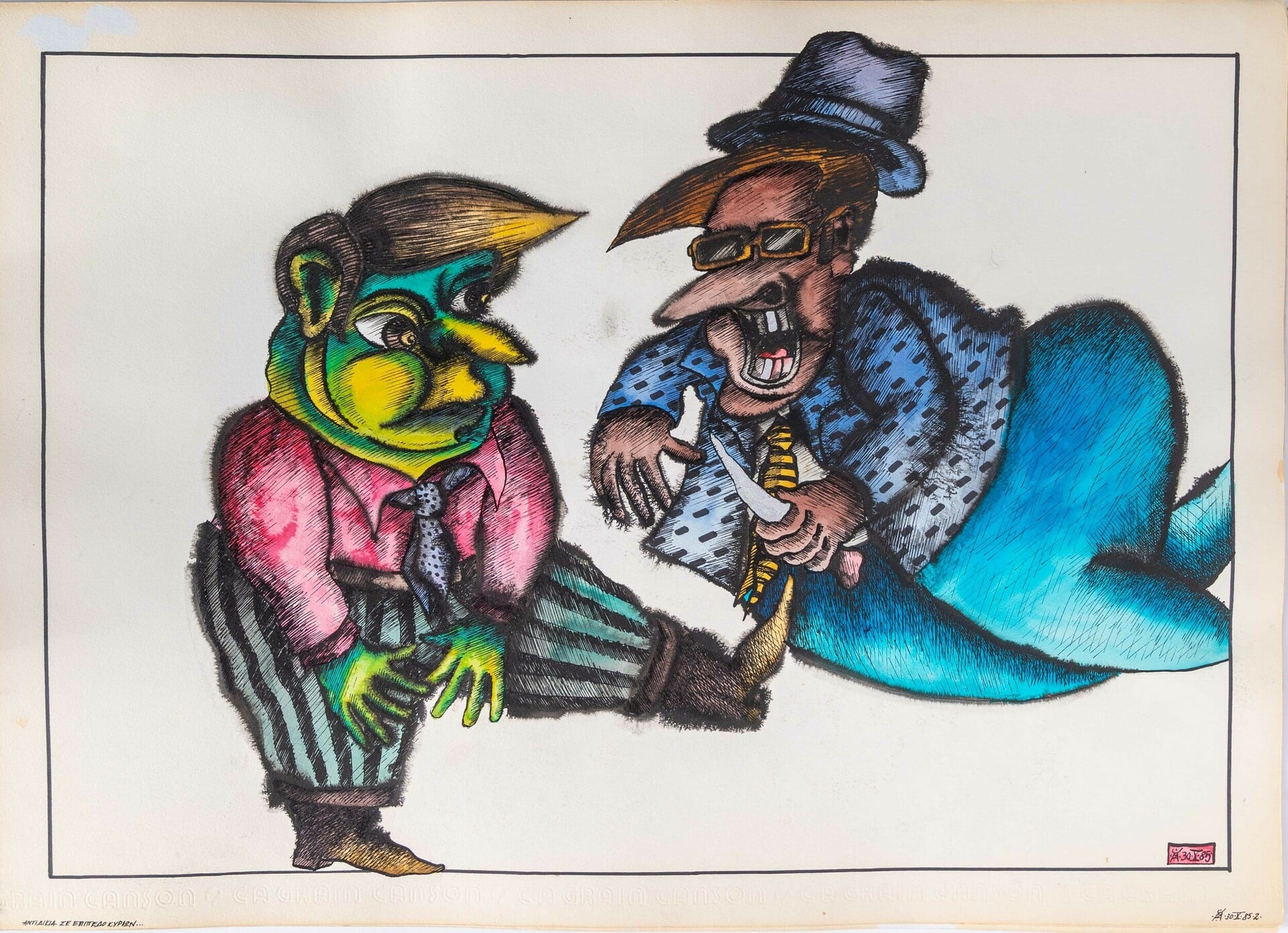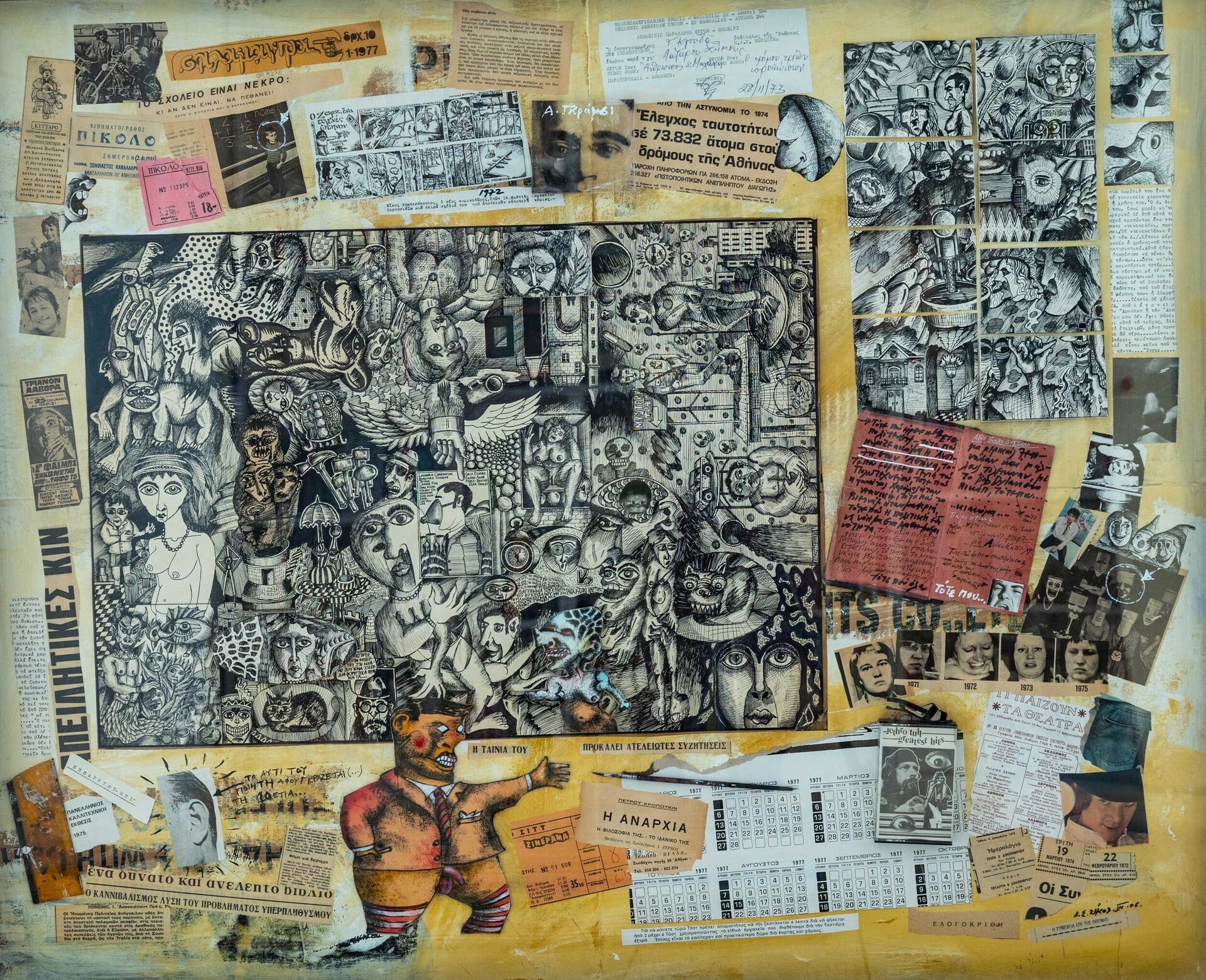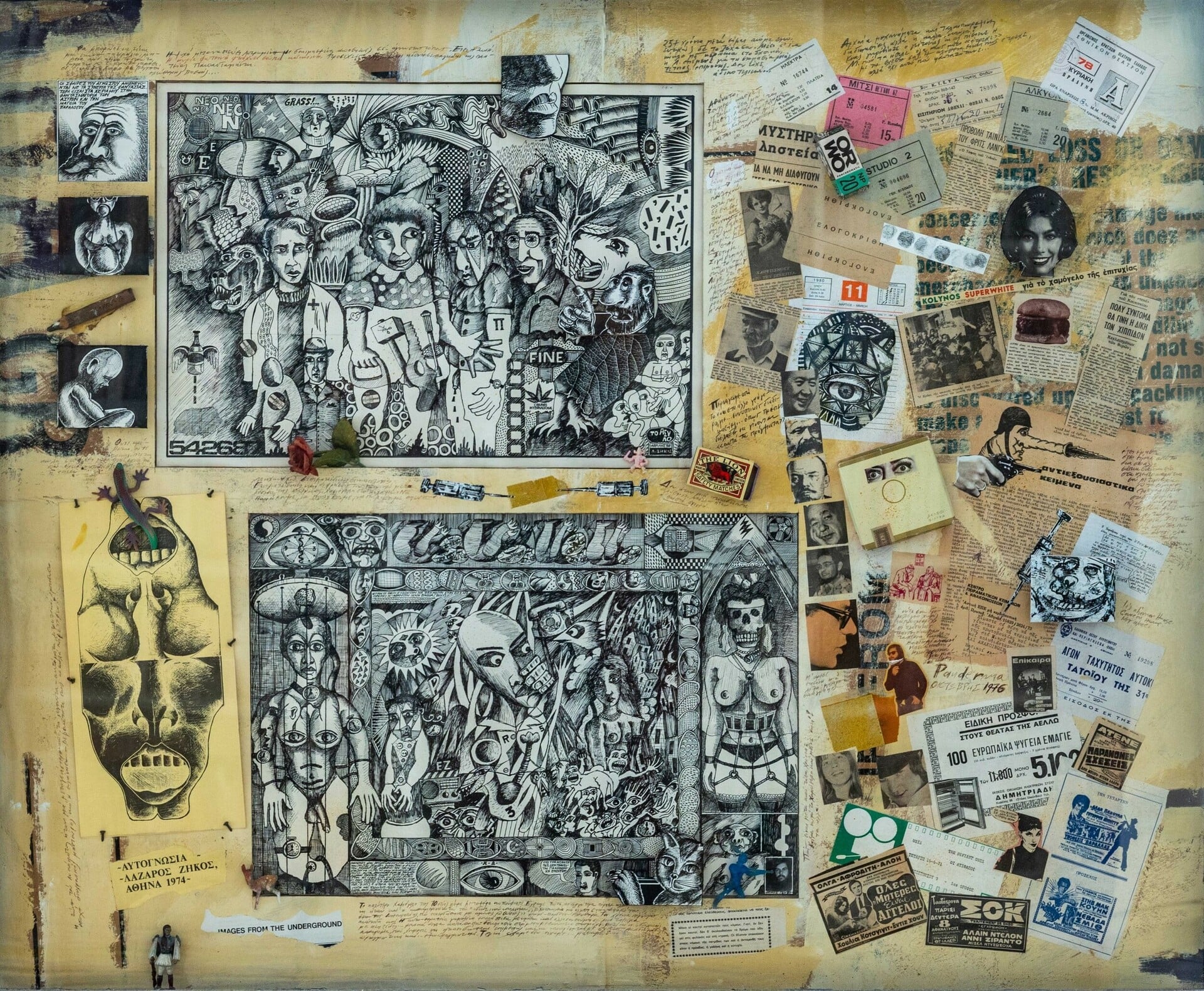 Πίνοντας συνήθως βότκα, έμαθα και για άλλες πτυχές του: τη “δράση” του ήδη από τις αρχές των ’70s σε αντεργκράουντ έντυπα, κυρίως αυτά του Λεωνίδα Χρηστάκη, όπως η “Panderma” και το “Ιδεοδρόμιο”, τις πρώιμες απόπειρές του για πειραματικά κόμικς σε βραχύβια περιοδικά όπως η “Πράσινη Γάτα” και η “Τρύπα”, τα δύο μικρά βιβλία με ιστορίες που έγραψε και τύπωσε μόνος του και άλλα πολλά. Οι “δράσεις” του με καθετί χάρτινο ήταν ασταμάτητες: παράξενα φανζίν, δίφυλλα έντυπα, κάρτες, αφισούλες… Όλα αποπνέουν την αίσθηση του χειροποίητου. Όλα περνούσαν από τα χέρια του: από την επιλογή του χαρτιού και του σχεδιασμού του κάθε εντύπου ως τα συχνά γραμμένα στο χέρι κείμενα και, τελικά, την εκτύπωση. Και βέβαια είδα τη συλλογή του –δυστυχώς, χαμένη τώρα πια– από φανζίν, αφίσες και κάθε λογής περιορισμένης κυκλοφορίας έντυπα του “χώρου”, όπως και ο ίδιος αποκαλούσε κάθε αντεργκράουντ έκφραση. Έντυπα πολιτικά, μουσικά, φεμινιστικά, κόμικς και ό,τι άλλο, φτάνει να είναι υπόγεια, να μην είναι επίσημες κυκλοφορίες.