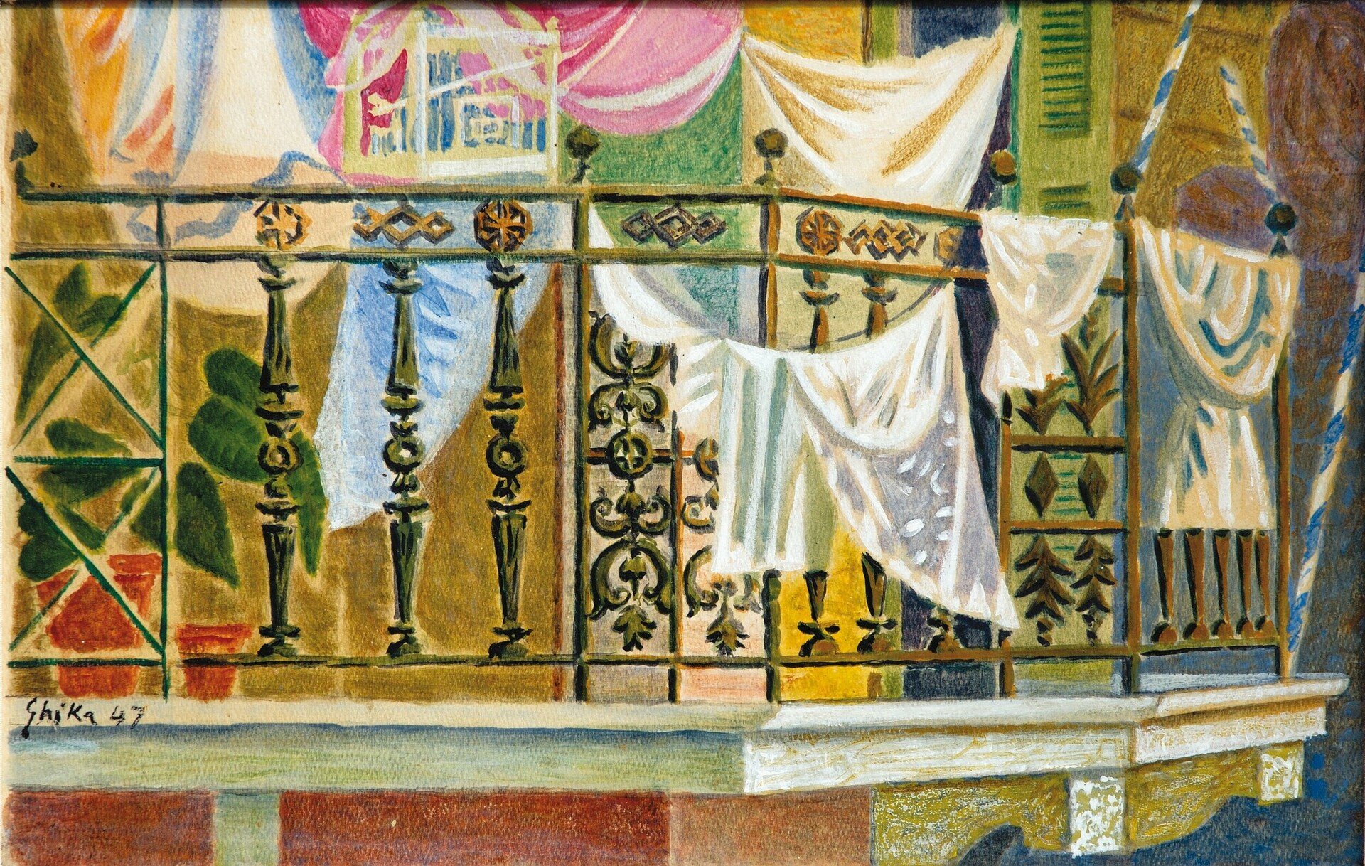Η προσέγγιση του Νίκου Χατζηκυριάκου-Γκίκα (1906-1994) βασίζεται στο επαναλαμβανόμενο και αγαπημένο του μοτίβο των απλωμένων ρούχων, που χαρακτηρίζει το έργο του από τα πρώτα του βήματα μέχρι και το τέλος, σε πιο σχηματική αναπαράσταση. Ήταν ένας μεγαλοαστός κοσμοπολίτης που μέσω αυτής της απλοϊκής θεματικής κατάφερε να συνδεθεί ως ζωγράφος με τη δική του Ελλάδα. Κι ενώ πρόκειται για έναν ζωγράφο όχι απαραίτητα ανθρωποκεντρικό, οι μπουγάδες του επιβεβαιώνουν μέσα από την απουσία την παρουσία του ανθρώπου και της καθημερινής του δραστηριότητας, η οποία εν τέλει αποτυπώνεται και αναδεικνύει τη δυναμική του ζωγράφου.