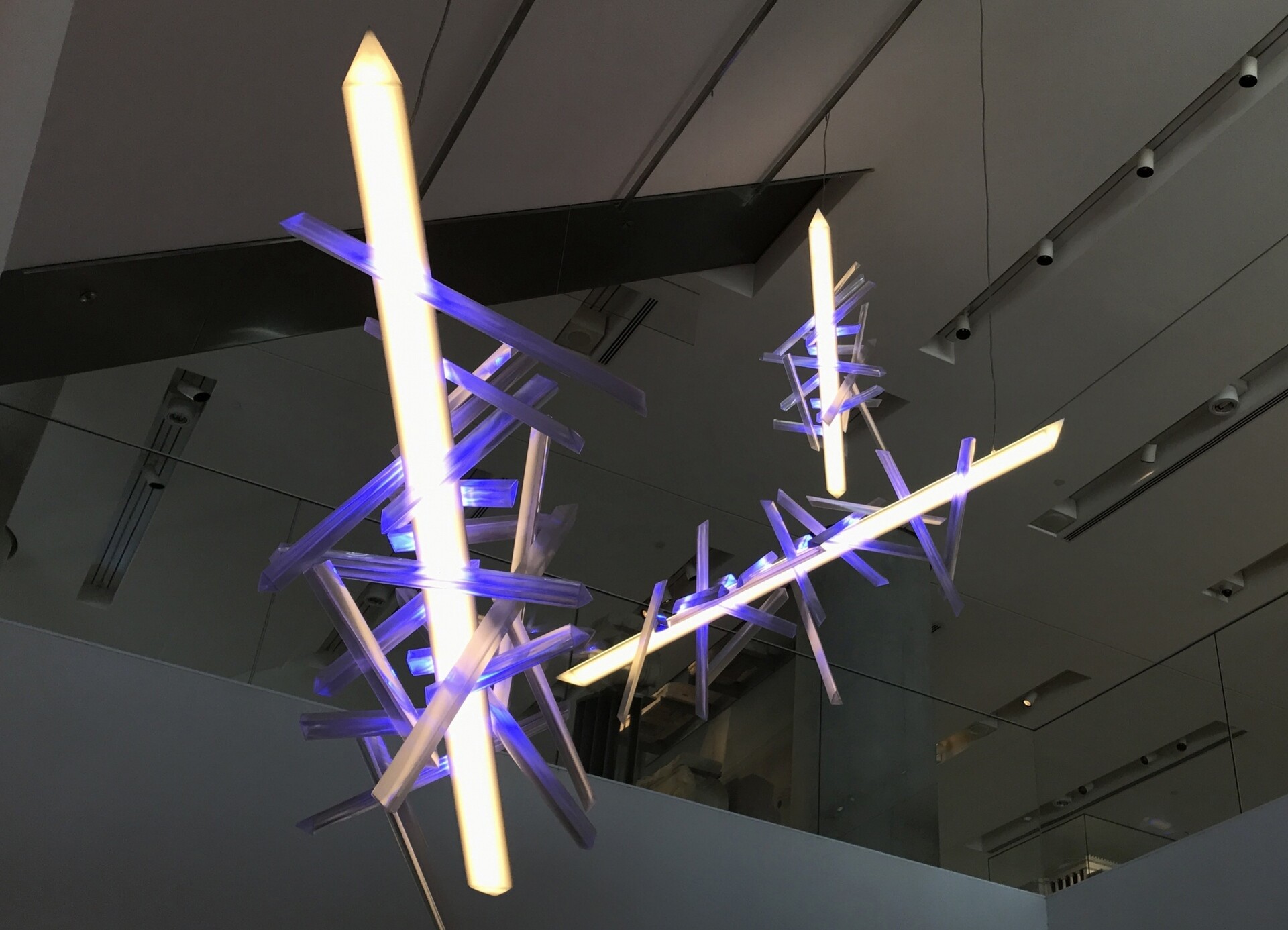 To έργο είναι μια ήρεμη σύνθεση, με ήπιες χρωματικές εναλλαγές και απλές φωτεινές ράβδους γύρω από τρεις άξονες.
