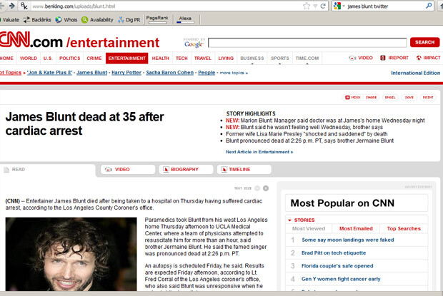 Ιστοσελίδα που αντέγραψε το lay out του σάιτ του τηλεοπτικού δικτύου CNN, πέθανε τον γνωστό ερμηνευτή Τζέιμς Μπλαντ. Η ιστοσελίδα ανέβασε σήμερα το πρωί την είδηση του θανάτου του Μπλαντ μετά από καρδιακό επεισόδιο, συνοδεύοντας την μάλιστα από ρεπορτάζ για το πώς συνέβη το μοιραίο.