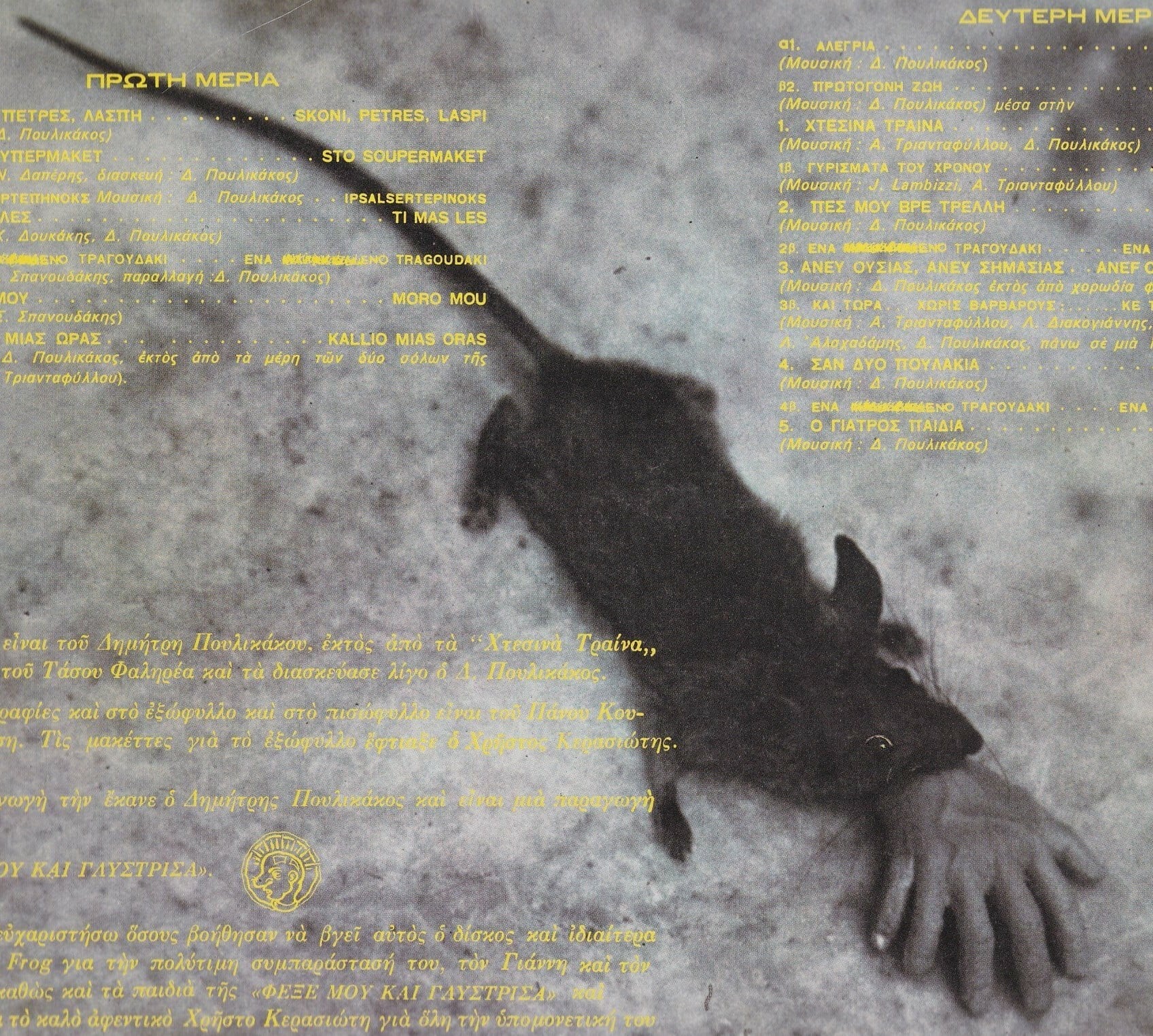Επίσης οι φωτογραφίες μπροστά και πίσω, στο εξώφυλλο του δίσκου, ανήκαν στον Πάνο Κουτρουμπούση, με τις μακέτες να τις κάνει ο Χρήστος Κερασιώτης. Μπροστά ο Κουτρουμπούσης φωτογραφίζει τον... ταλαίπωρο Πουλικάκο κάπου γύρω από το Νοσοκομείο Ευαγγελισμός (μάλλον από την μεριά της Ι. Διαμαντή Πατέρα), με το σήμα κινδύνου των πυρηνικών αριστερά, ενώ στο back cover ένα ποντίκι τρώει κάτι σαν... λείψανο εξαδάκτυλης παλάμης – μακάβρια και λίγο γκραν γκινιόλ φάση, που παρέπεμπε βέβαια και στο συγκρότημα Εξαδάκτυλος.