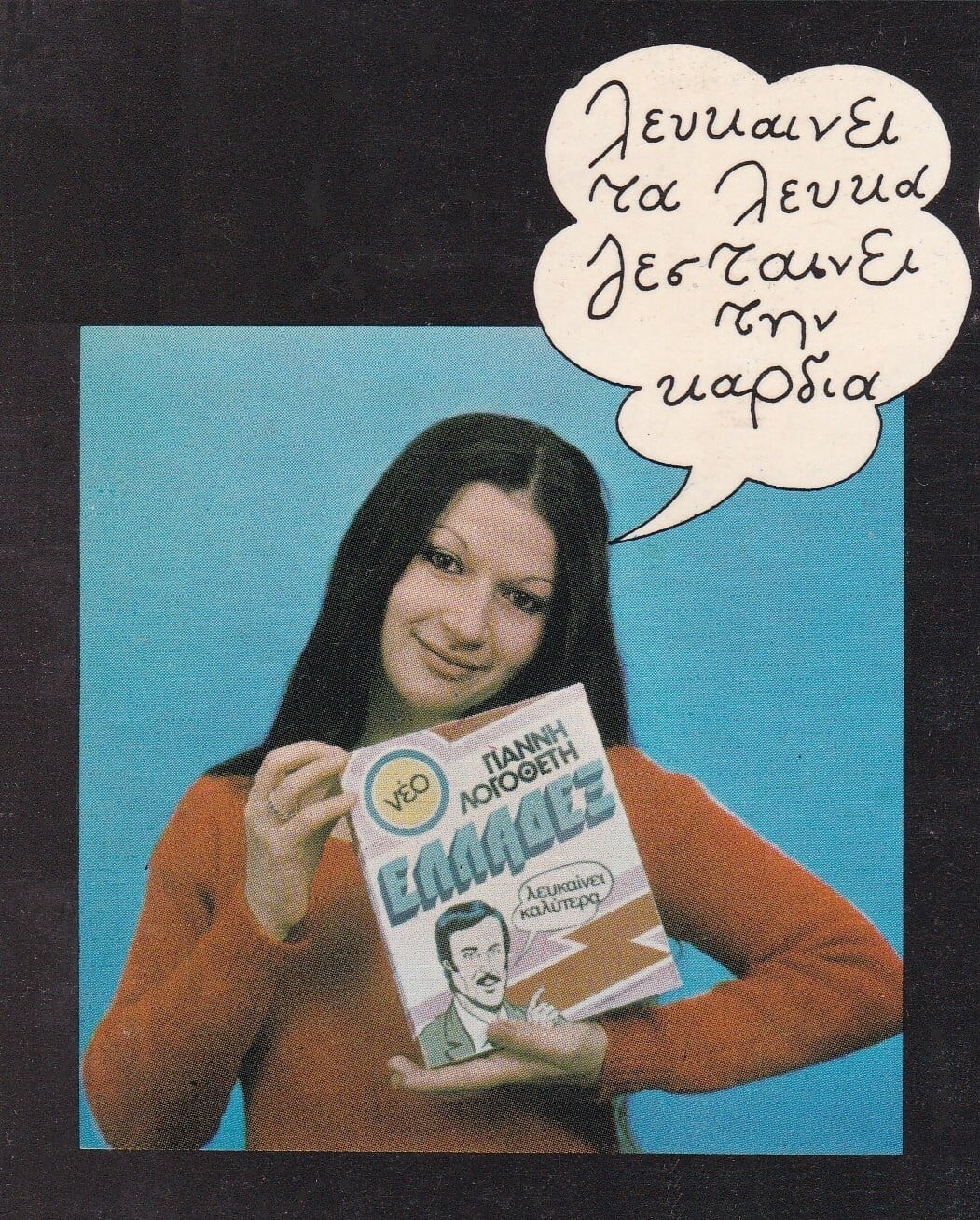 Πριν περάσω στα τραγούδια του δίσκου, πρέπει να ειπωθούν μερικά λόγια για τον τίτλο και για το εξώφυλλο. Κατ’ αρχάς τι σημαίνει «Ελλαδέξ»; Είναι το «νέο» απορρυπαντικό, που «λευκαίνει καλύτερα», όπως διαβάζουμε στο cover. Είναι, με άλλα λόγια, αυτό το κουτί που βλέπουμε, και το οποίο ήταν κατασκευασμένο από τον Δημήτρη Θ. Αρβανίτη (που είχε και τη γενικότερη επιμέλεια του εξωφύλλου). Φυσικά η έμπνευση είχε τη βάση της στα ανάλογα εμπορικά απορρυπαντικά της εποχής (OMO, Roll και κυρίως το Πλυντηρέξ), με το κουτί να έχει μιαν αδιαφιλονίκητη pop art αισθητική. Όμως, γιατί «Ελλαδέξ»; Αυτό είναι ακόμη πιο κρίσιμο...