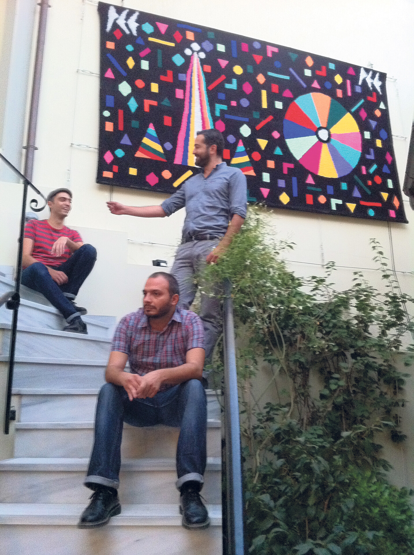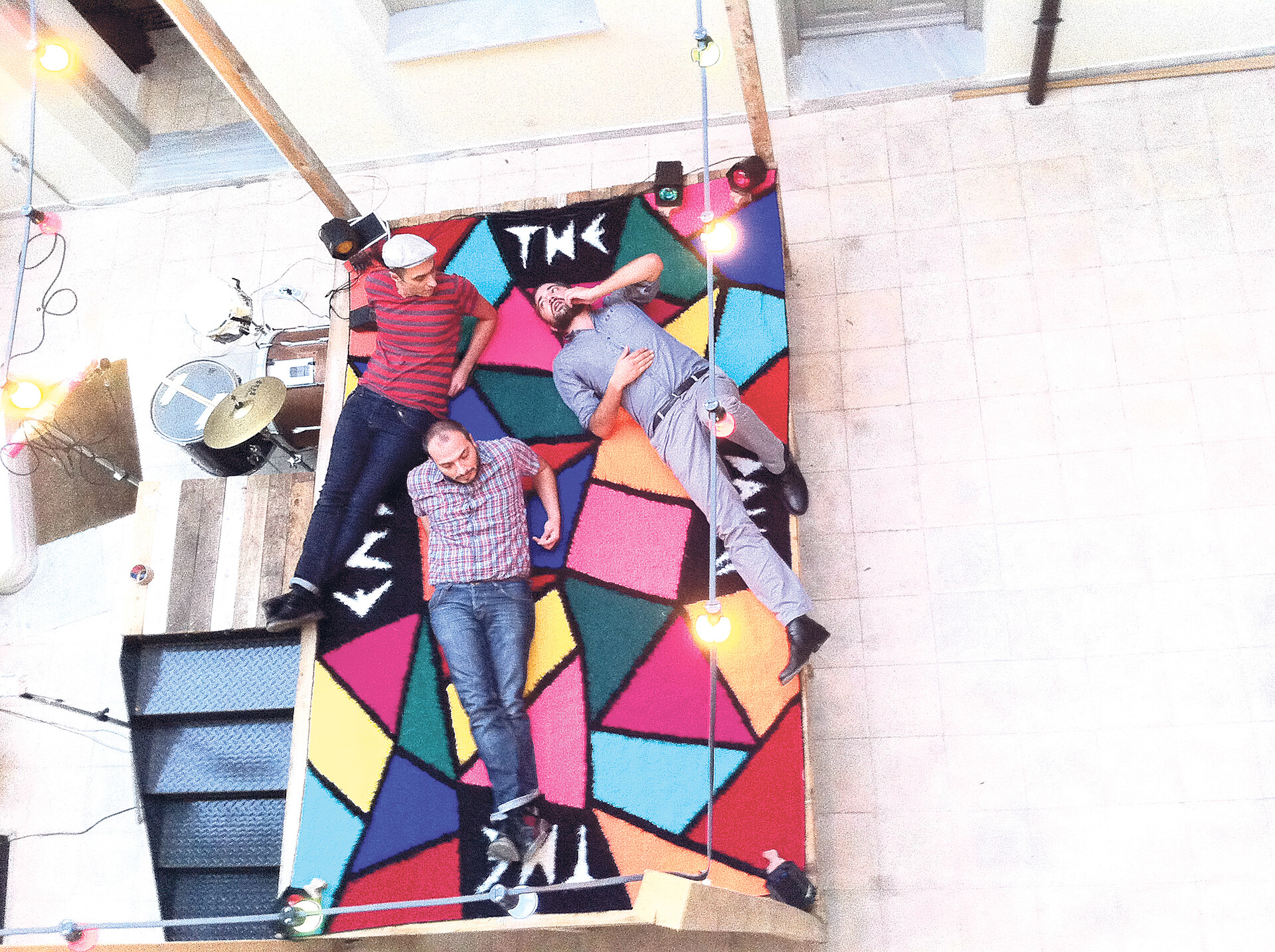 Μπαίνω στο κτίριο της Atopos στη Σαλαμίνος, στο Μεταξουργείο, έχοντας στο μυαλό μου το κολλητικό ριφάκι του «Against the day» απ’ τον τελευταίο δίσκο («Objekt») των Callas. Οι Callas στέκονται κάτω απ’ τη -στρωμένη με αυτά τα πολύχρωμα χειροποίητα πλεκτά τους- σκηνή με τα λαμπάκια περιμετρικά της σκαλωσιάς, που θυμίζουν πανηγύρι σε κάποιο χωριό έξω απ’ την Κοζάνη.