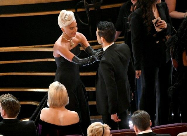 Λίγο αργότερα, η Lady Gaga βοήθησε τον Ράμι Μάλεκ με τη γραβάτα του, κατά τη διάρκεια ενός ακόμη διαφημιστικού διαλείμματος, λίγο πριν την βράβευση του Αμερικανού ηθοποιού με το Όσκαρ Α' Ανδρικού ρόλου. Ευτυχώς αυτό το στιγμιότυπο το πρόλαβαν οι κάμερες.
