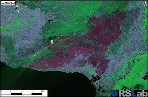 Στους χάρτες που ακολουθούν αποτυπώνεται η καμένη έκταση, η εικόνα της περιοχής πριν ξεσπάσει η πυρκαγιά, αλλά και η πρόσφατη εικόνα της μετά το πέρασμά της. Δίνονται επίσης οι χάρτες στην φασματική περιοχή του κοντινού υπέρυθρου (NIR), όπου με έντονο πράσινο διακρίνεται η βλάστηση που υπήρχε στην περιοχή πριν γίνει στάχτη, και οι χάρτες στην φασματική περιοχή του υπέρυθρου μικρού μήκους κύματος (SWIR) όπου με έντονο κόκκινο εμφανίζονται οι ενεργές εστίες.